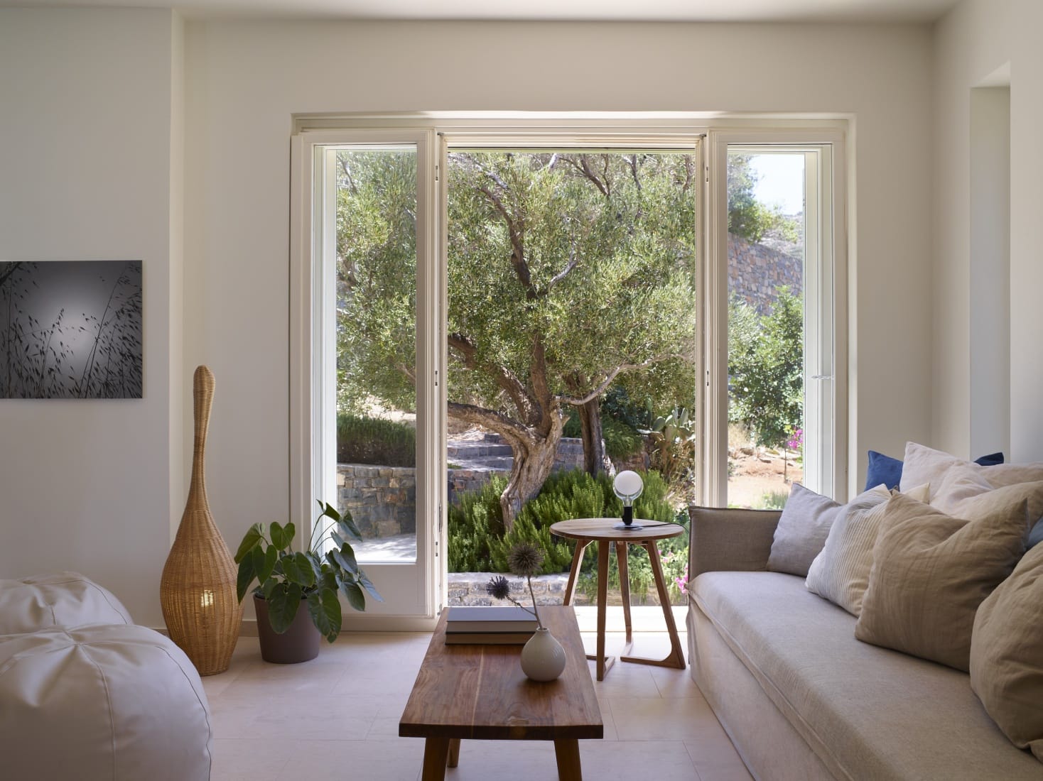 Situated on a gentle hillside overlooking the sea, on the beautiful island of Crete, the stunning Villa Minos, is surrounded by handmade stone walls containing mature gardens with numerous olive trees, and a Mediterranean plantation.