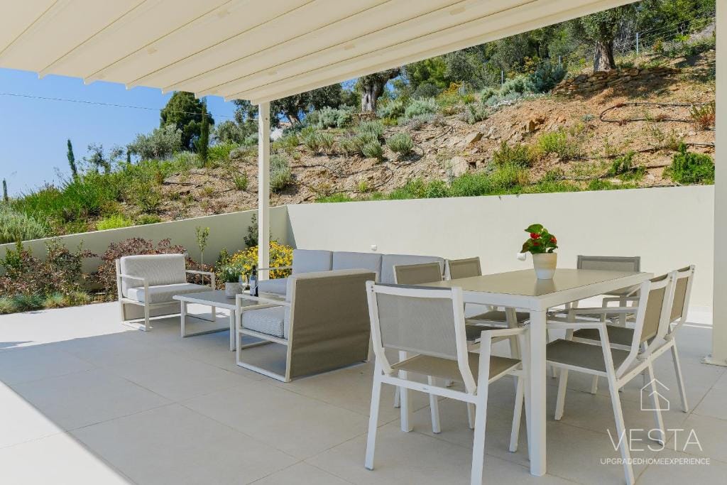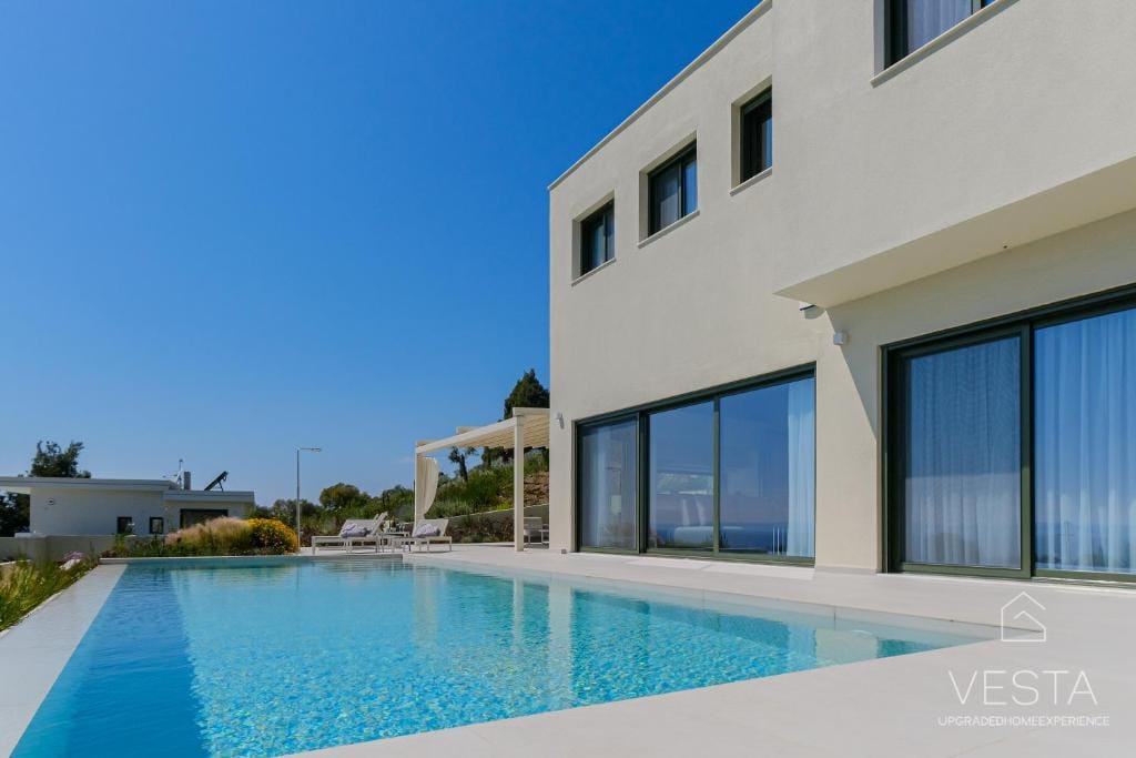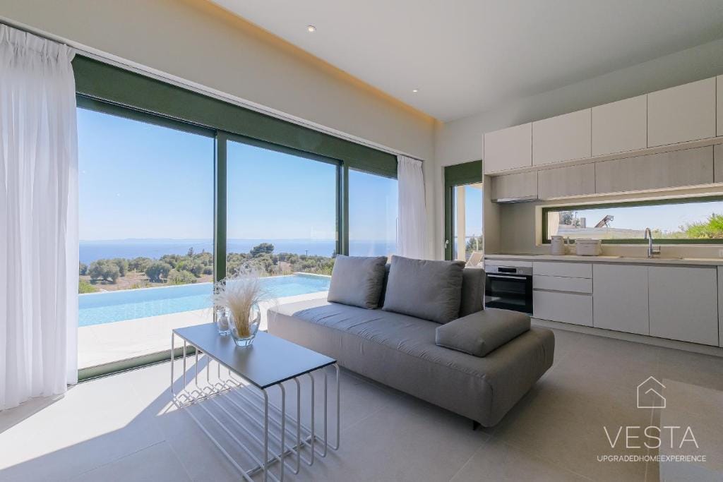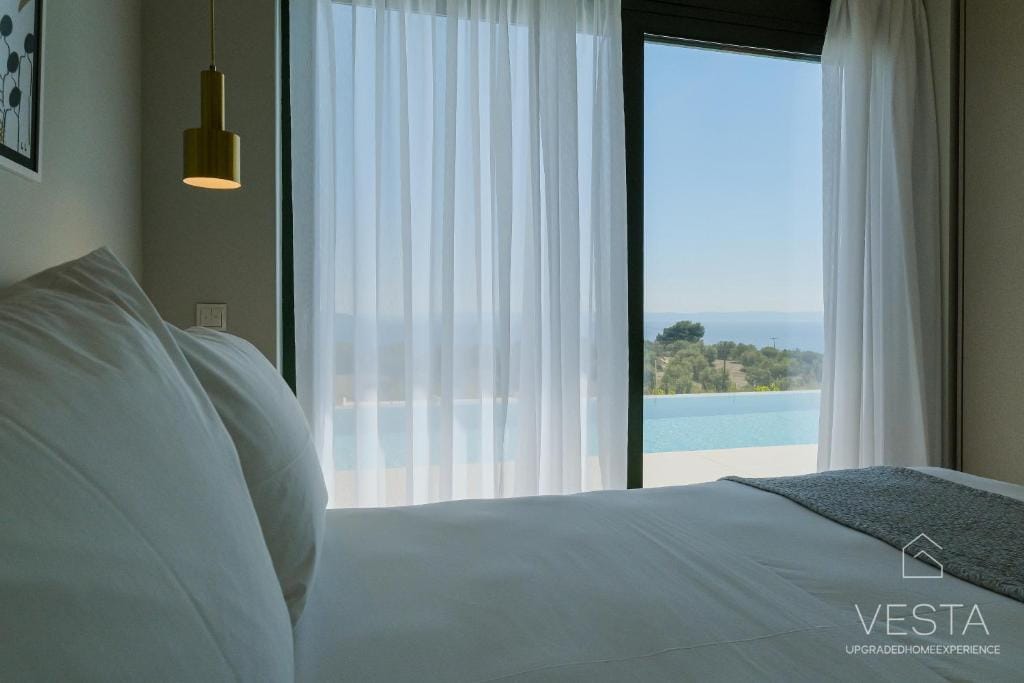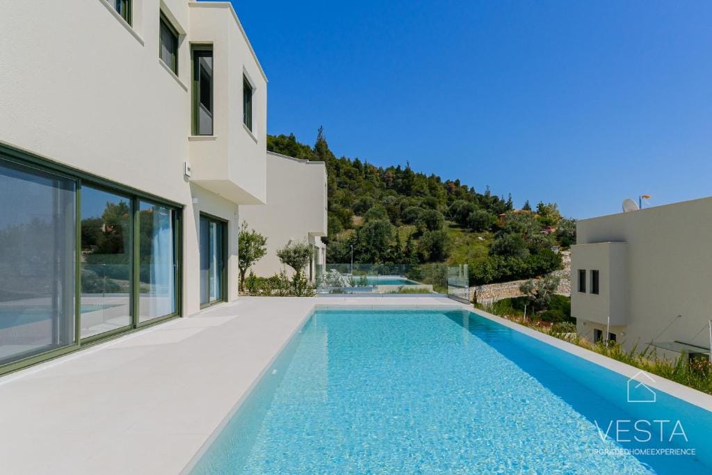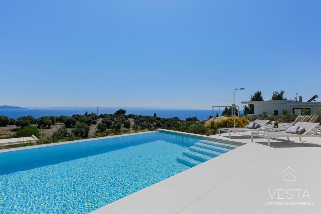 Nestled on a peaceful hillside, Olive Grove Villa 3 is a newly built, luxurious retreat designed for travelers seeking privacy, comfort, and breathtaking scenery. Surrounded by lush olive groves and pine forests, the villa offers unobstructed views of the Aegean Sea, creating an idyllic setting for relaxation. With a private infinity pool (40 sqm) and a sprawling 400 sqm garden, this executive villa blends modern elegance with natural beauty, making it an ideal choice for couples, families, or small groups.