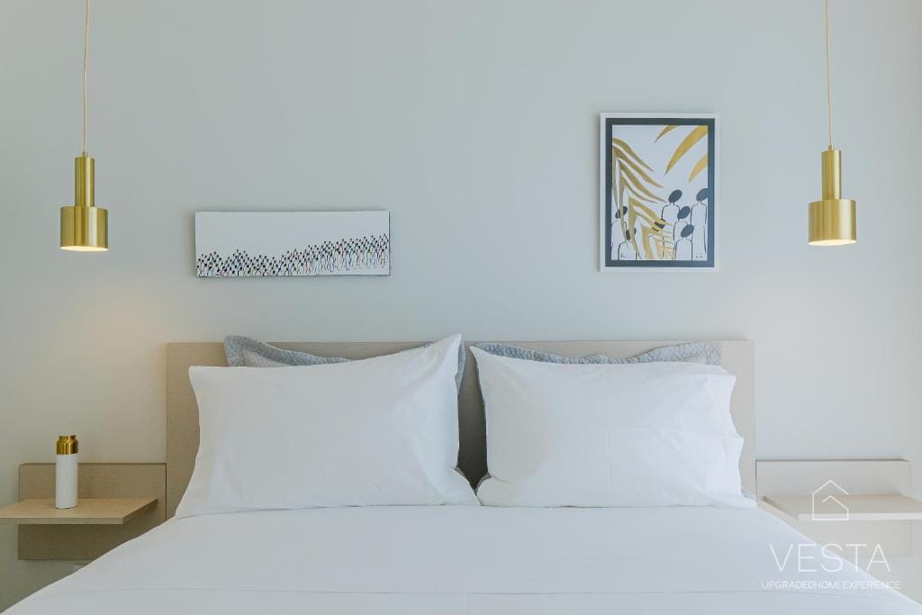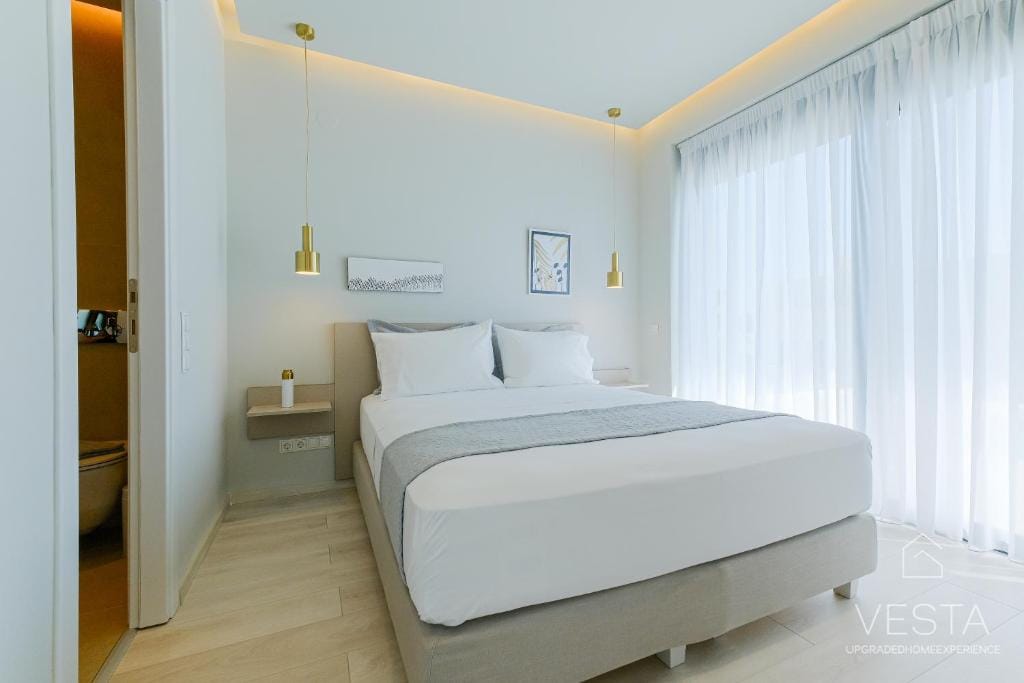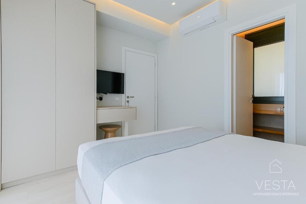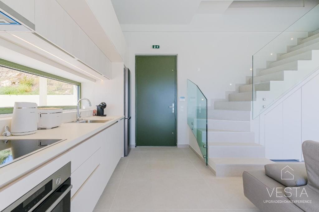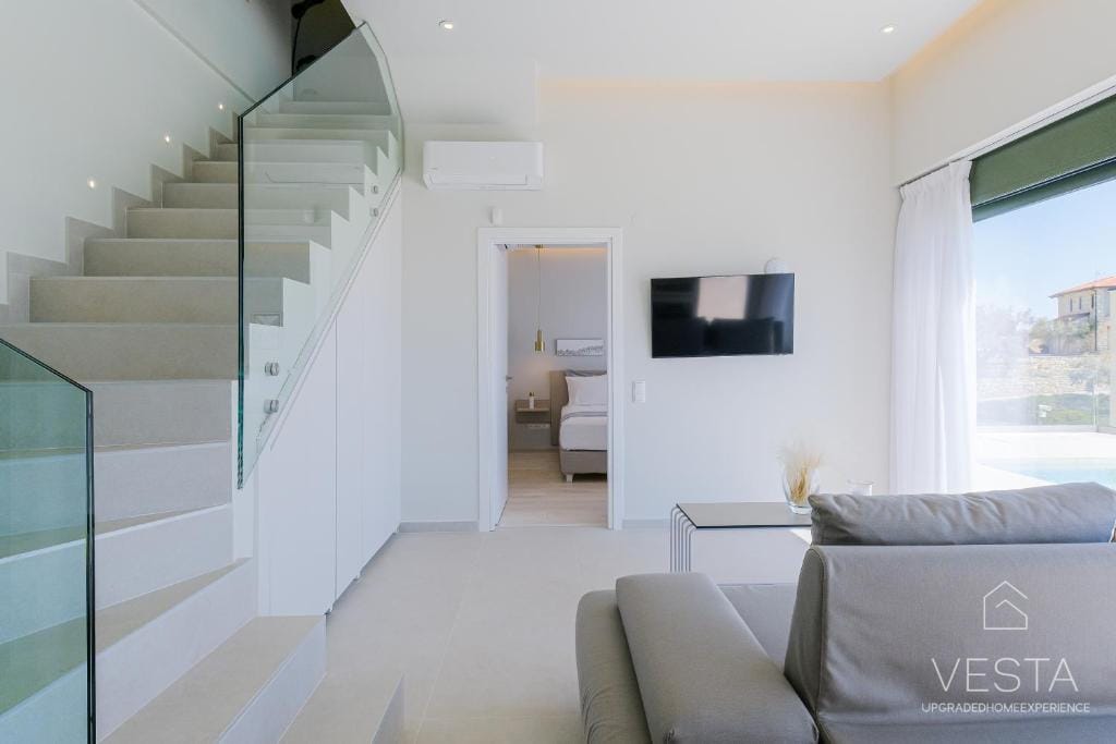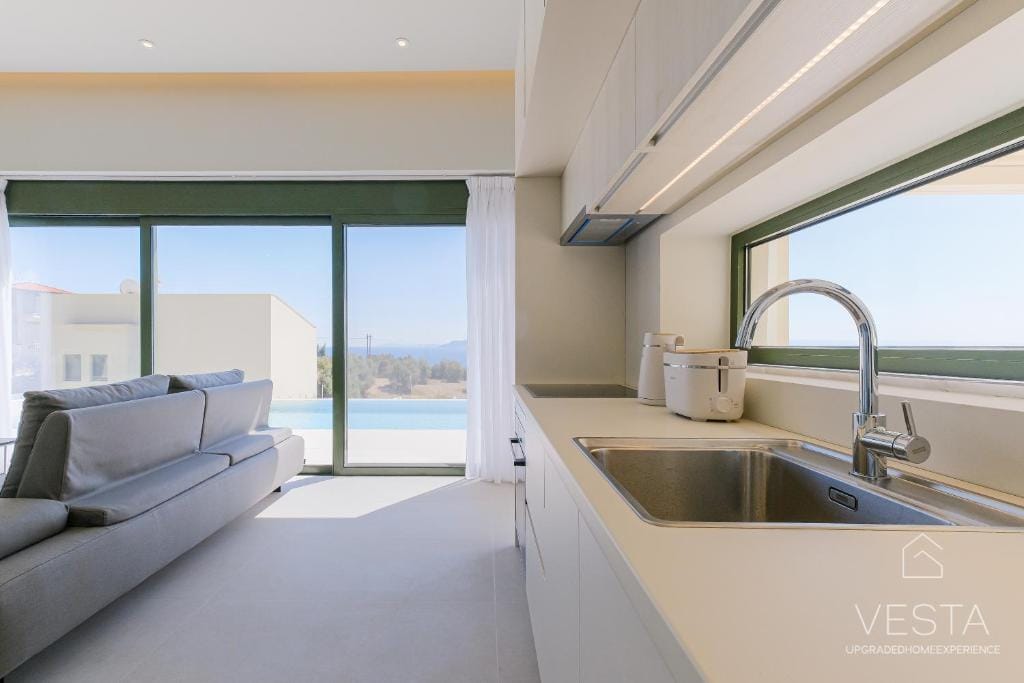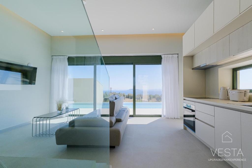 Spanning 100 sqm across two levels, the villa features a contemporary minimalist design, incorporating soft neutral tones, clean lines, and expansive windows that flood the interiors with natural light. The ground floor consists of an open-plan living area, a fully equipped modern kitchen, and one en-suite bedroom, offering a seamless connection between indoor and outdoor spaces. The living room includes a comfortable sofa, a 43” Smart TV (Netflix & YouTube), and air conditioning, while the glass doors open onto a terrace with an infinity pool, six sunbeds, and a shaded outdoor dining area under a 30 sqm pergola. The kitchen is fully equipped with a stovetop, oven, dishwasher, refrigerator, espresso machine, toaster, kettle, and complete kitchenware, ensuring guests have everything they need for a comfortable stay.