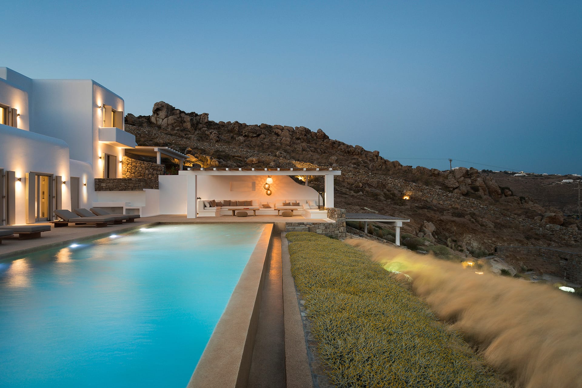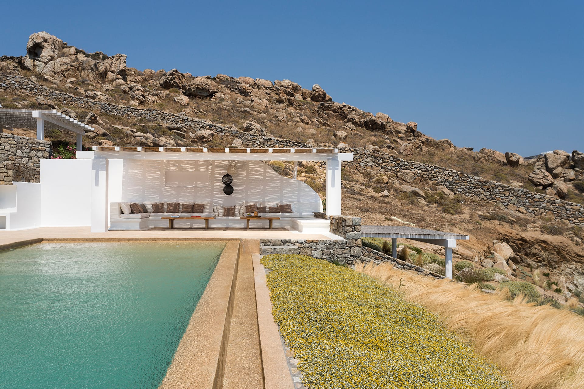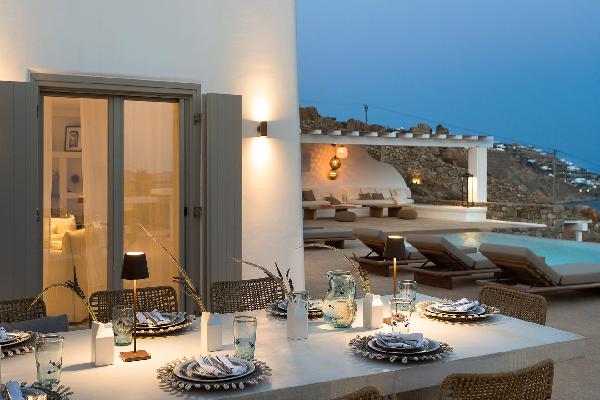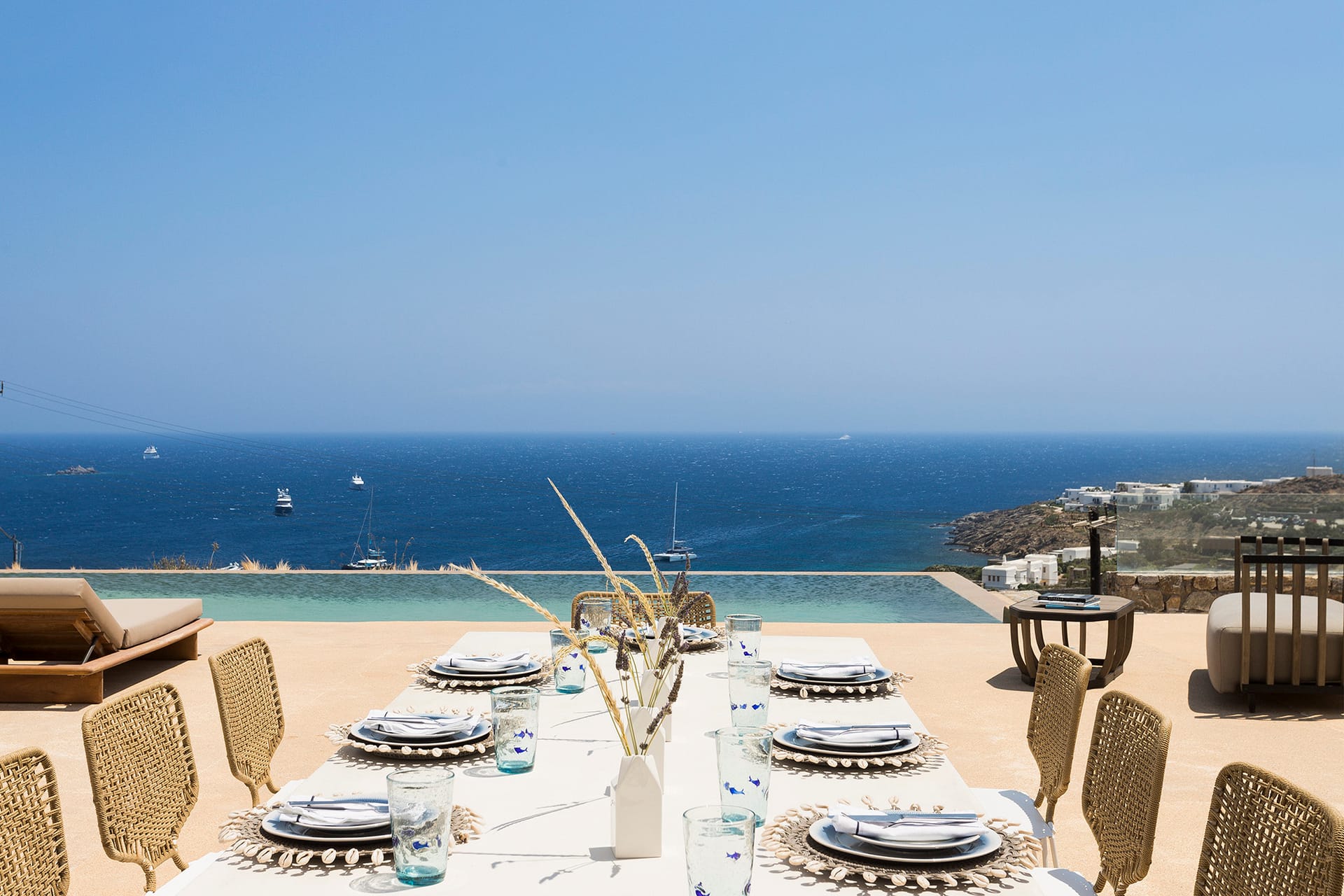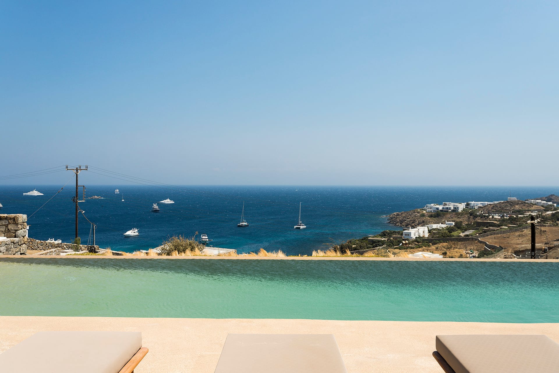 This elegant 600 sqm property, surrounded by shadowed lounge areas, comprises an infinity pool, a private gym and 10 beautifully decorated bedrooms. It is a true gem for families or large groups of friends who are seeking privacy moments, while staying a few minutes away from the Chora of Mykonos.