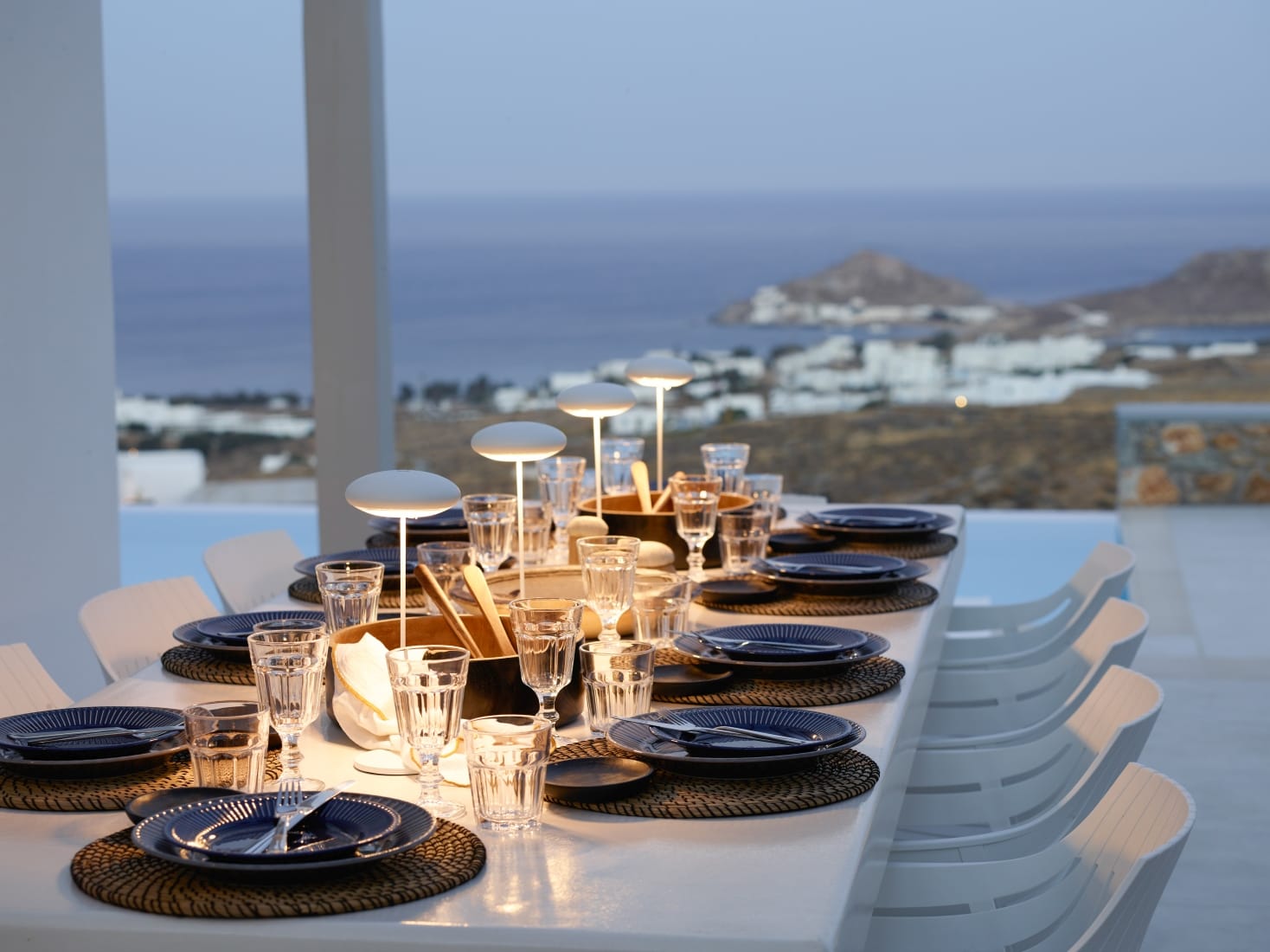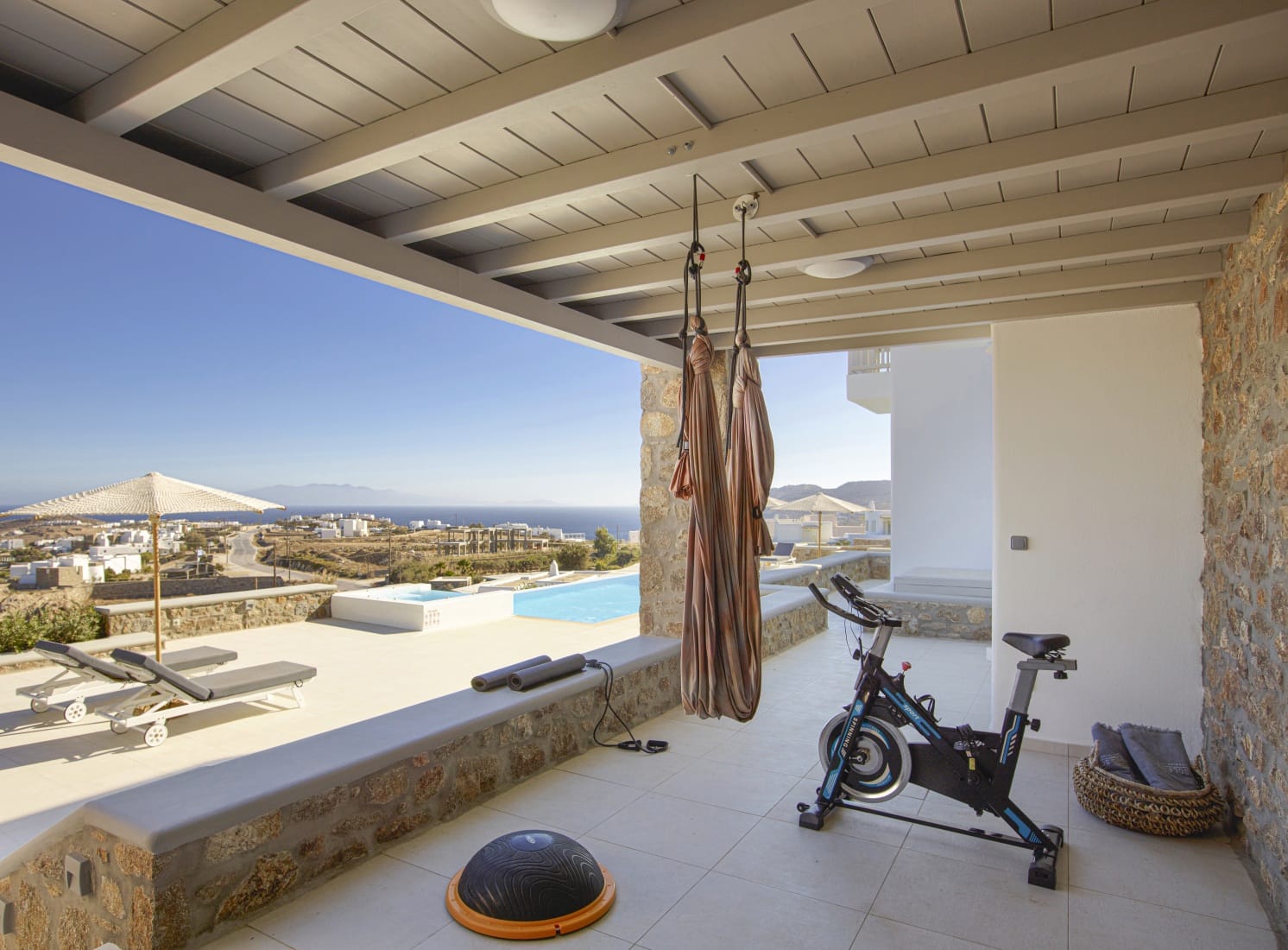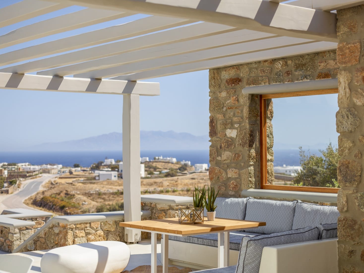 The outdoor spaces are perfect for a relaxing day and treasurable summer moments, enjoying night views with the glow of the pool lights, and eventful gatherings in the outdoor dining area (can sit up to 10 guests) with BBQ facing the magnificent blue of the Aegean Sea.