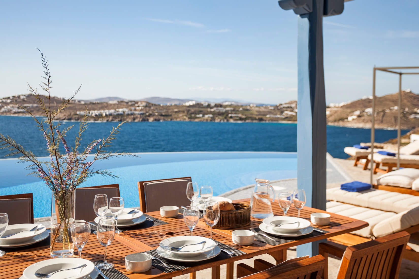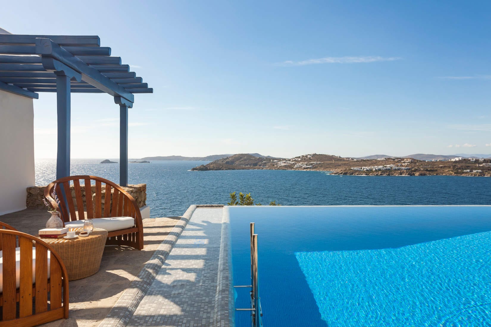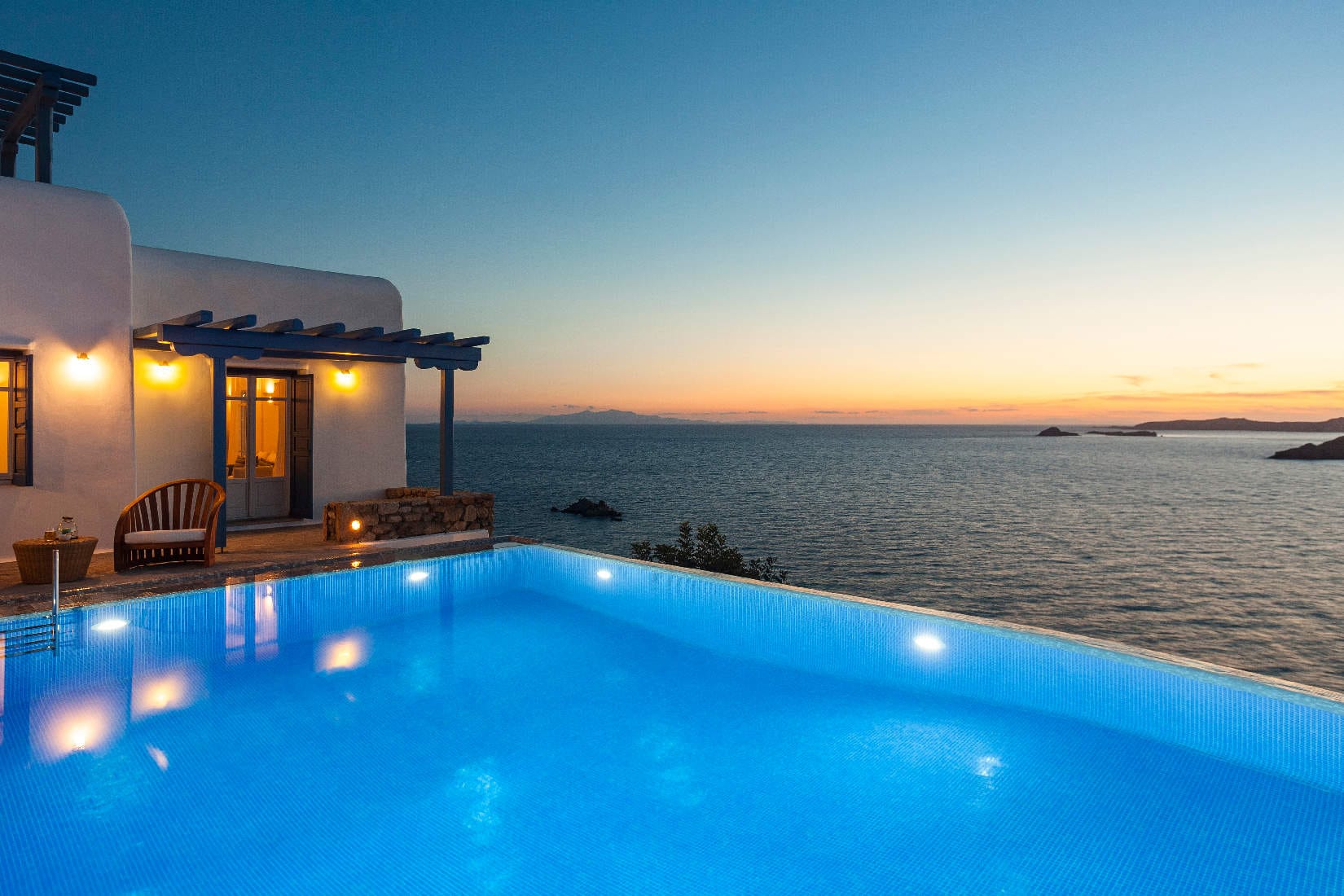 The villa is designed with tasteful decorations, that reflect the Mykonian elegance and includes a 82 m2 infinity pool that flows off into the Aegean Sea.
