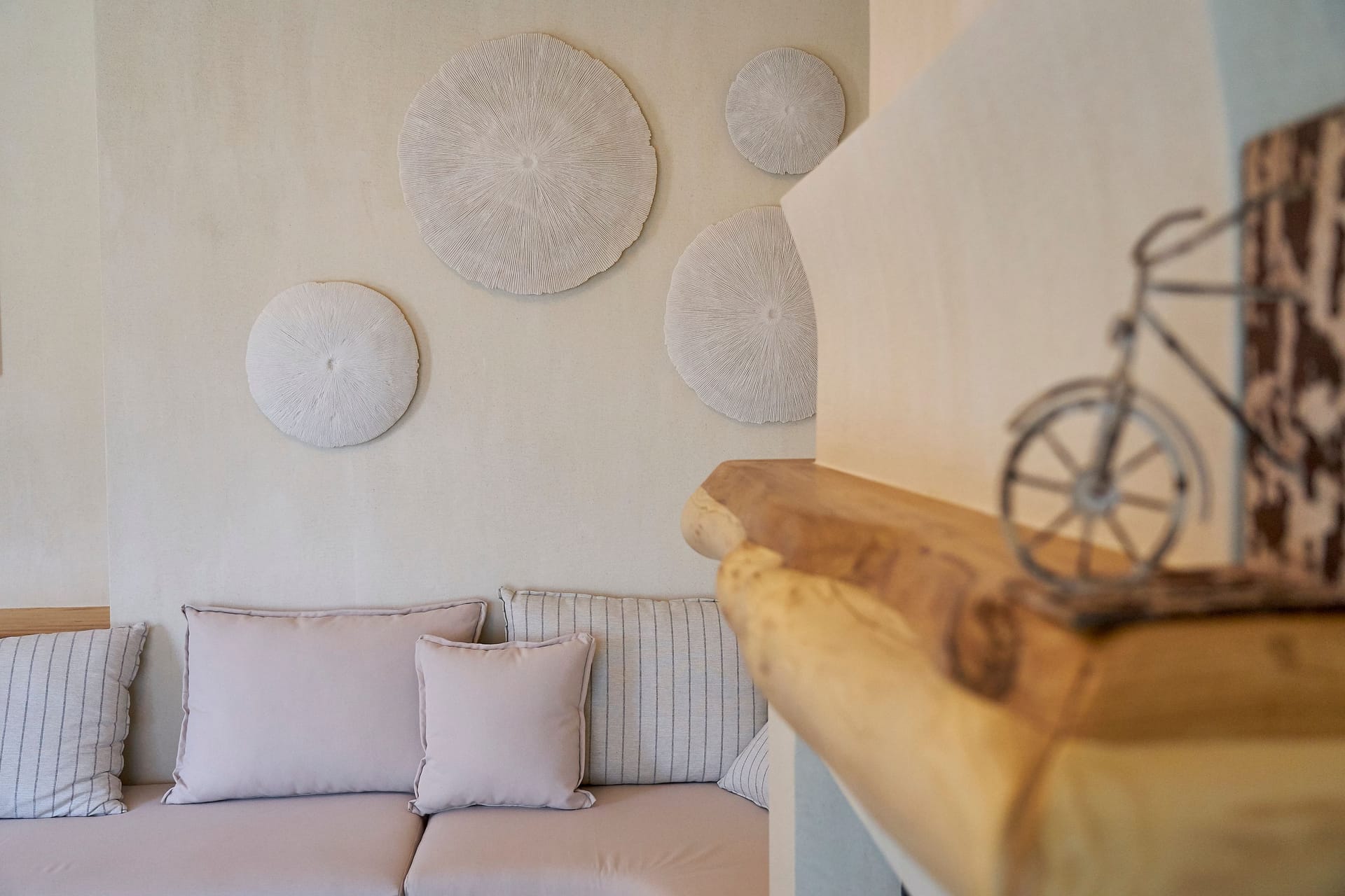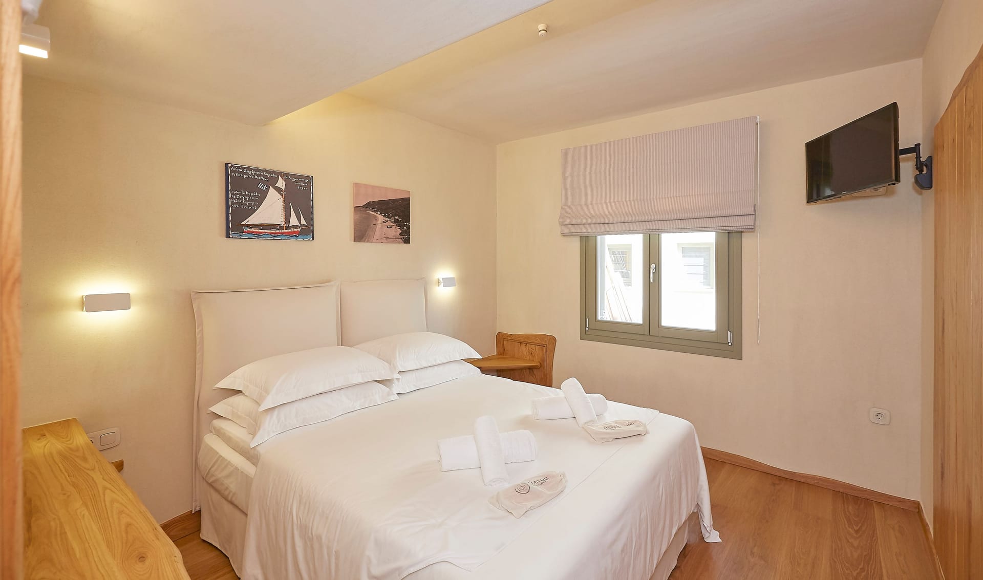 On the Upper Level, there are two more Queen-sized ensuite bedrooms boasting uninterrupted sea views over the Aegean Sea through a window and a balcony door, direct access to a private balcony, and panoramic sea views from the bed.