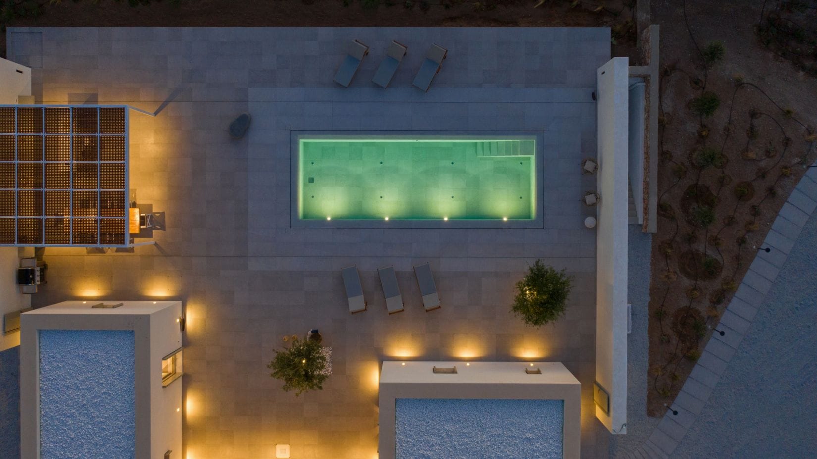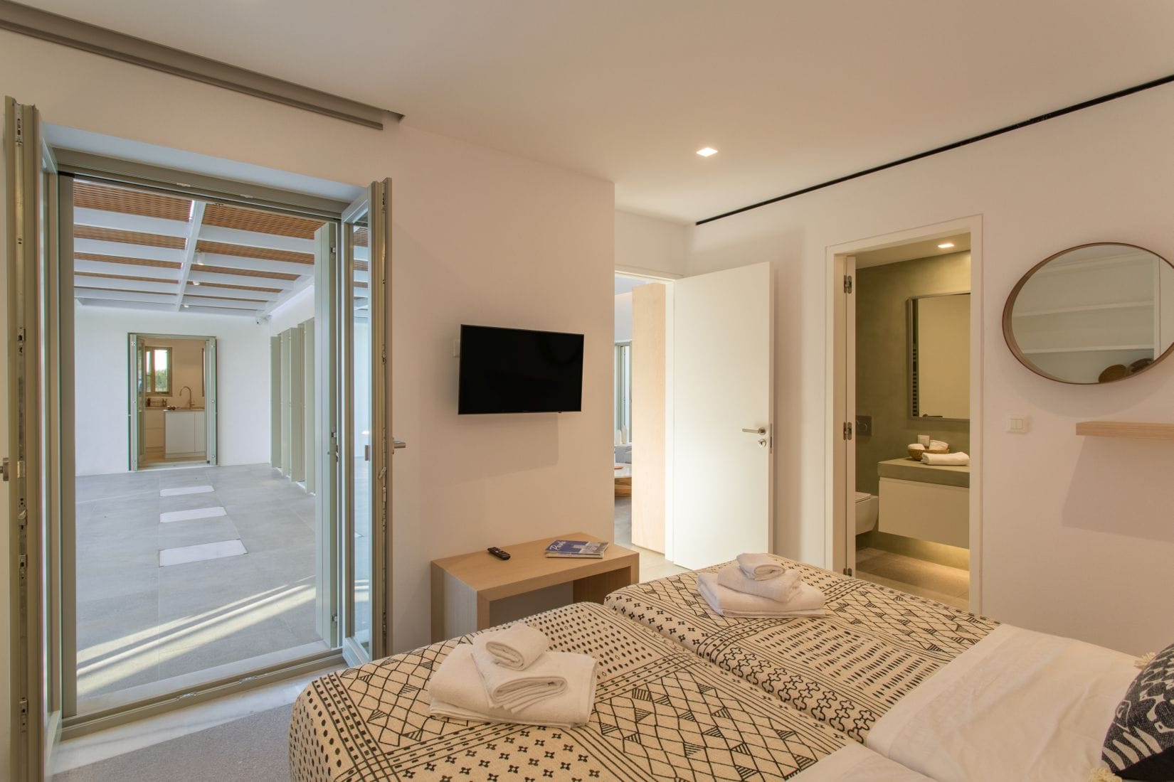 The villa is arranged around a central courtyard, offering stunning views of an ancient olive grove and the picturesque hills of Paros. With 5 spacious bedrooms, Villa Olivia is perfect for families or groups of friends. Two of the bedrooms feature single beds that can be joined together, making them ideal for families with children. Each bedroom is a private haven, equipped with its own ensuite bathroom, independent climate control, minibar, TV, and safe. With separate entrances and keys for each room, the villa provides a high level of privacy and independence, making it the perfect choice for all types of visitors.