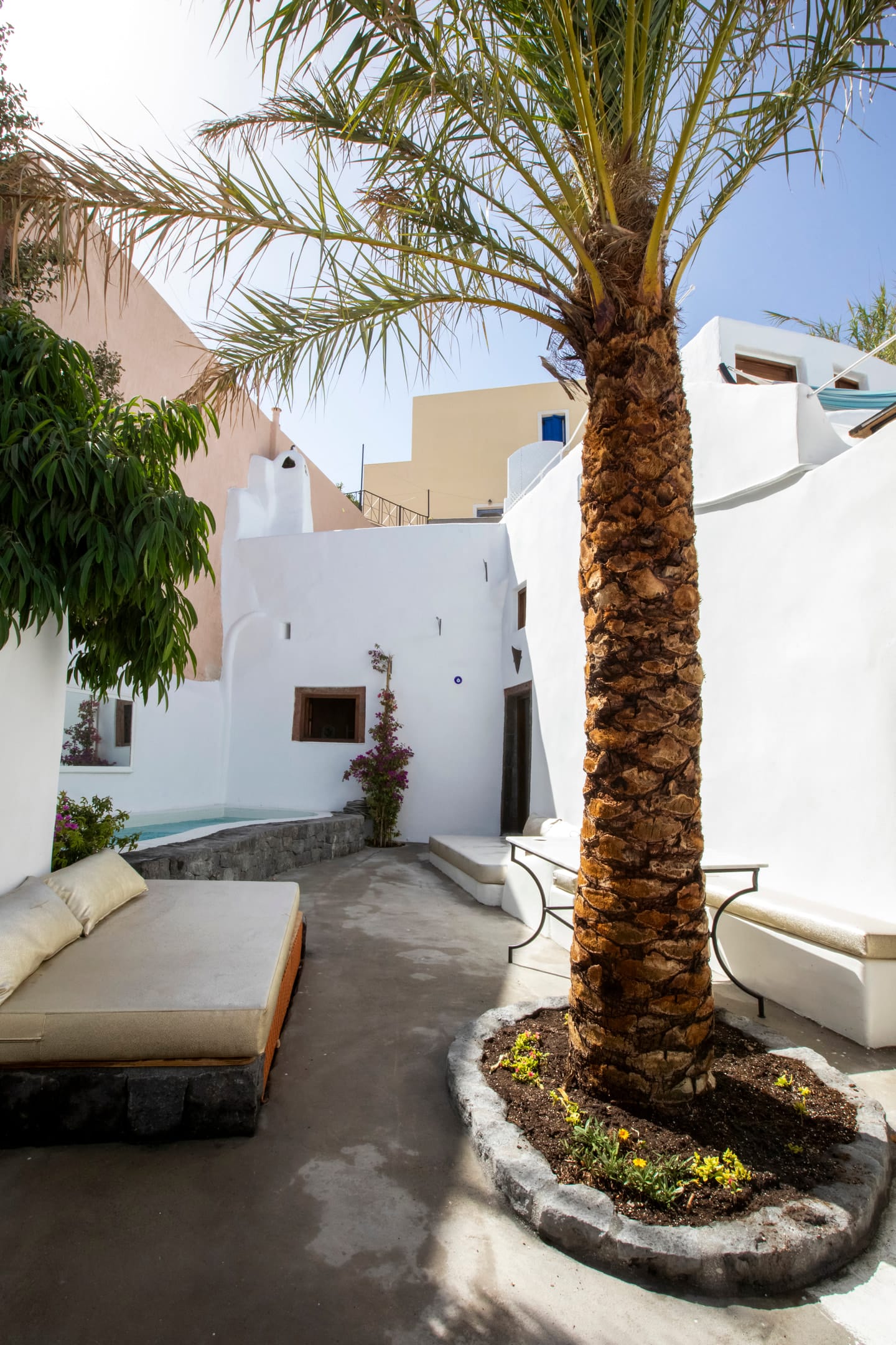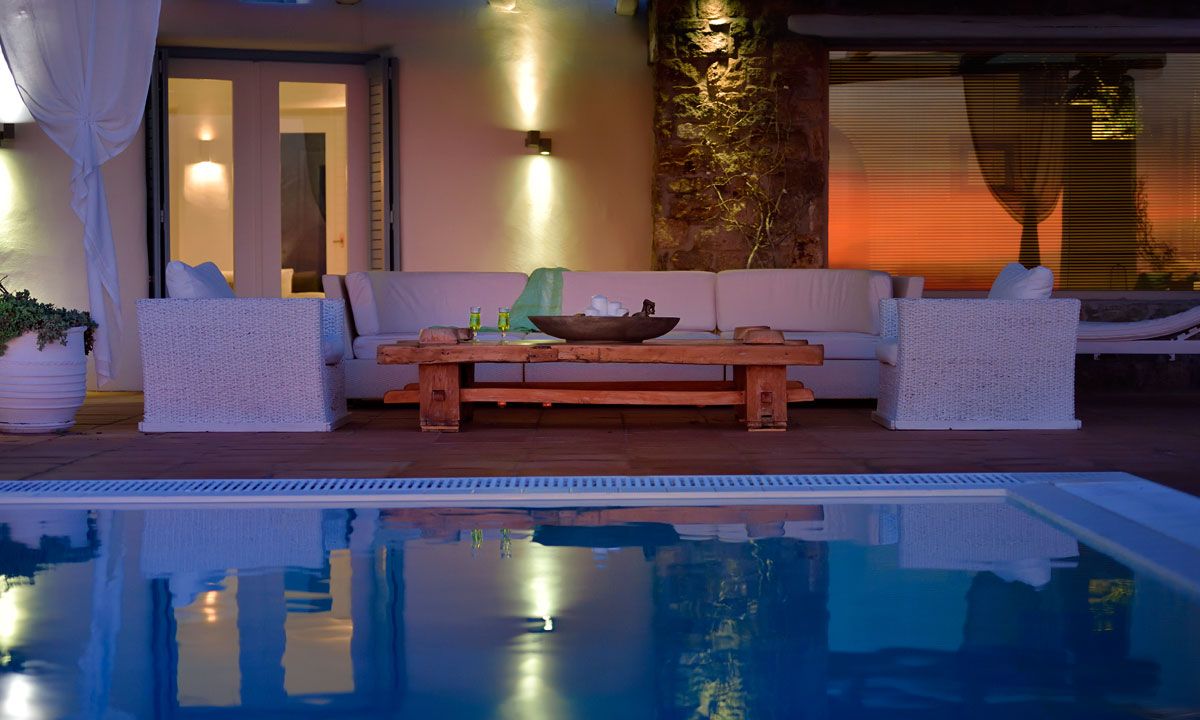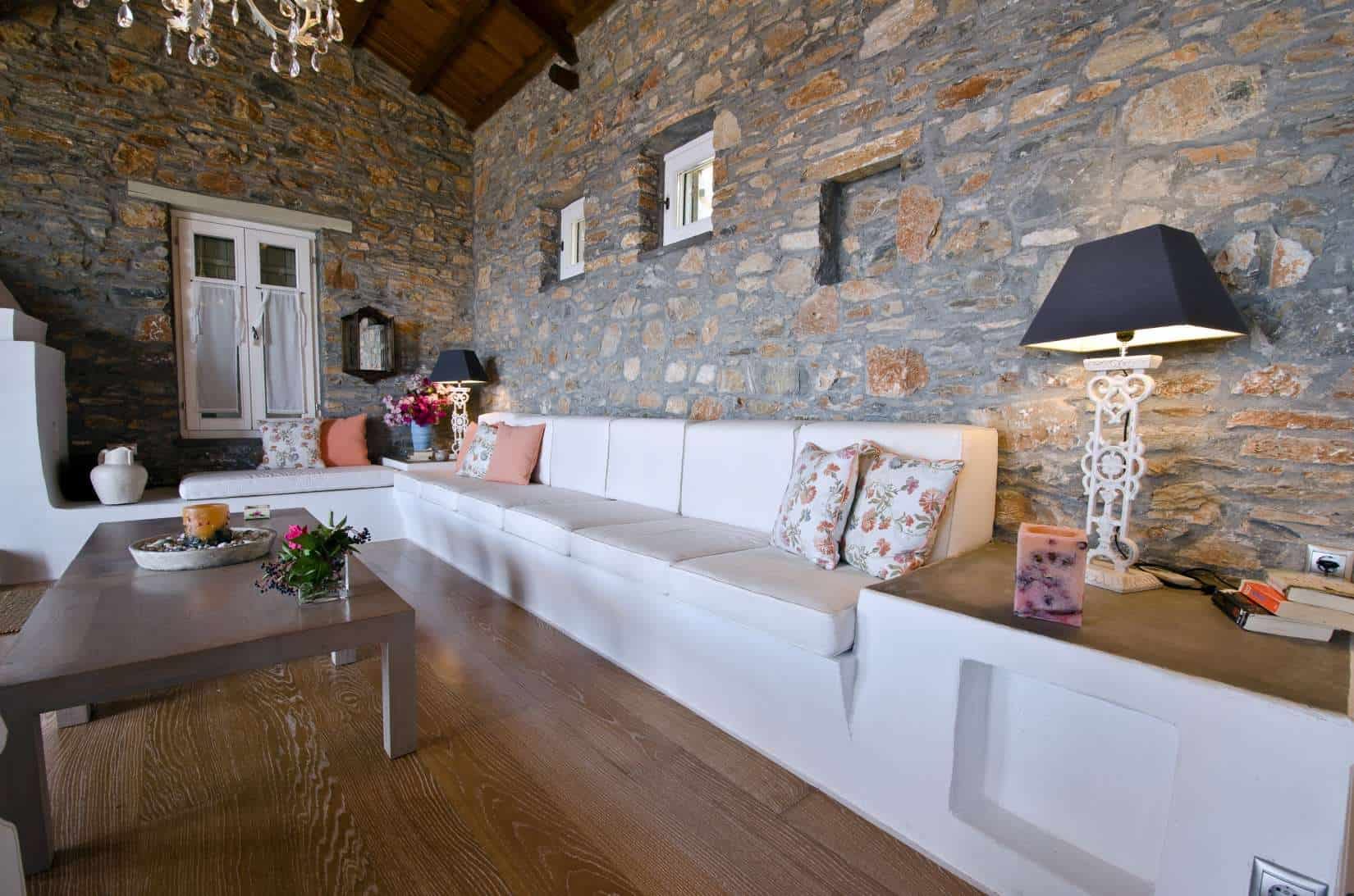 Villa Cybele is part of a 4,000 sq. m. complex consisting of two independent pool villas Villa Cybele (130sq.m.) and (Villa Selene – 70sq.m.). The basic material which was used for the construction of the villa is local stone. Oak floors are used for the interior spaces, while for bathrooms and kitchens a cement- based mortar is used- occasionally colored- using once again old traditional techniques. All interior and exterior spaces are fully furnished, and it is worth noticing that most of the furniture is once again hand made by local carpenters