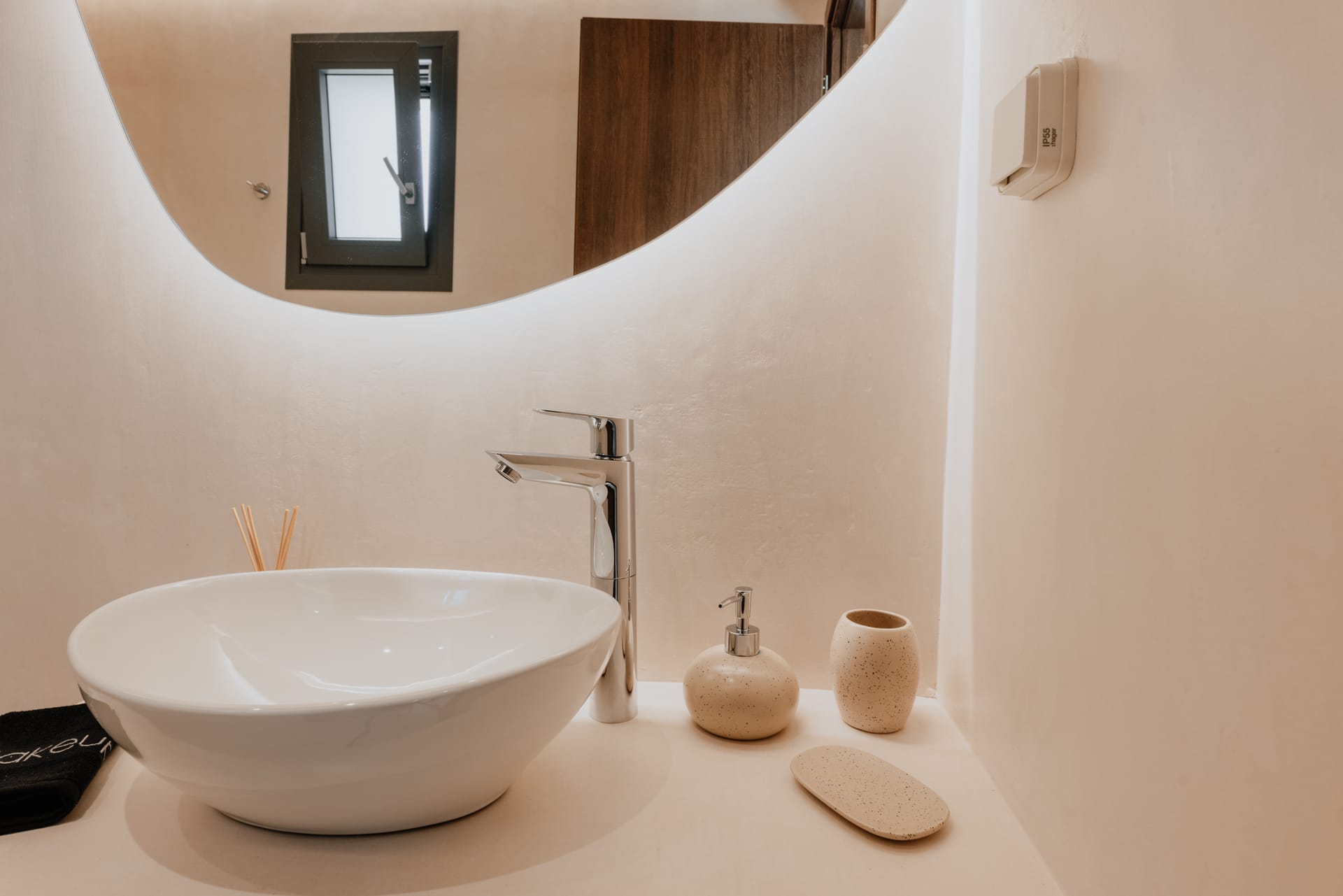 The villa unfolds across three thoughtfully designed levels. The lower level includes two comfortable bedrooms—one with a double bed and one with twin beds—along with a modern bathroom, creating a calm and restful retreat. The ground floor hosts an additional bedroom with a double bed, a bathroom, and a fully equipped kitchen, with direct access to the outdoor area and the private swimming pool.