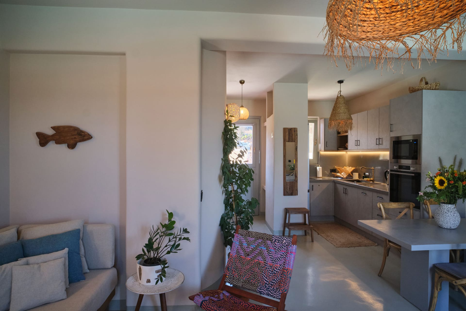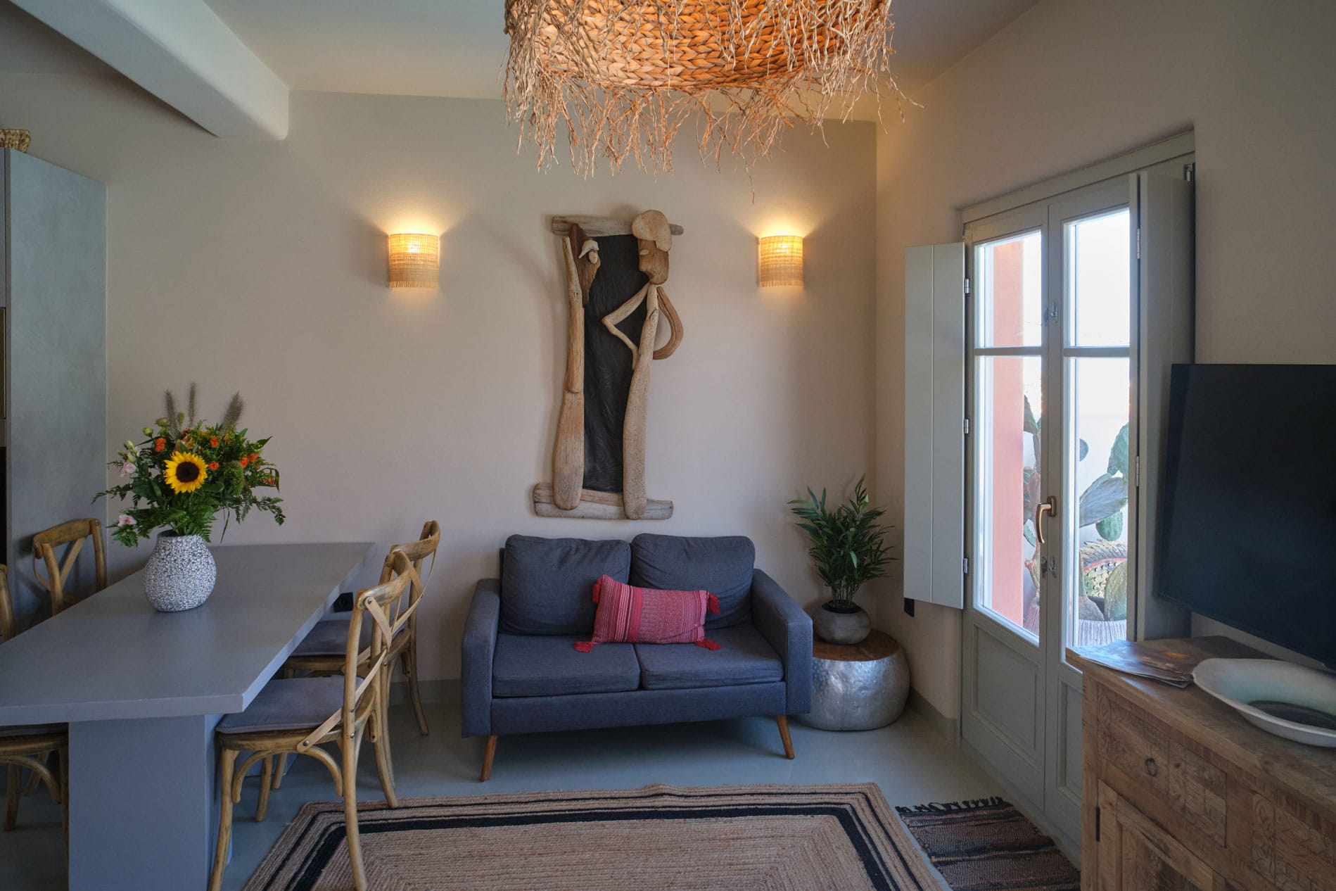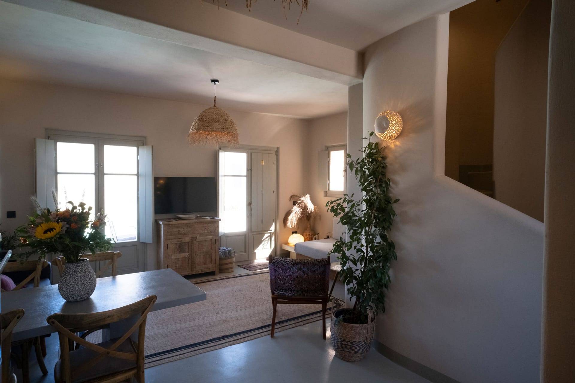 This villa has two levels. Accessible via a private entrance, the ground floor greets you with a porch adorned with a table and four chairs. Stepping inside, you'll find a spacious ground floor area comprising of a large living room with a flat screen smart TV, two sofas, an open-plan fully equipped kitchen, a dining table, and a bathroom. Just in front of the living room lies a terrace featuring a plunge jetted swimming pool, outdoor furniture, and commanding views of the sea and sunset.