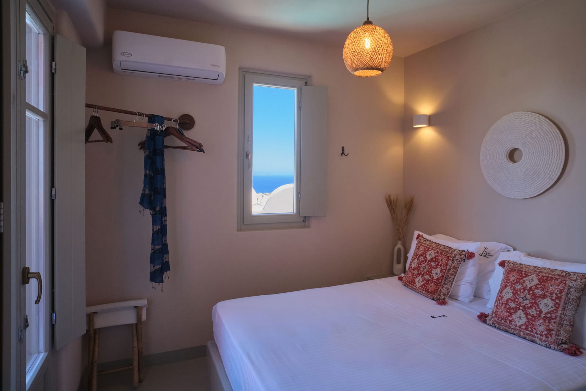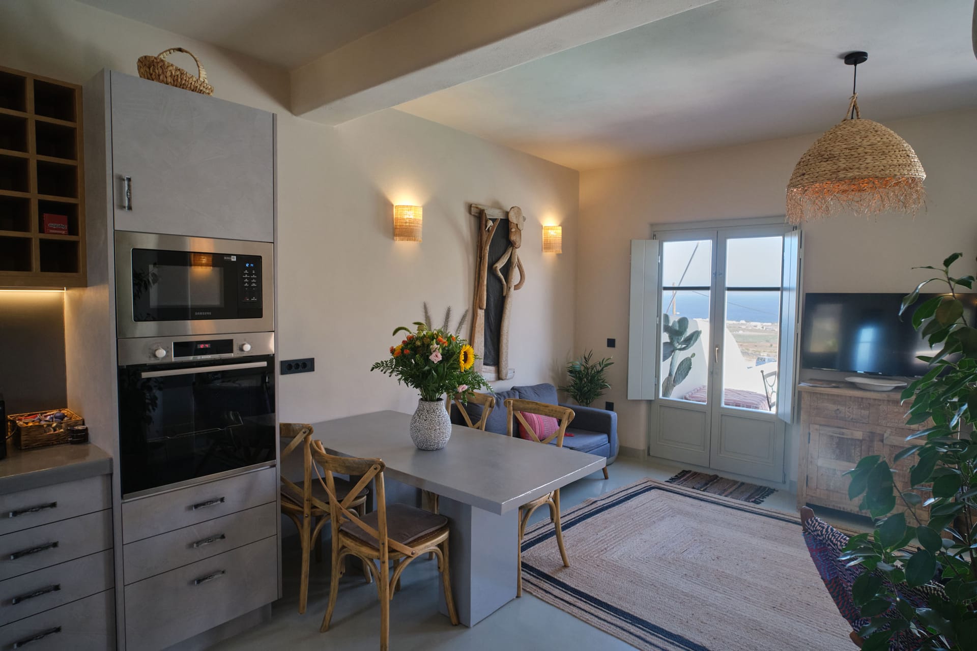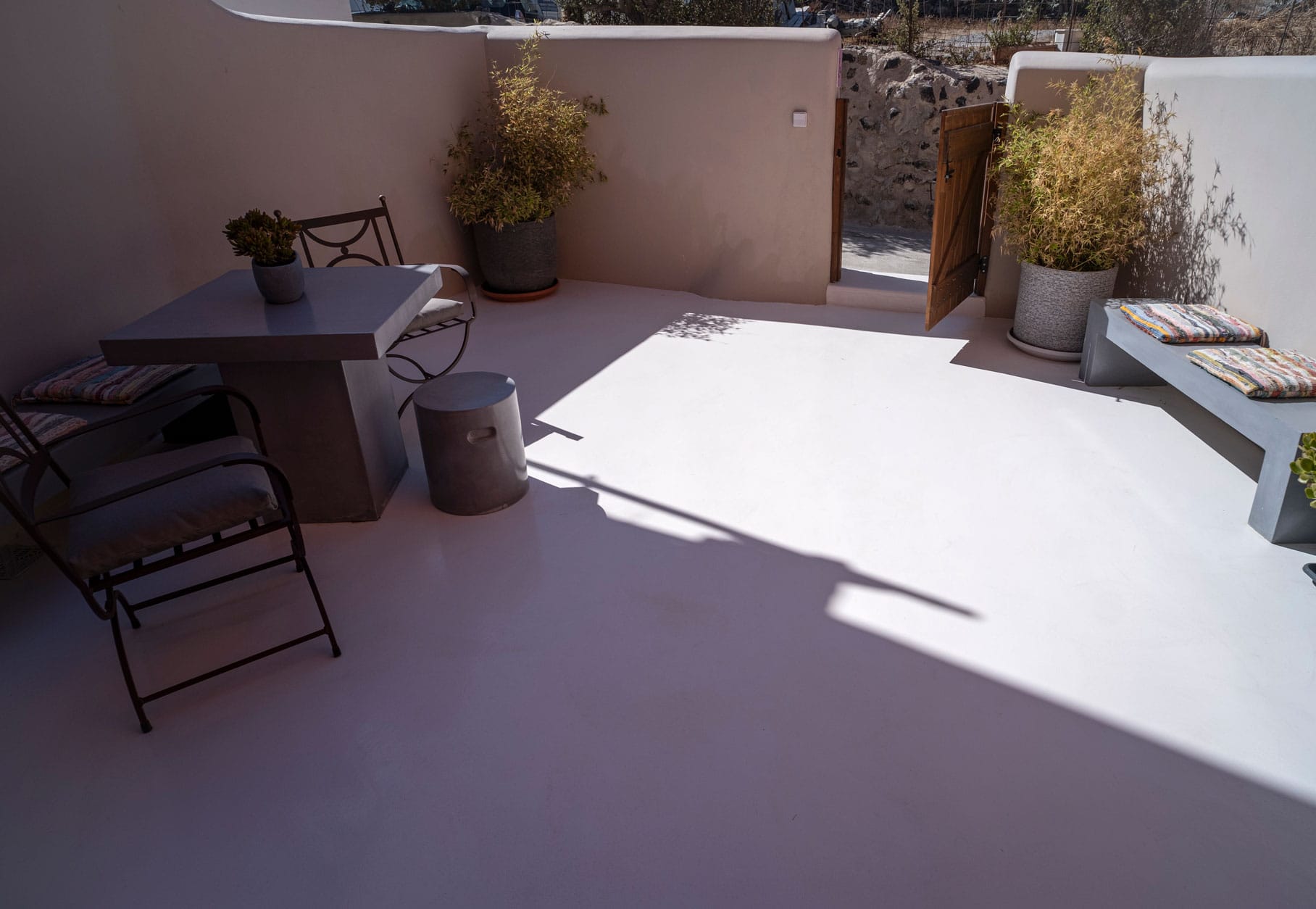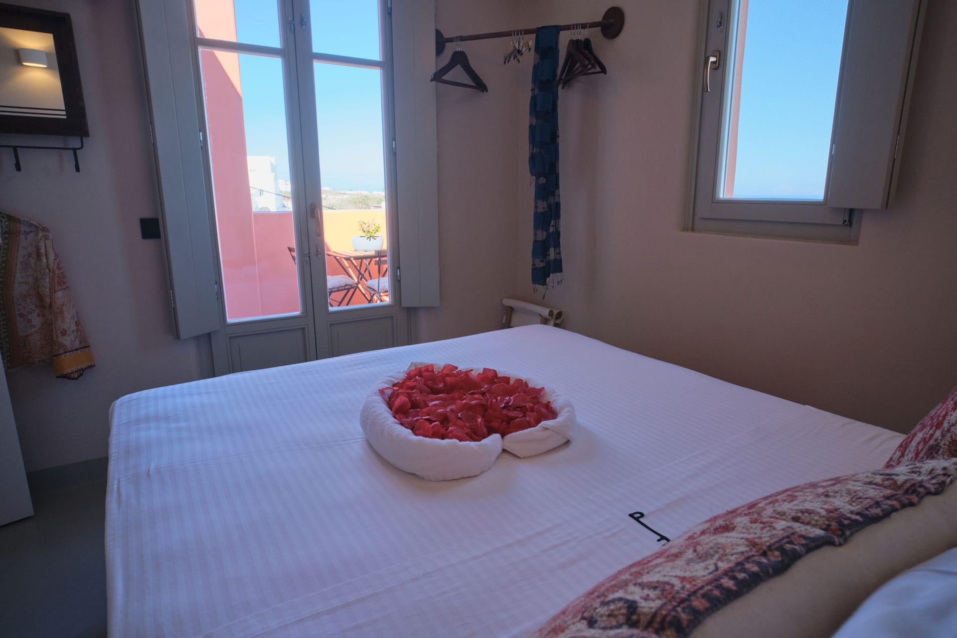 Within this villa, there are three distinct dining areas, one indoors and two outdoors (the porch and the front terrace). Moving on to the first floor, you'll discover the sleeping quarters, an additional bathroom, and another balcony. Upstairs, there are two bedrooms furnished with comfortable queen beds, each boasting a balcony that overlooks the Aegean Sea and the stunning Santorini sunset. Rest assured, all the linen, mattresses, and toiletries provided in this villa are of exceptional quality.