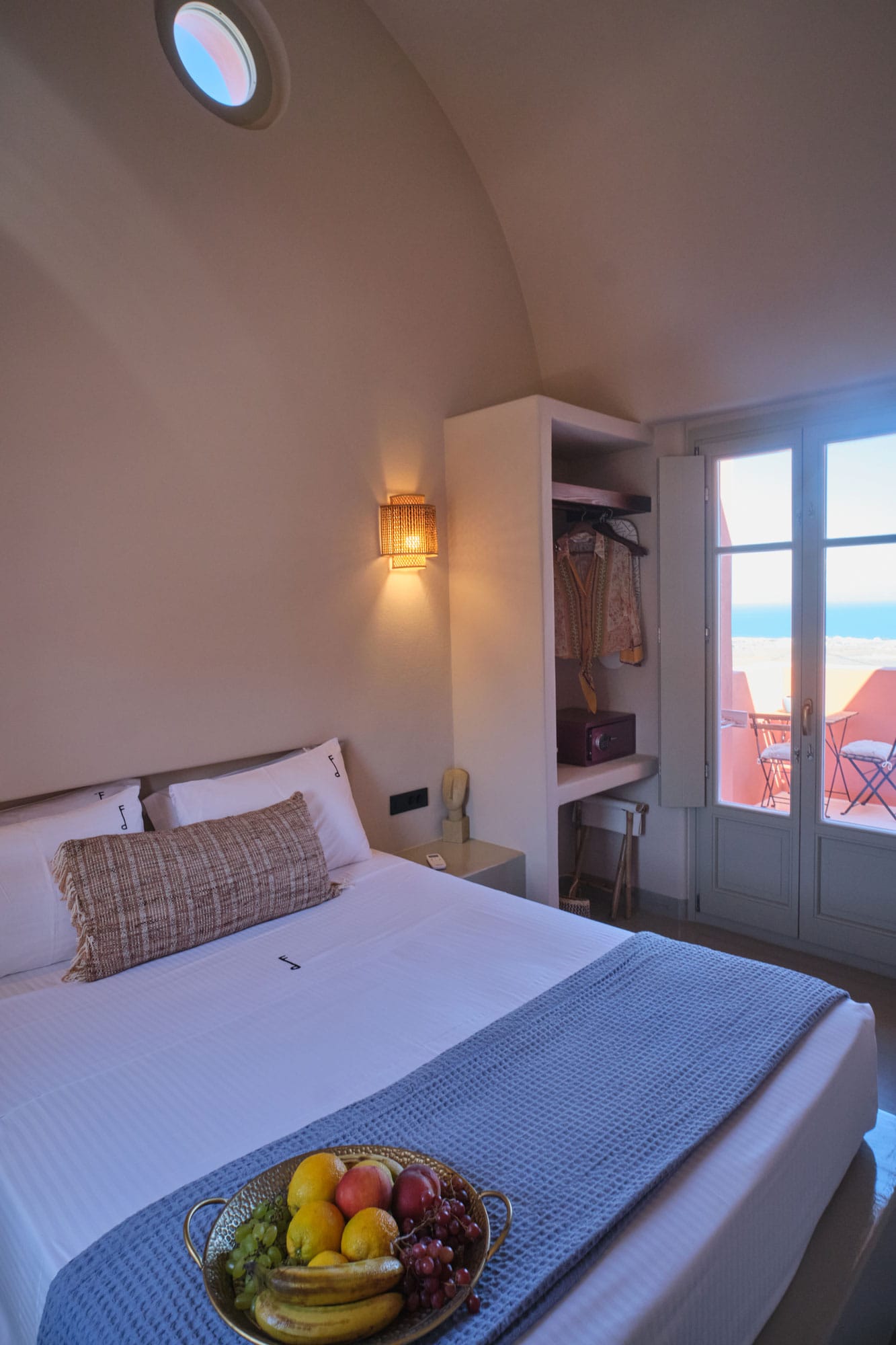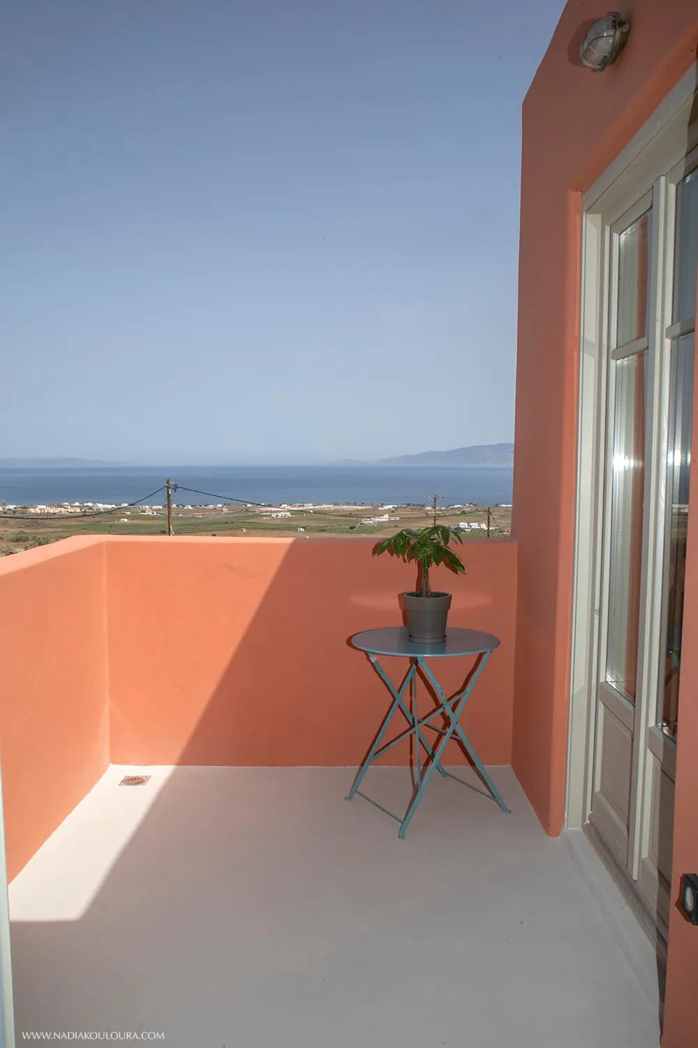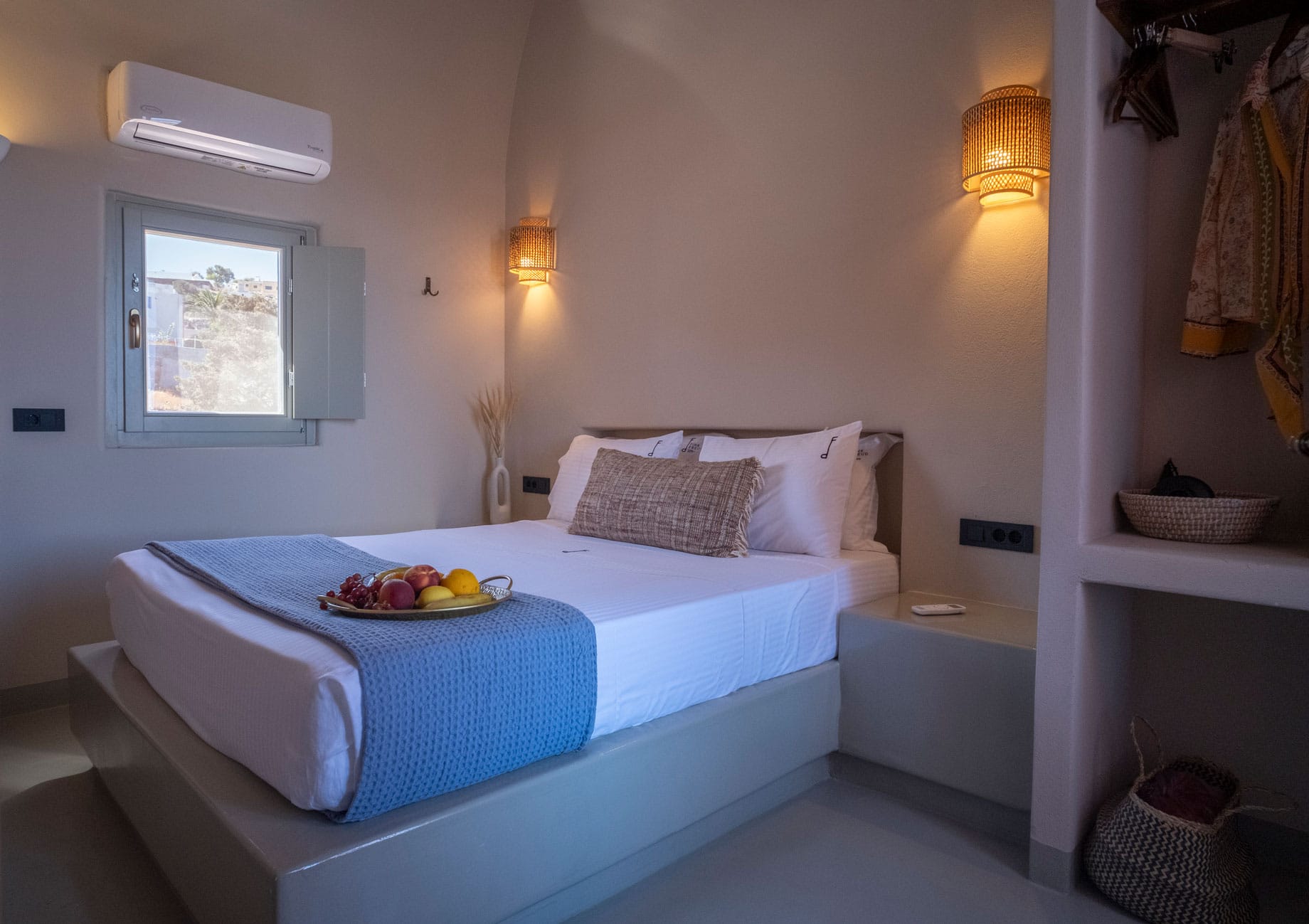 Within this villa, there are three distinct dining areas, one indoors and two outdoors (the porch and the front terrace). Moving on to the first floor, you'll discover the sleeping quarters, an additional bathroom, and another balcony. Upstairs, there are two bedrooms furnished with comfortable queen beds, each boasting a balcony that overlooks the Aegean Sea and the stunning Santorini sunset. Rest assured, all the linen, mattresses, and toiletries provided in this villa are of exceptional quality.