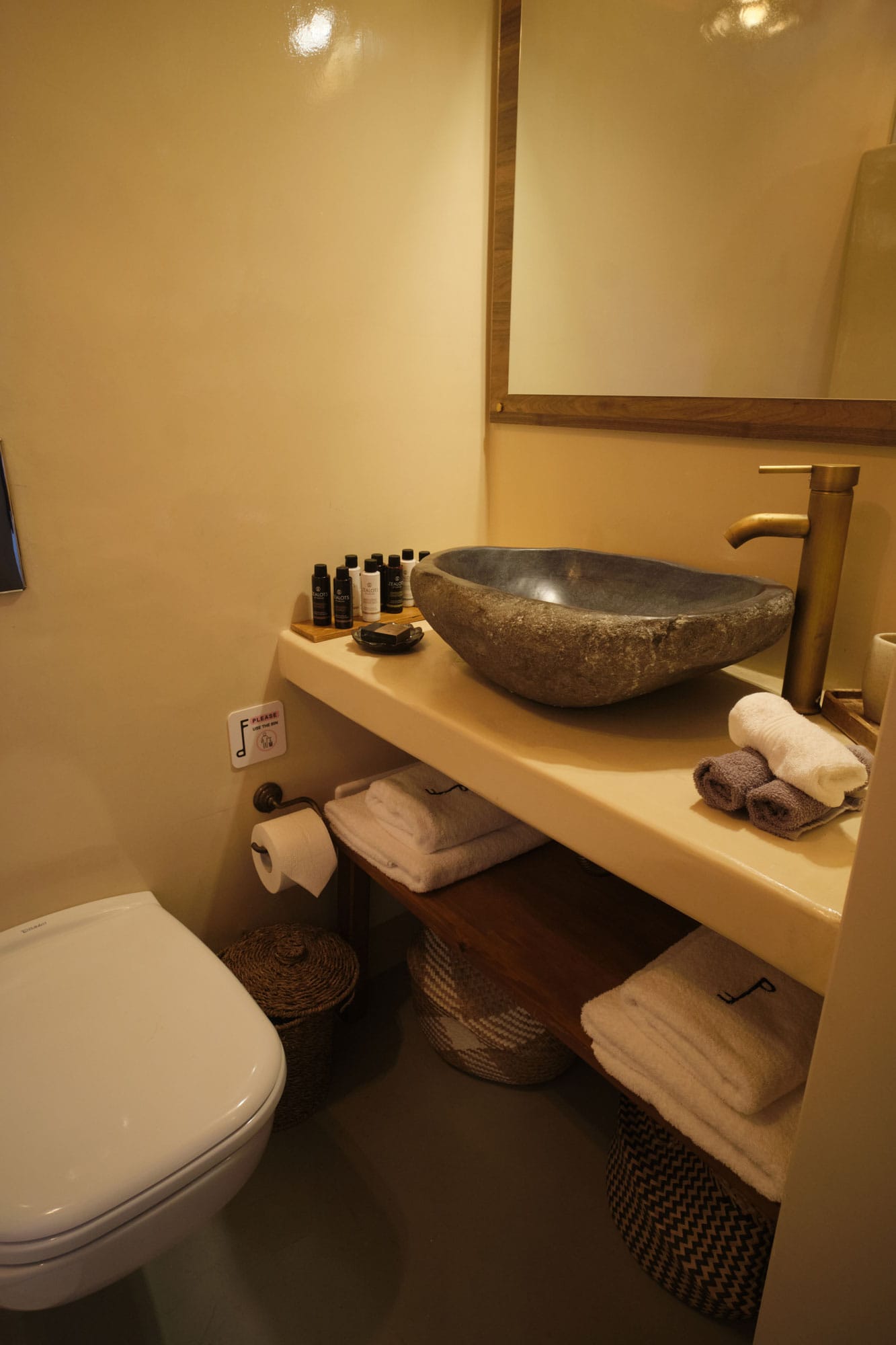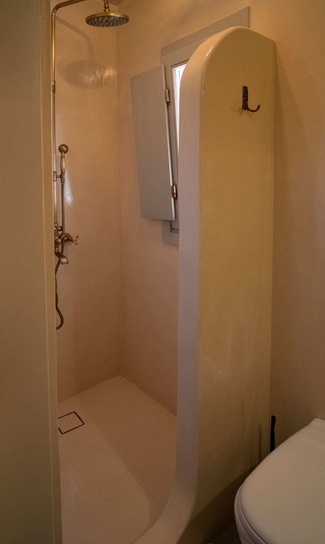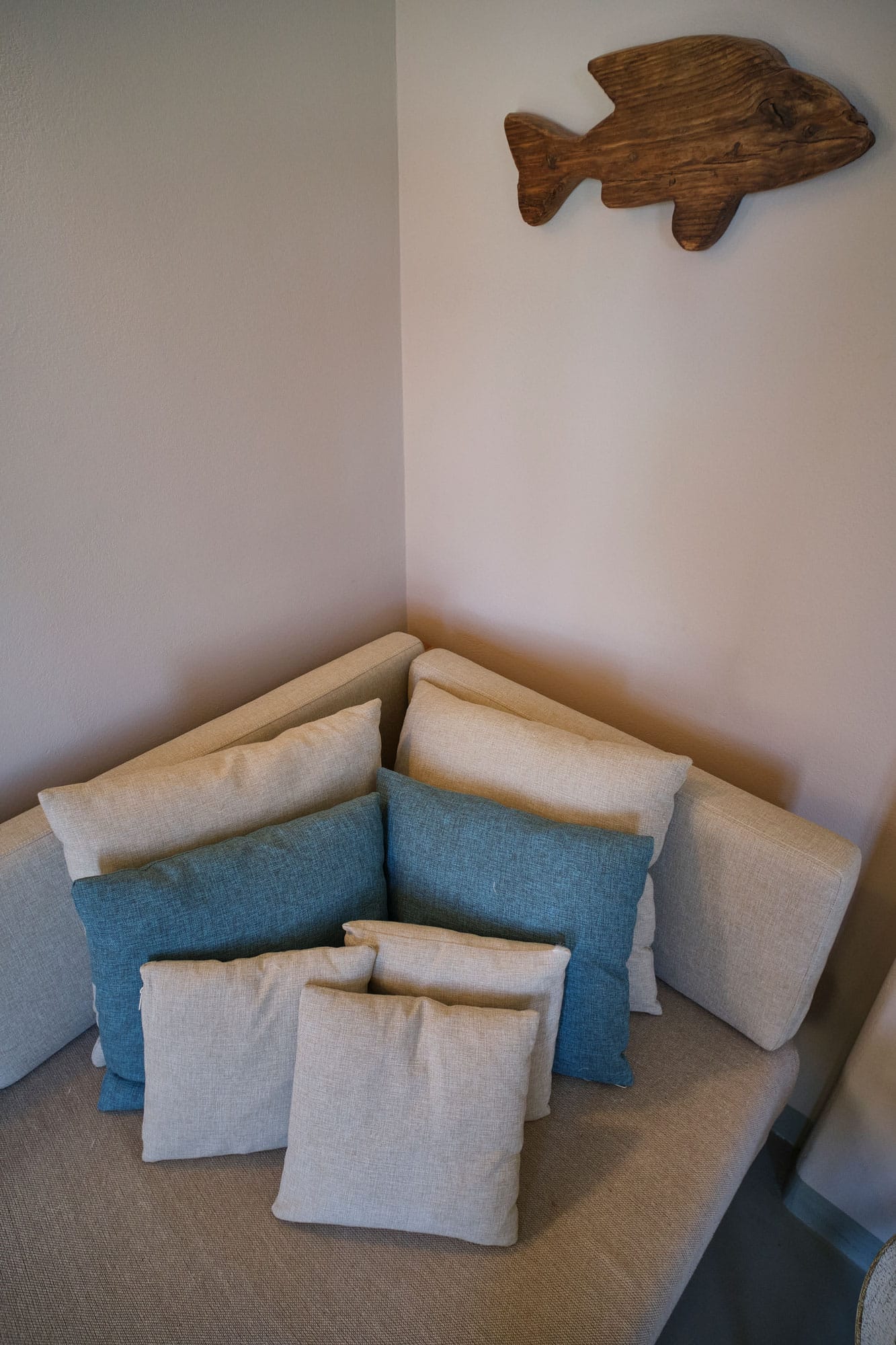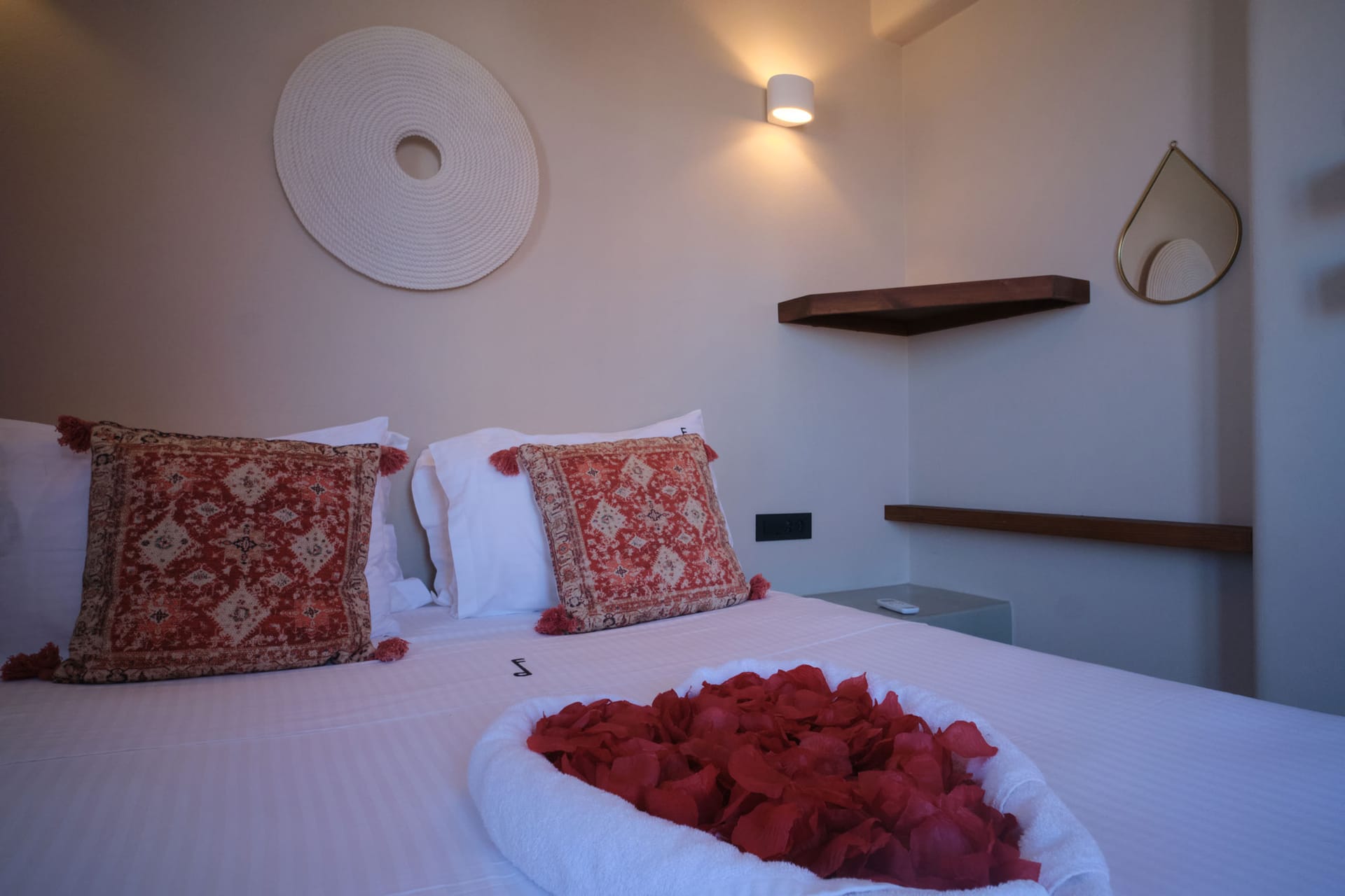 Within this villa, there are three distinct dining areas, one indoors and two outdoors (the porch and the front terrace). Moving on to the first floor, you'll discover the sleeping quarters, an additional bathroom, and another balcony. Upstairs, there are two bedrooms furnished with comfortable queen beds, each boasting a balcony that overlooks the Aegean Sea and the stunning Santorini sunset. Rest assured, all the linen, mattresses, and toiletries provided in this villa are of exceptional quality.
