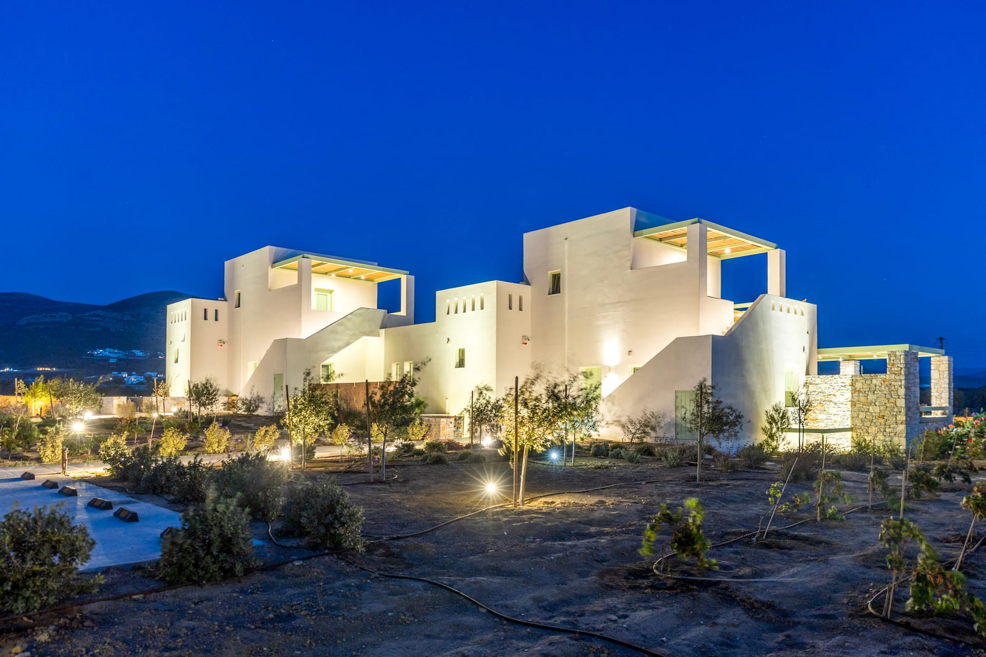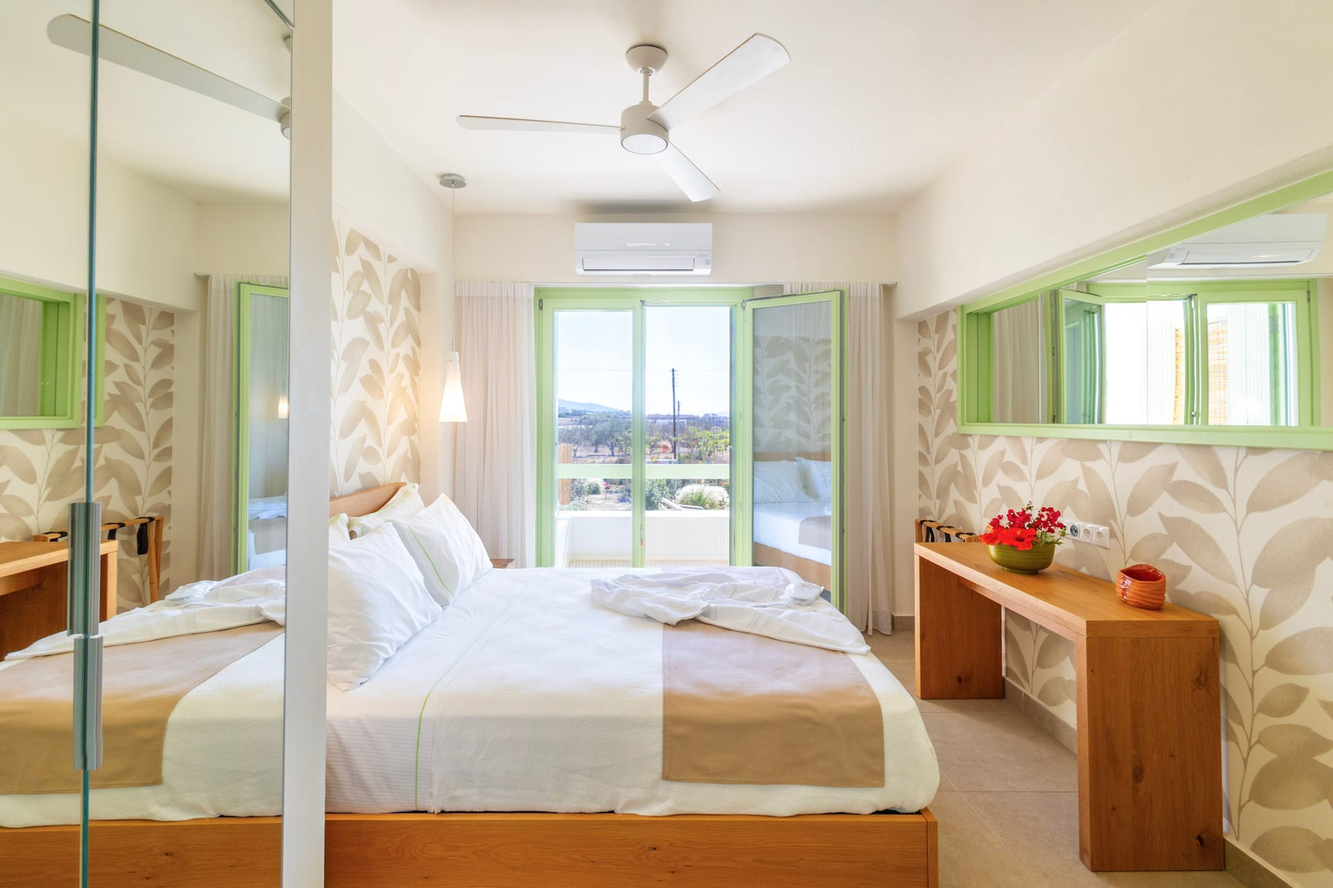 The luxury villa is set in 970 square meters grounds, planted with lawns, trees, vineyards and aromatic flowers.You enter the villa following the paved ramp next to the parking space. The door at the ground floor opens to reveal a splendidly well-proportioned open-plan communal area. 2 French windows provide exit to the private pool and the covered outside living area. To the right is the well-equipped kitchen with marble central island and worktop. Next to the kitchen you will find a welcoming bright living room, where a comfy sofabed and 2 armchairs are gathered around 2 central black and white marble coffee tables, specially made for the villa by local craftsmen. To the left is the solid chestnut dining table, made of wood directly sourced from the monks of mount Athos. Ruby red metal chairs and a vivid triptych painting by Manolis Charos complements the dining area. A small wc, decorated with local black and white marble, serves the communal areas and the pool. White-washed walls, sea-green wooden fixtures, handmade ceramics, vivid ethnic fabric details create a crispy, airy atmosphere, while the four glass doors allow the space to flow outside seamlessly.