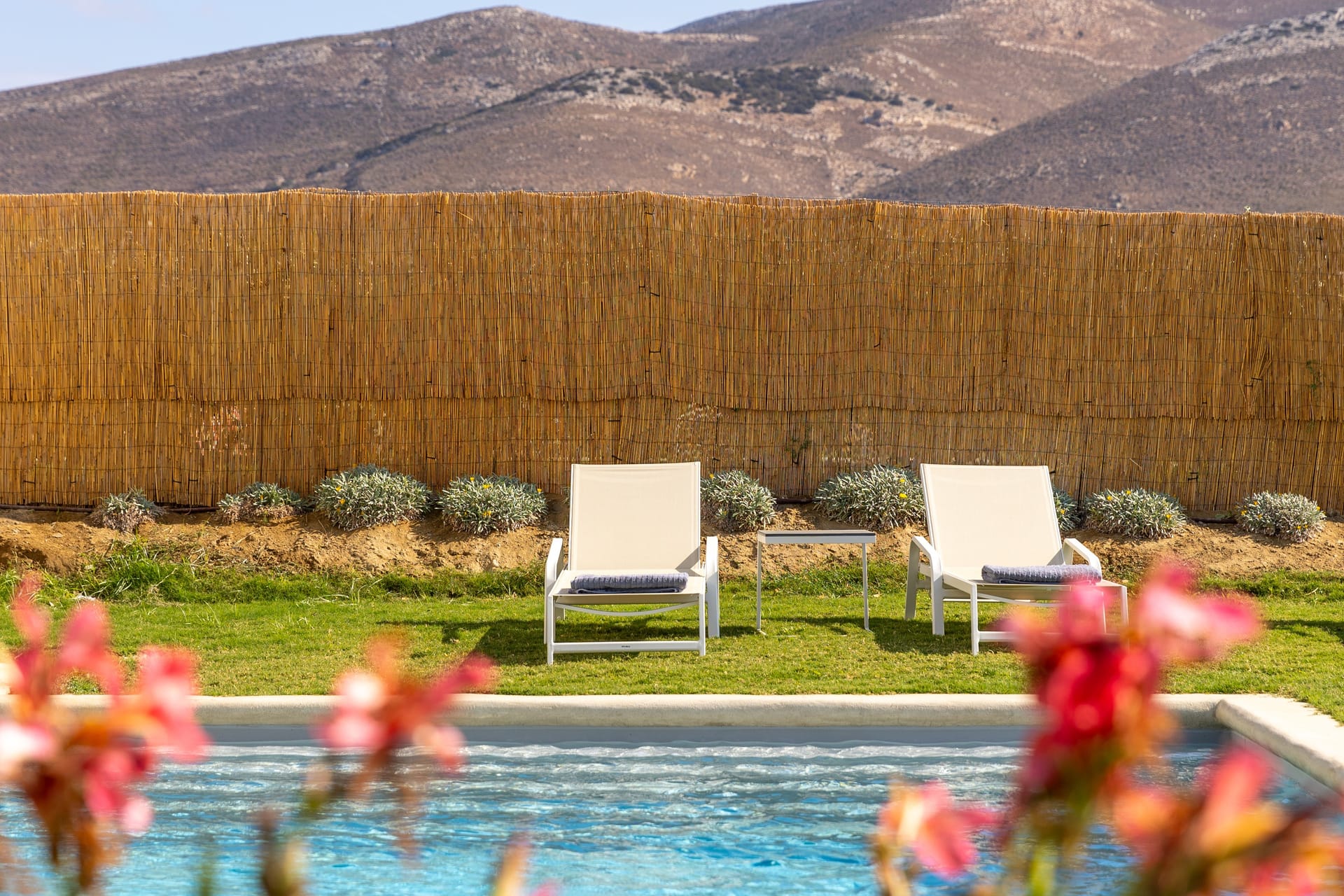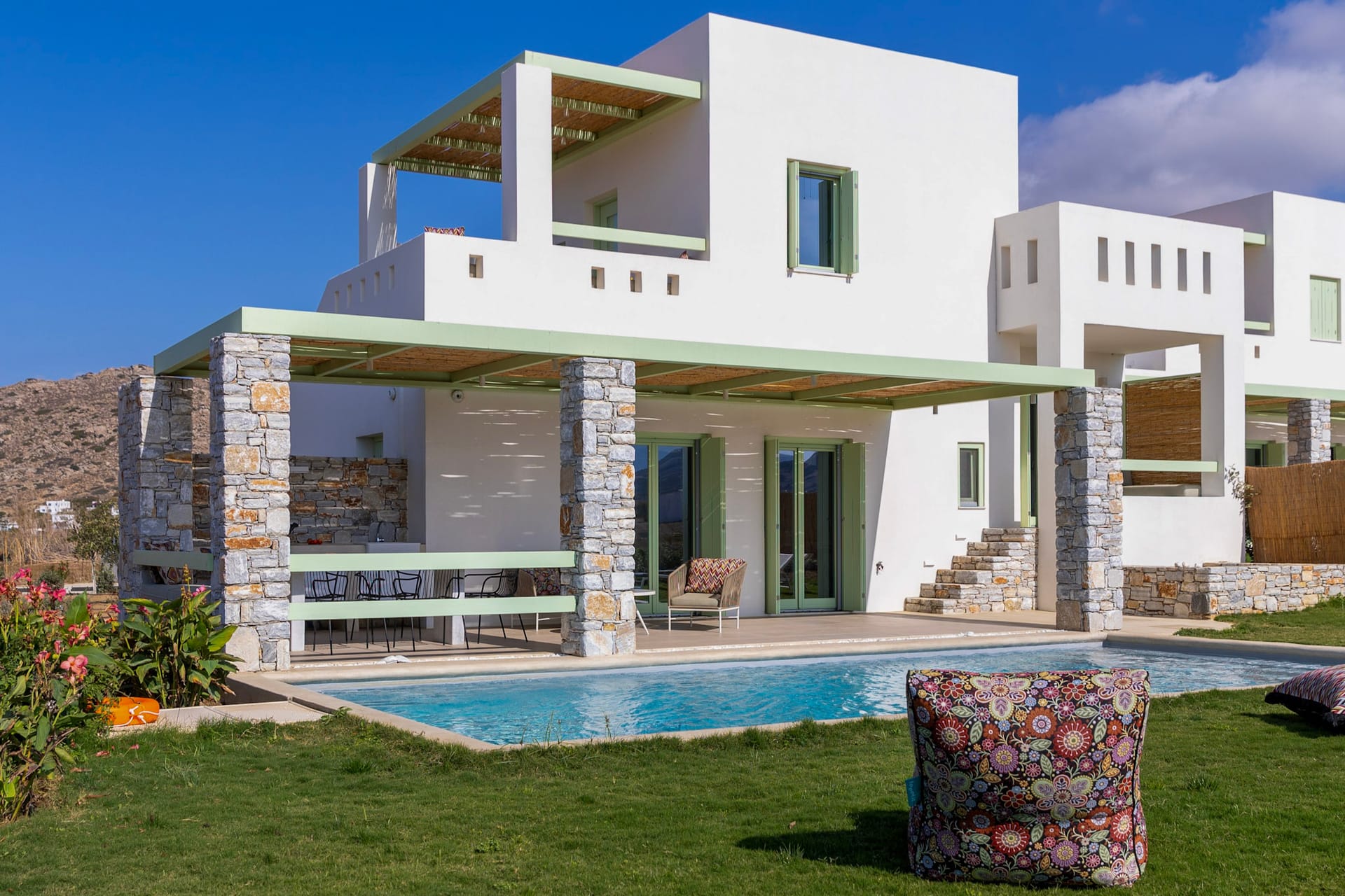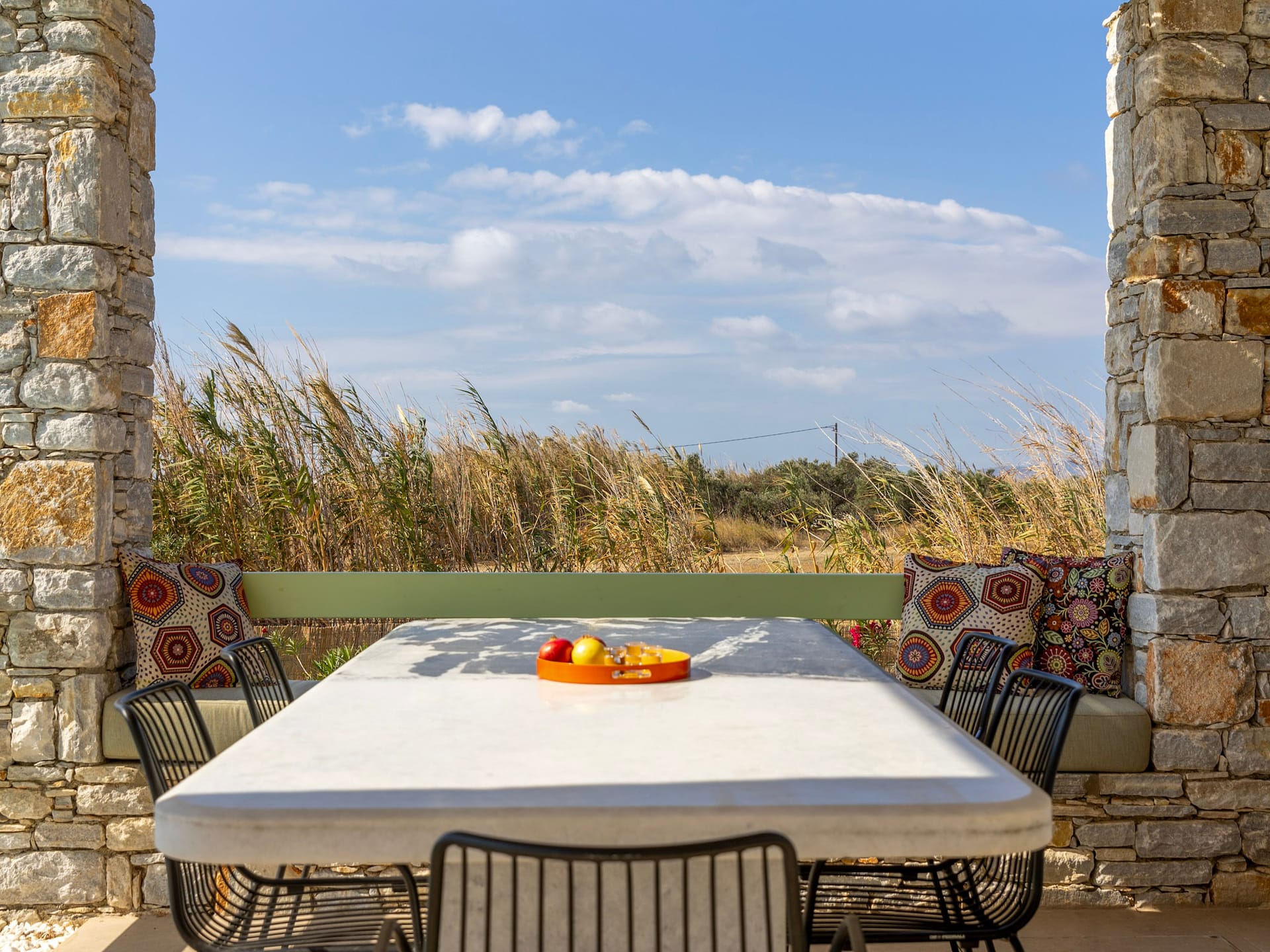 Indoor and outdoor areas are connected by a spacious covered terrace (43 sqm), which leads to the big pool (9.1m x 4.6m). The pool is ringed by colourful flowers and 150sqm of lawn, that flows to the vivacious garden. A curvy stone path connects the pool with the 2 round sitting areas planted with mulberry trees and phoecus, ideal for reading or playing chess, while listening to the sound of nature. Next to the pool a paved path leads to the back garden planted with olive, fig, pomegranate trees and grapevines. Back to right side of the shaded terrace is the outside dining area overlooking the pool and the swinging reeds. A worktop with a sink and an electric BBQ by Weber is set against the ochre-grey stone wall.