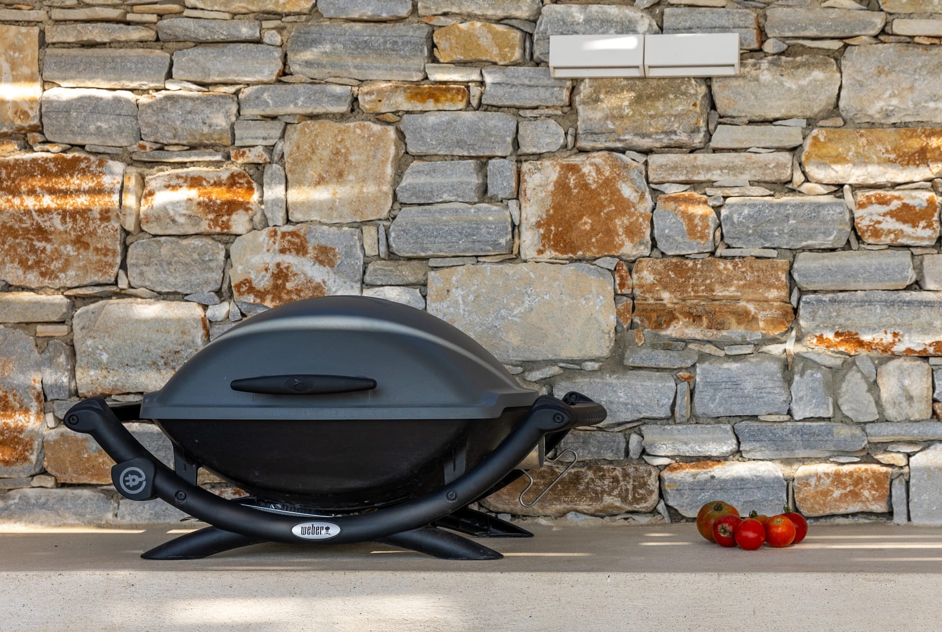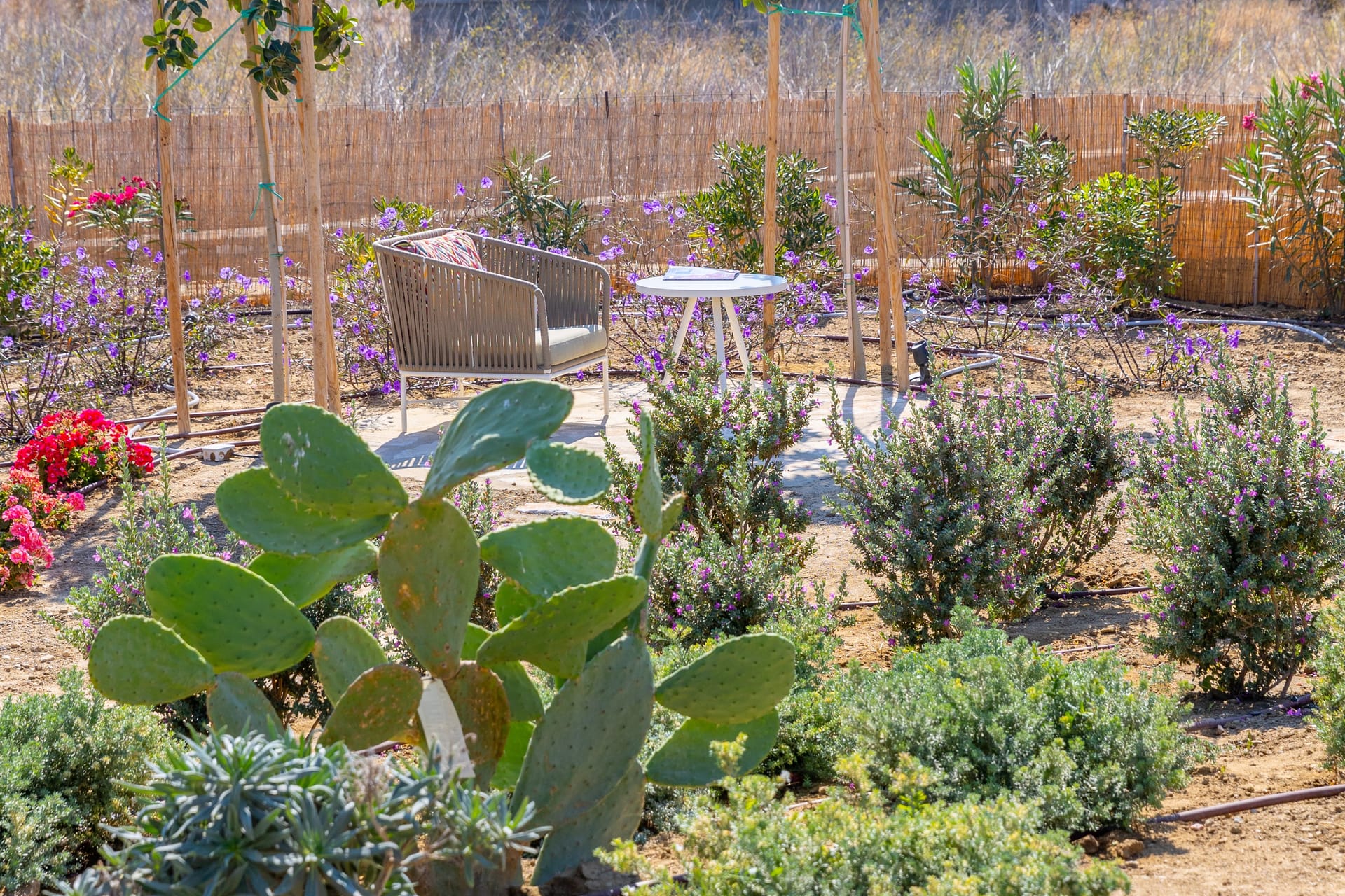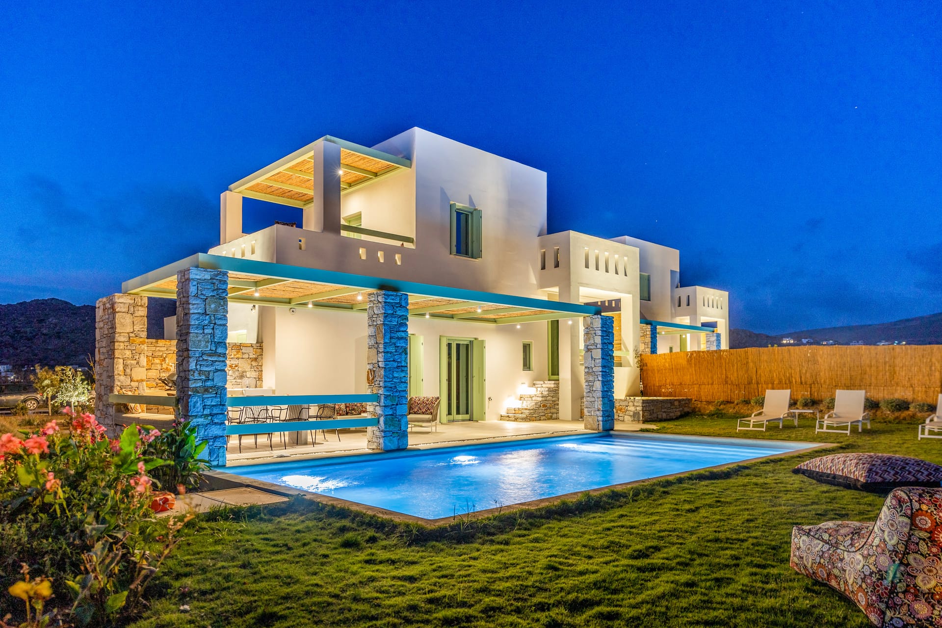 Indoor and outdoor areas are connected by a spacious covered terrace (43 sqm), which leads to the big pool (9.1m x 4.6m). The pool is ringed by colourful flowers and 150sqm of lawn, that flows to the vivacious garden. A curvy stone path connects the pool with the 2 round sitting areas planted with mulberry trees and phoecus, ideal for reading or playing chess, while listening to the sound of nature. Next to the pool a paved path leads to the back garden planted with olive, fig, pomegranate trees and grapevines. Back to right side of the shaded terrace is the outside dining area overlooking the pool and the swinging reeds. A worktop with a sink and an electric BBQ by Weber is set against the ochre-grey stone wall.