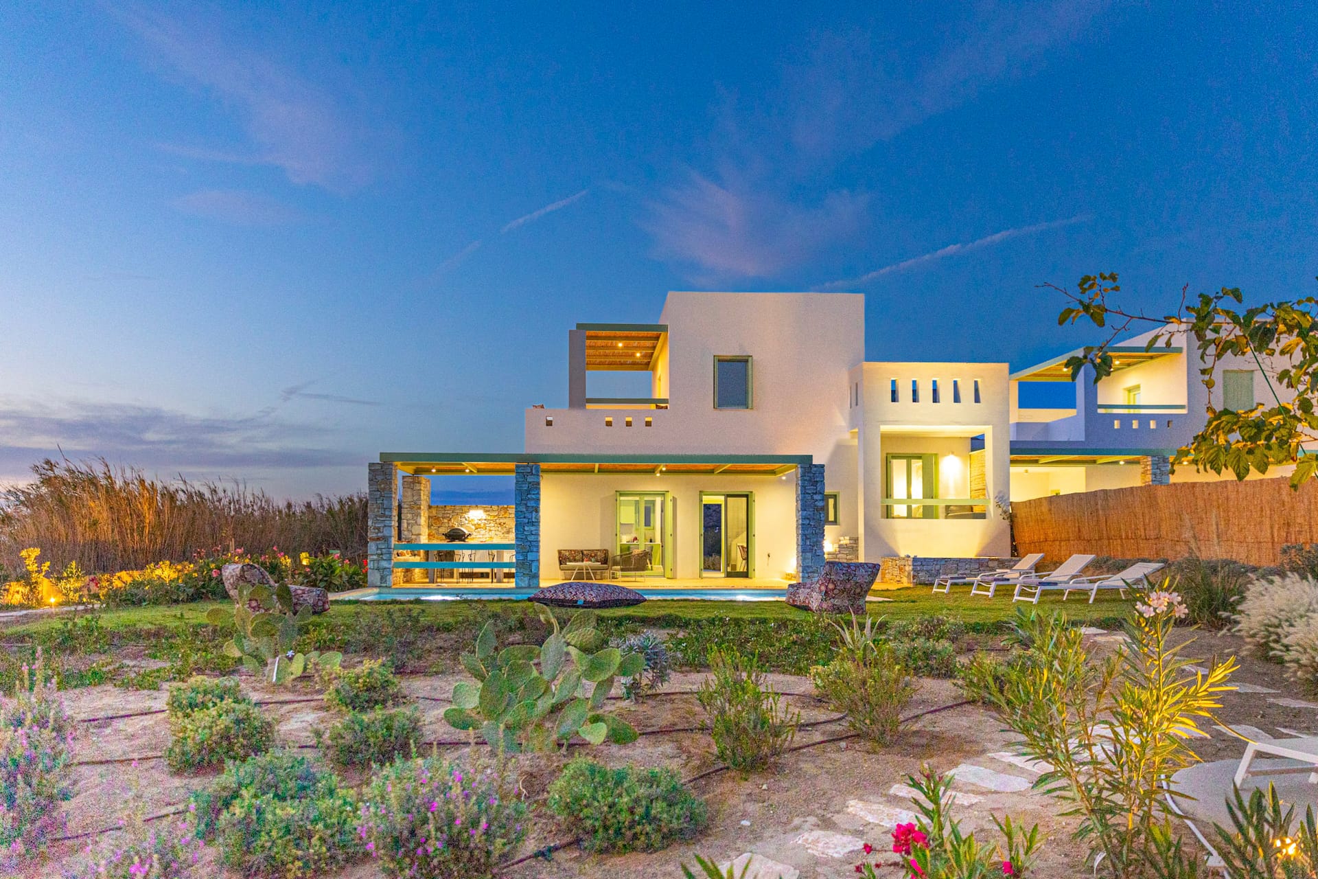 Where the grounds end, the fields leading to the beach begin, making this a very peaceful spot for lovers of rural and beach living. Loungers, bean bags, comfy armchairs placed under the sun or in the shades form common and private areas, that are ideal for relaxation, sipping aperitifs and stargazing. The big black and white marble table next to the electric BBQ is the perfect spot for convivial dinning and playing board games.