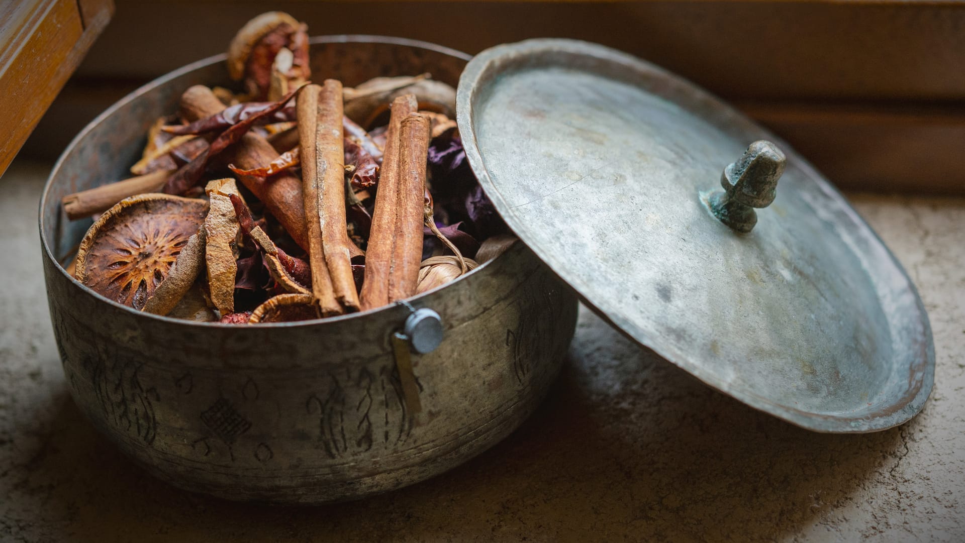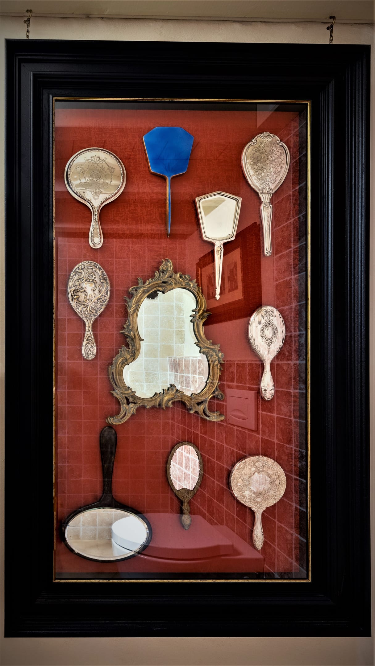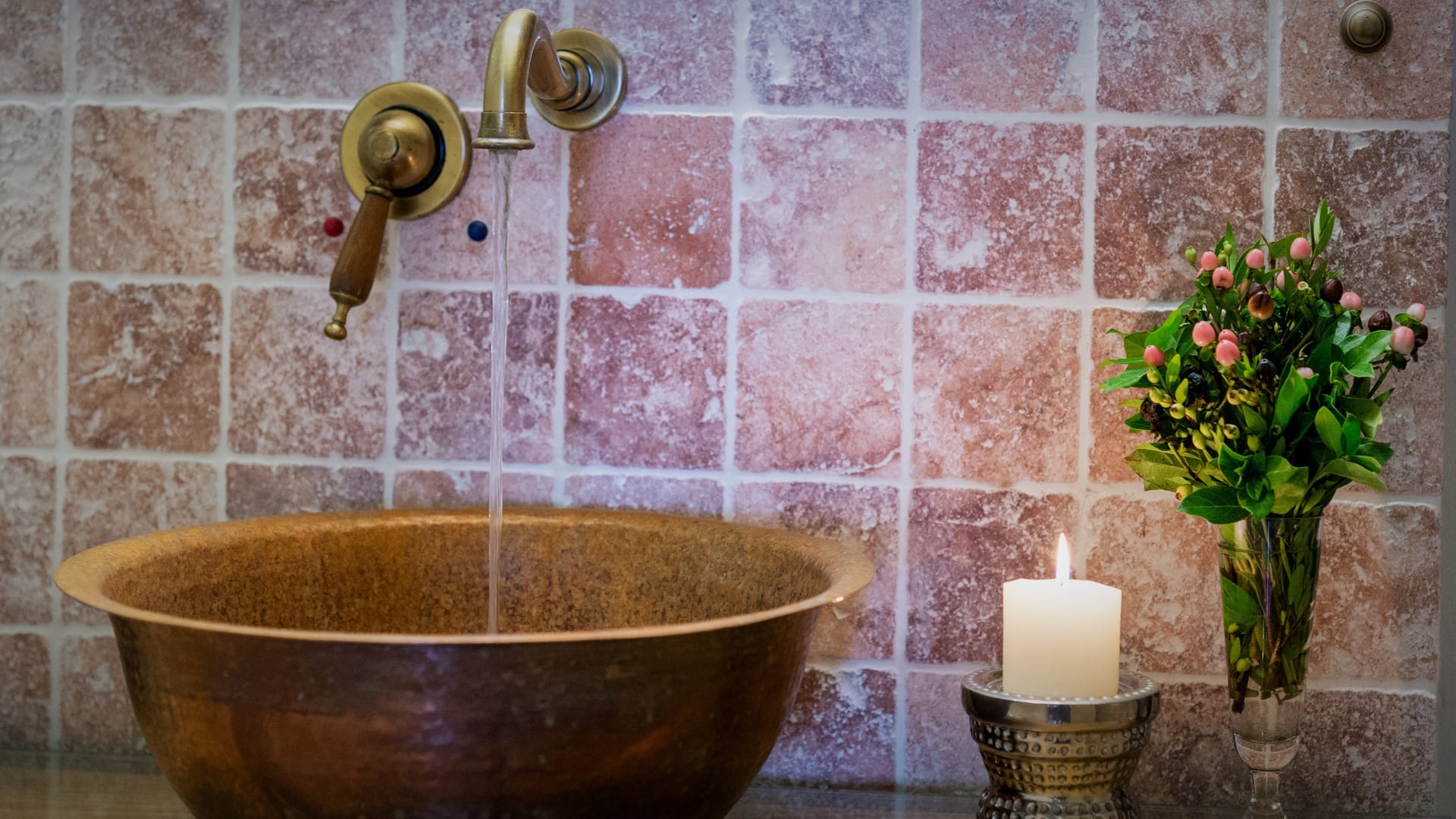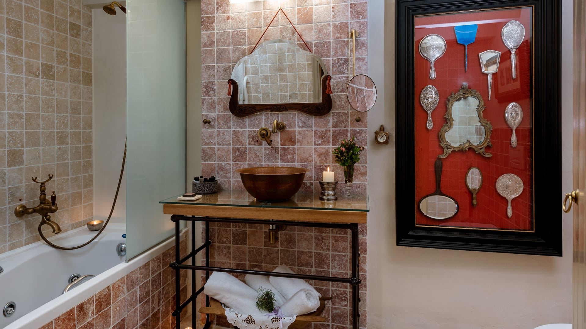 Also on the lower level, the cosy bathroom features a whirlpool bathtub, an impressive décor of collectable handheld mirrors and a hand-hammered copper sink.