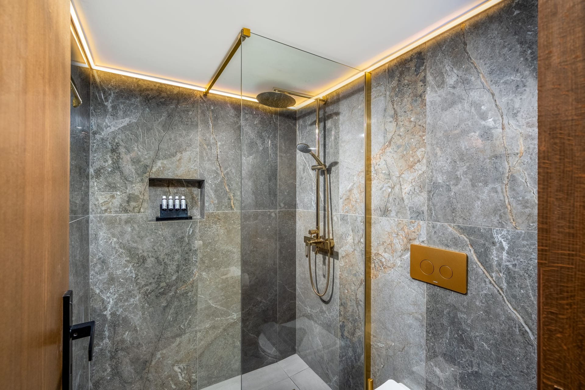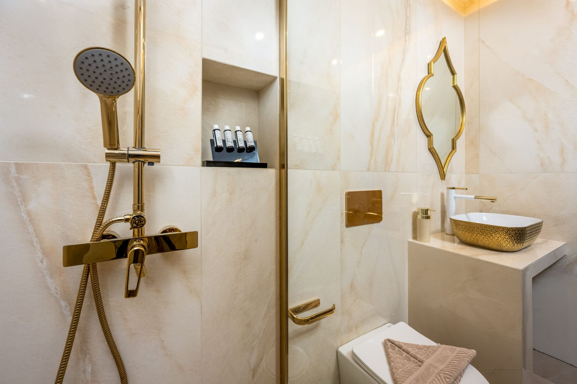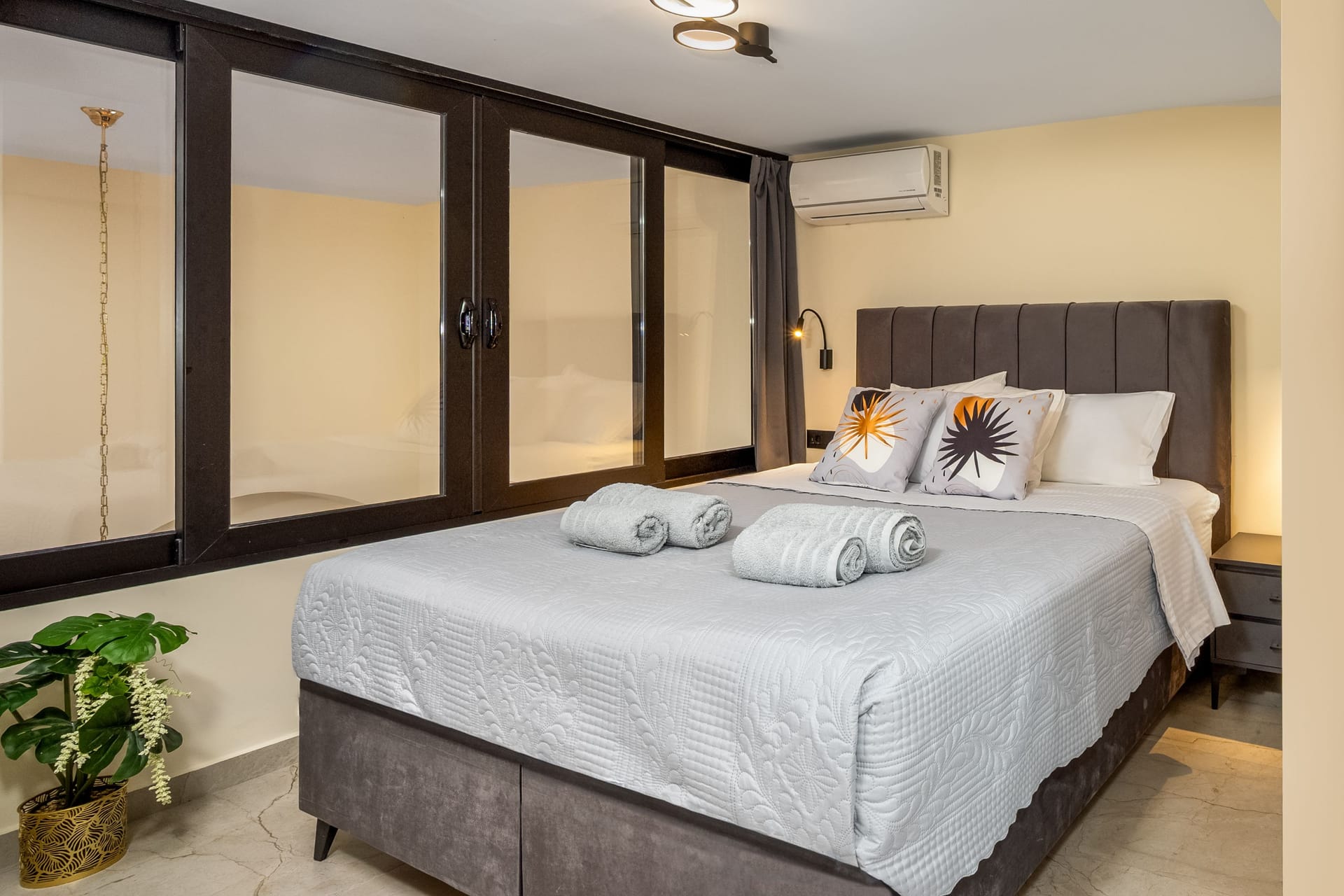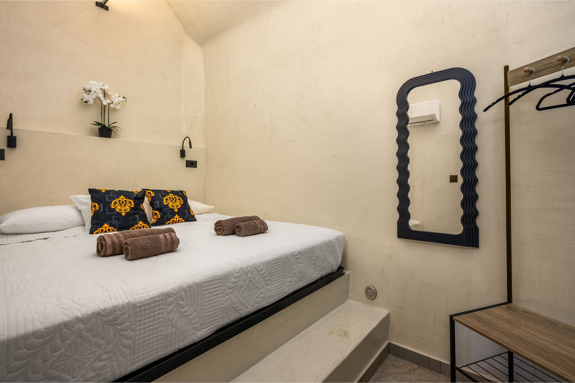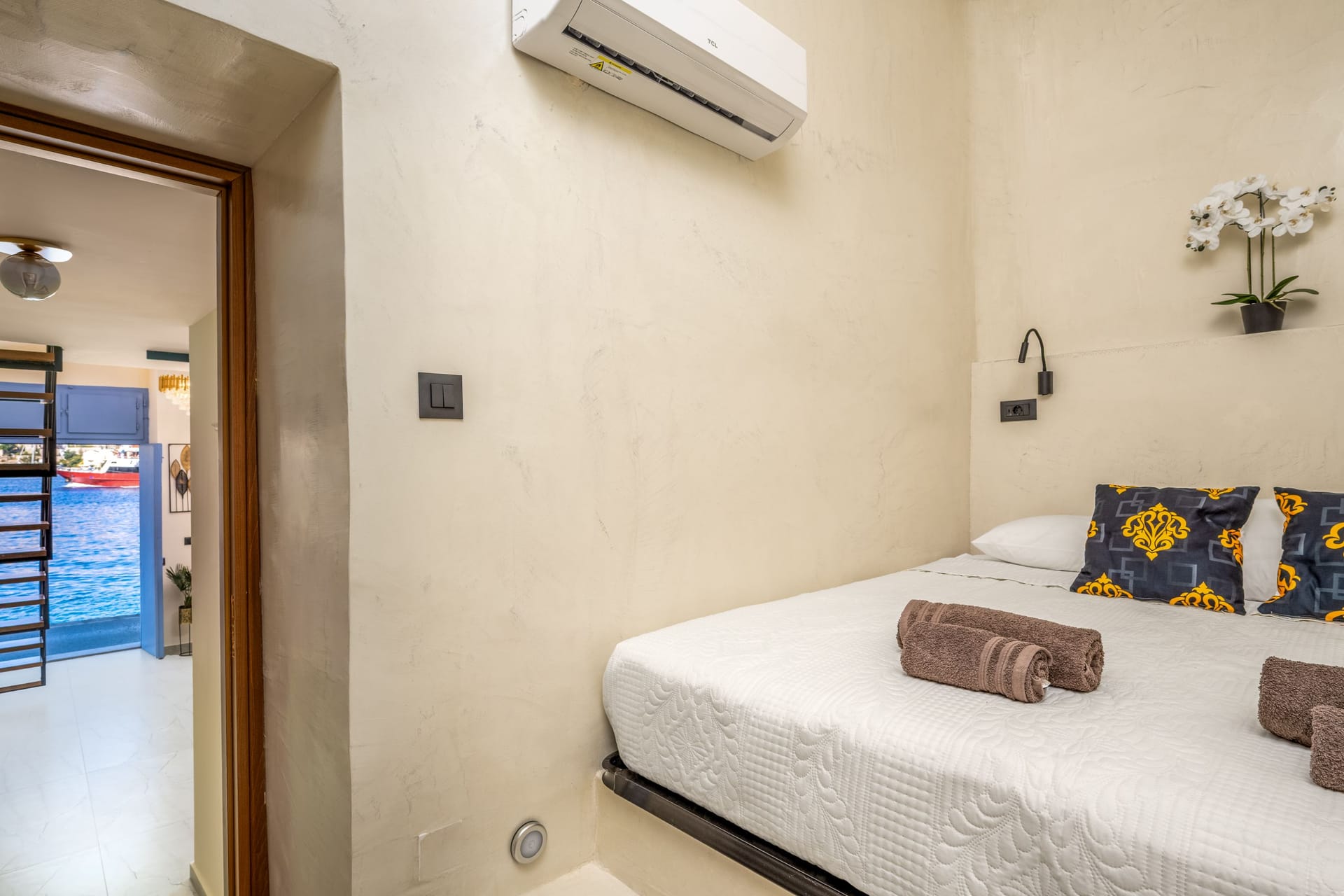 Symi’s Jewel is a beautifully appointed apartment featuring two cozy bedrooms with double beds—one on the ground floor and one on the first floor. The first-floor bedroom includes an ensuite bathroom with a walk-in shower. An additional modern bathroom with a shower is also located on the ground floor.