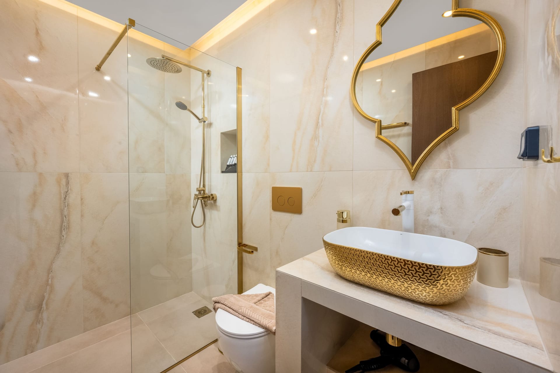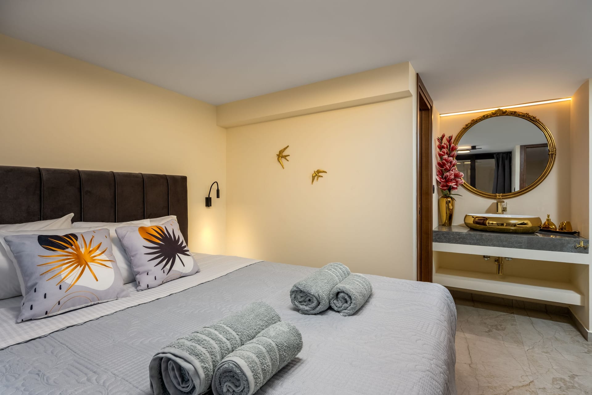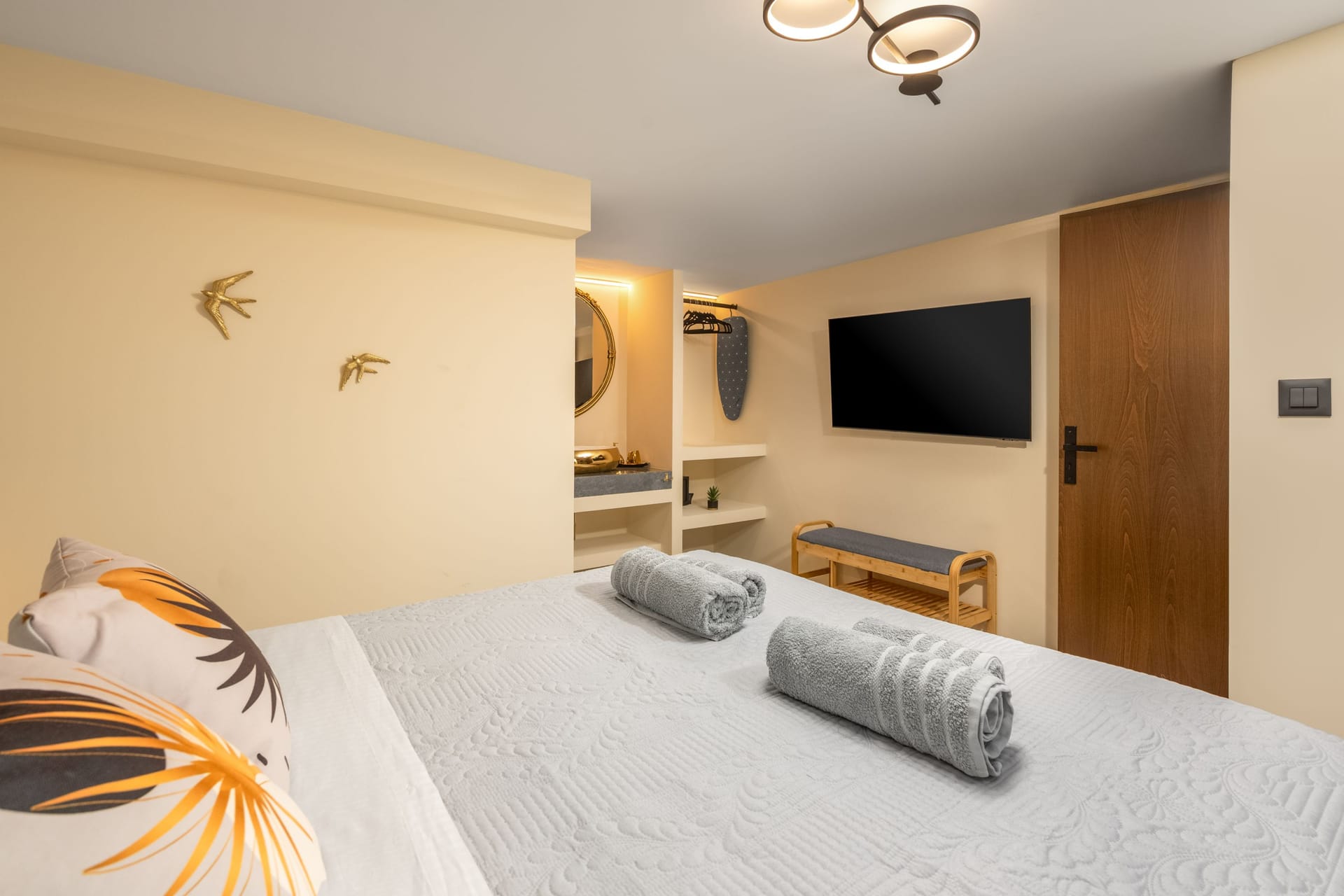 The fully equipped kitchen includes everything you need to prepare meals, and a convenient mini washing machine is available for longer stays. The stylish living room provides a relaxing space with Smart TVs in each room and in the living area.