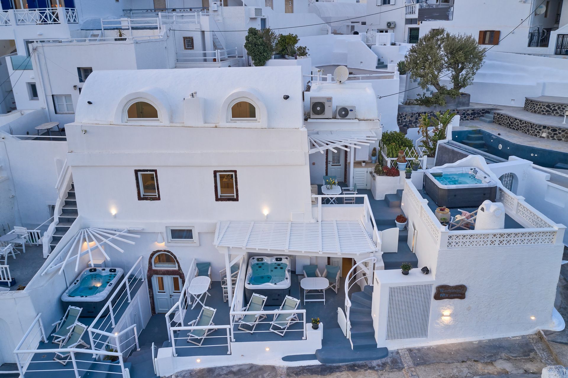 Santorini Mansion at Imerovigli combines the traditional Cycladic architecture with modern elements. It is divided into 3 separate and fully independent houses.(2 traditional cave house and one house split level with guest room. ) It consists of: