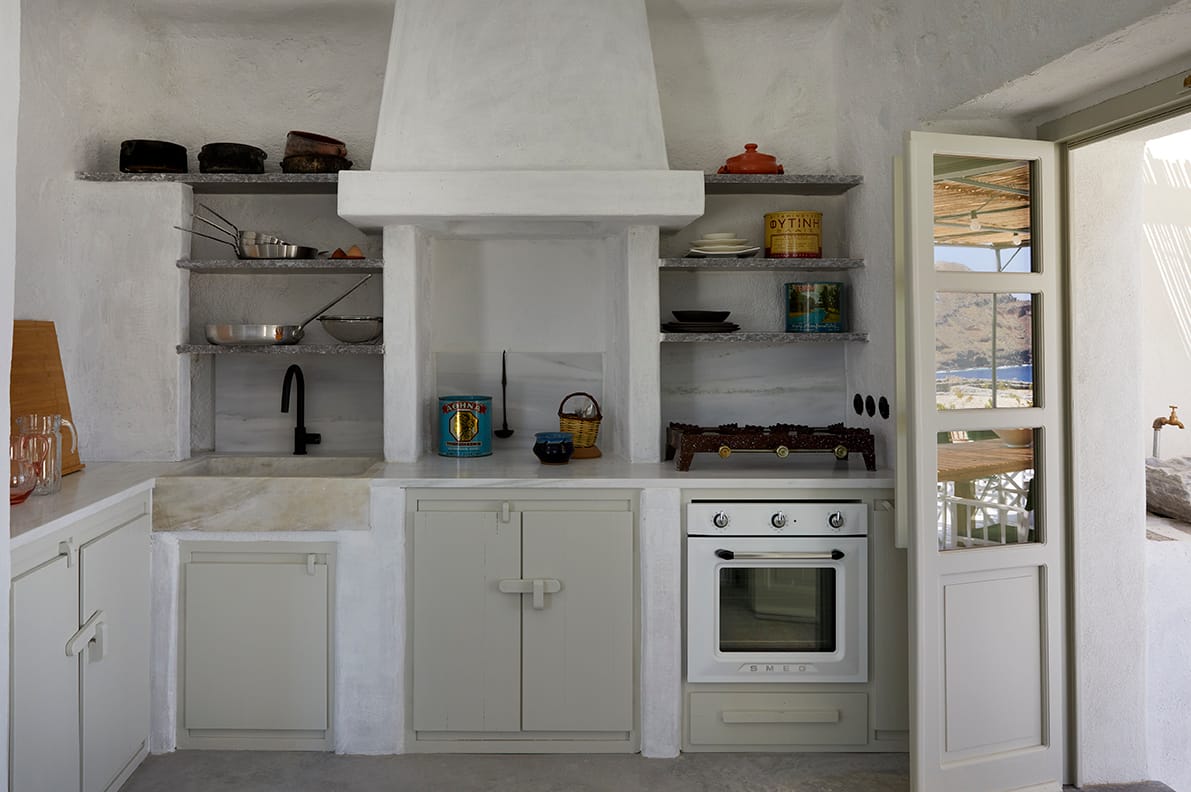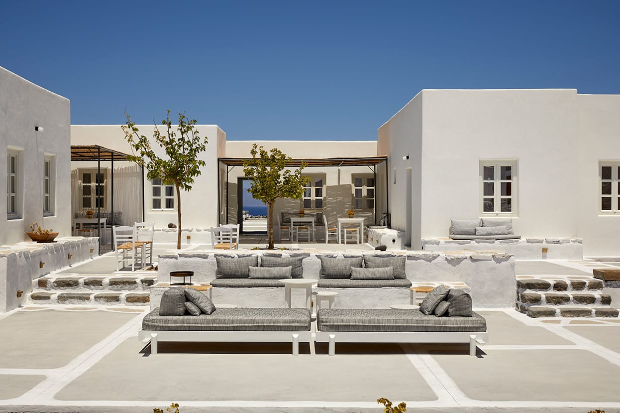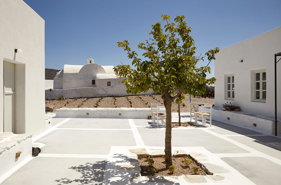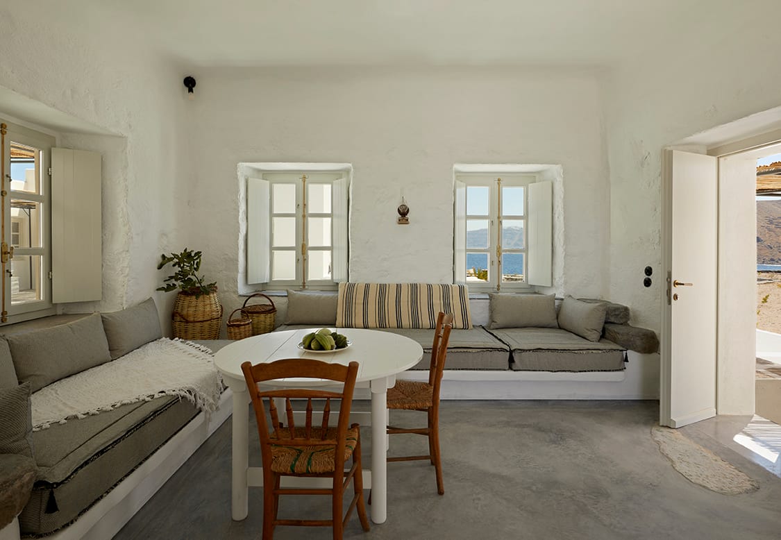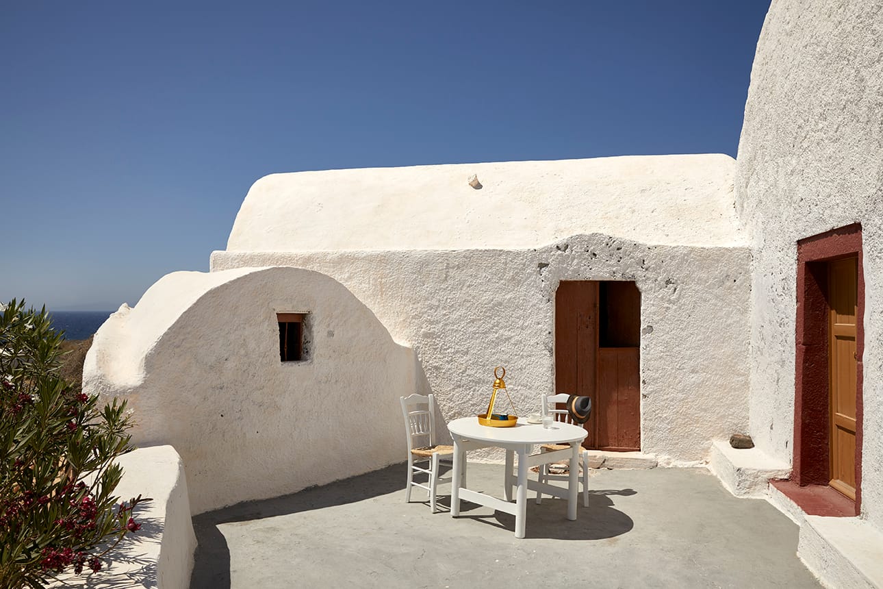 Santa Irini Retreat guarantees your privacy and can host in total 15 persons. It is a traditional residence developed in 3 separate suites (3 master bedrooms, each with a private lounge), two concept cave rooms, five bathrooms with showers, a traditional kitchen which also serves as a dining room, an interior yard with a view to the caldera and a swimming pool. It is surrounded by a young vineyard. It is designed in the shape of the greek capital letter “Π”, in order to protect its residents from the meltemia, the dry north-eastern winds of the Agean and offer them shaded areas all day long. Therefore, visitors can enjoy the spectacular view of the caldera and the surrounding islands of Ios, Sikinos and Folegandros, protected from the wind and the dazzling Mediterranean sun. Also, from the interior yard of the villa and through the vineyard, an impressive view of the Agia Irini church and its panigirospita stretches in front of their eyes. The suites, one of which is accessible to people with disabilities, are named after 3 women who have been an inspiration to the owners of Santa Irini Retreat: Margarita, Avgi and Theodossia. The location of each of them as well as the experience of their inside space reflect important aspects of these women’s lives.