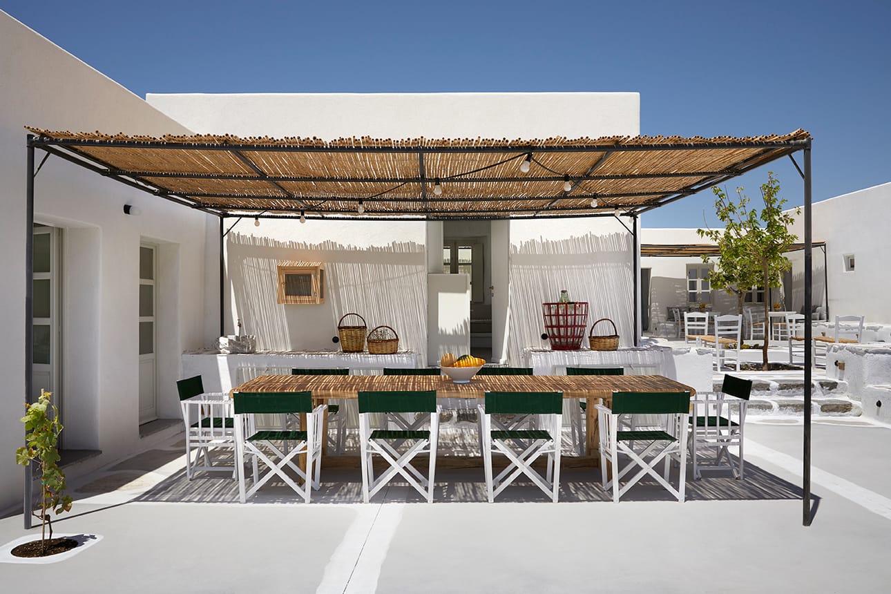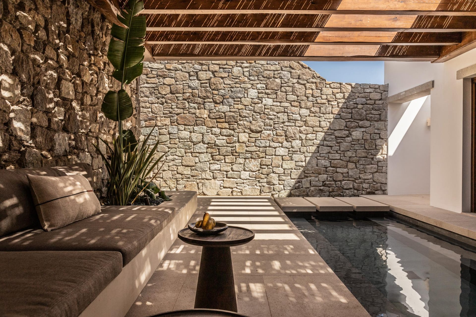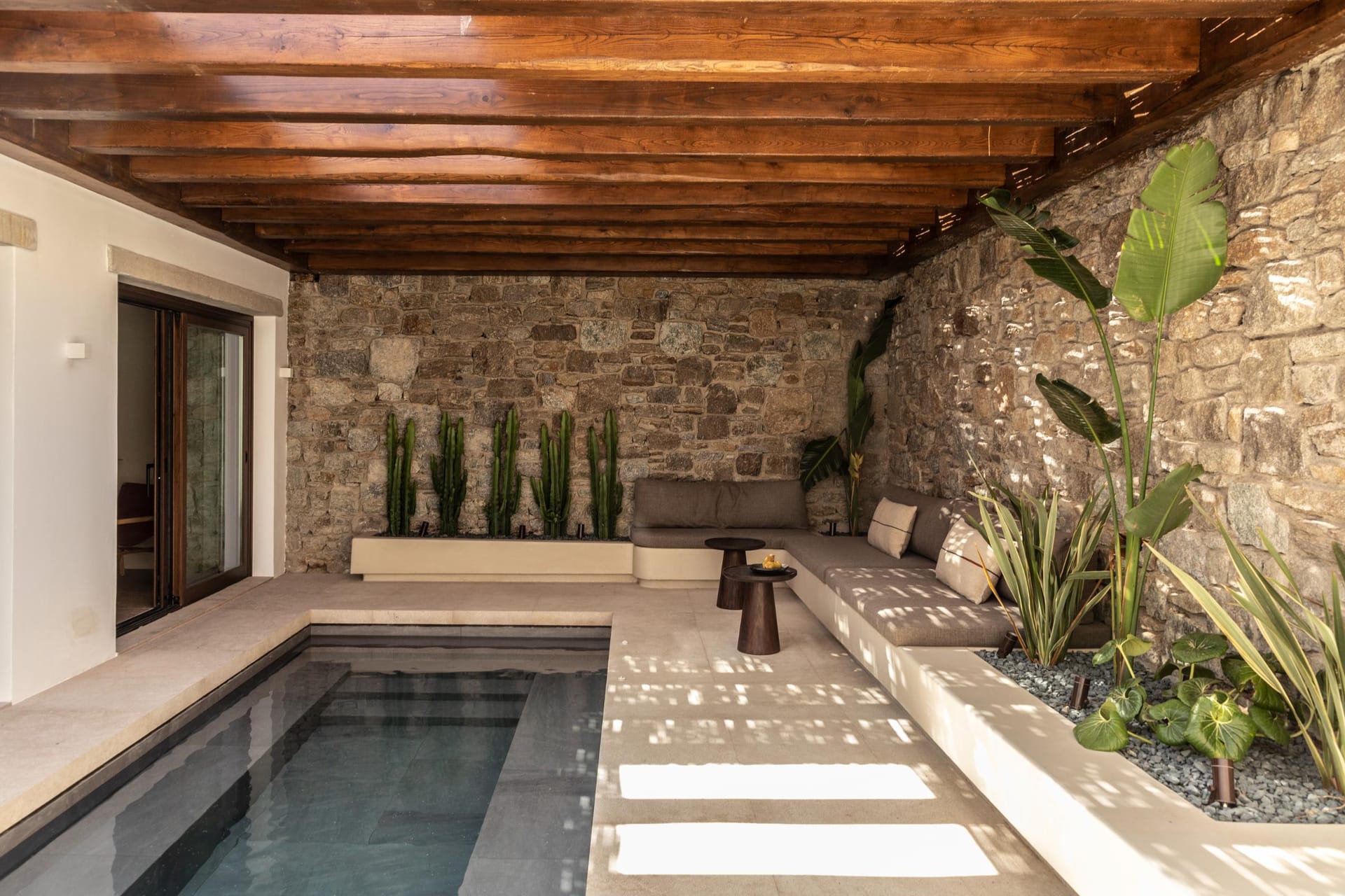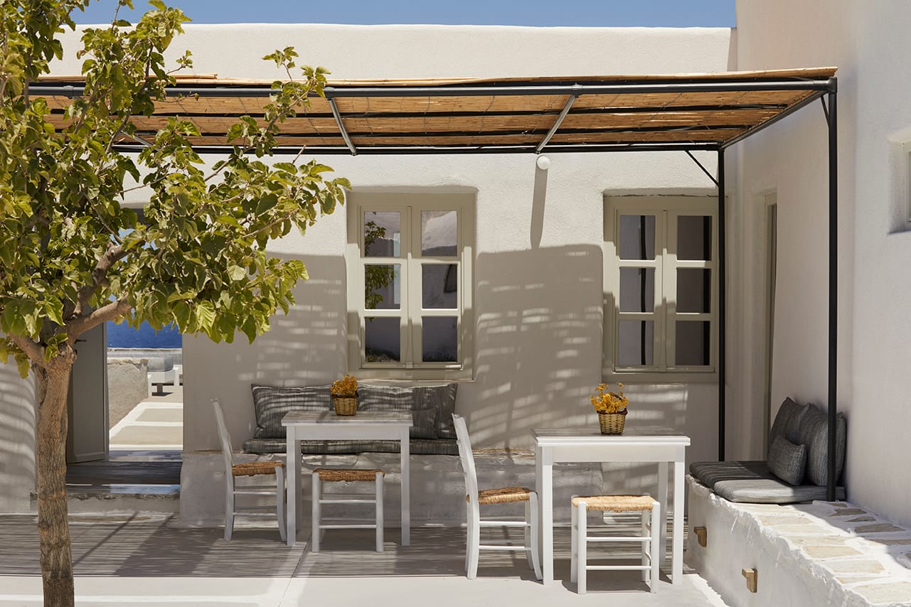 Santa Irini Retreat guarantees your privacy and can host in total 15 persons. It is a traditional residence developed in 3 separate suites (3 master bedrooms, each with a private lounge), two concept cave rooms, five bathrooms with showers, a traditional kitchen which also serves as a dining room, an interior yard with a view to the caldera and a swimming pool. It is surrounded by a young vineyard. It is designed in the shape of the greek capital letter “Π”, in order to protect its residents from the meltemia, the dry north-eastern winds of the Agean and offer them shaded areas all day long. Therefore, visitors can enjoy the spectacular view of the caldera and the surrounding islands of Ios, Sikinos and Folegandros, protected from the wind and the dazzling Mediterranean sun. Also, from the interior yard of the villa and through the vineyard, an impressive view of the Agia Irini church and its panigirospita stretches in front of their eyes. The suites, one of which is accessible to people with disabilities, are named after 3 women who have been an inspiration to the owners of Santa Irini Retreat: Margarita, Avgi and Theodossia. The location of each of them as well as the experience of their inside space reflect important aspects of these women’s lives.