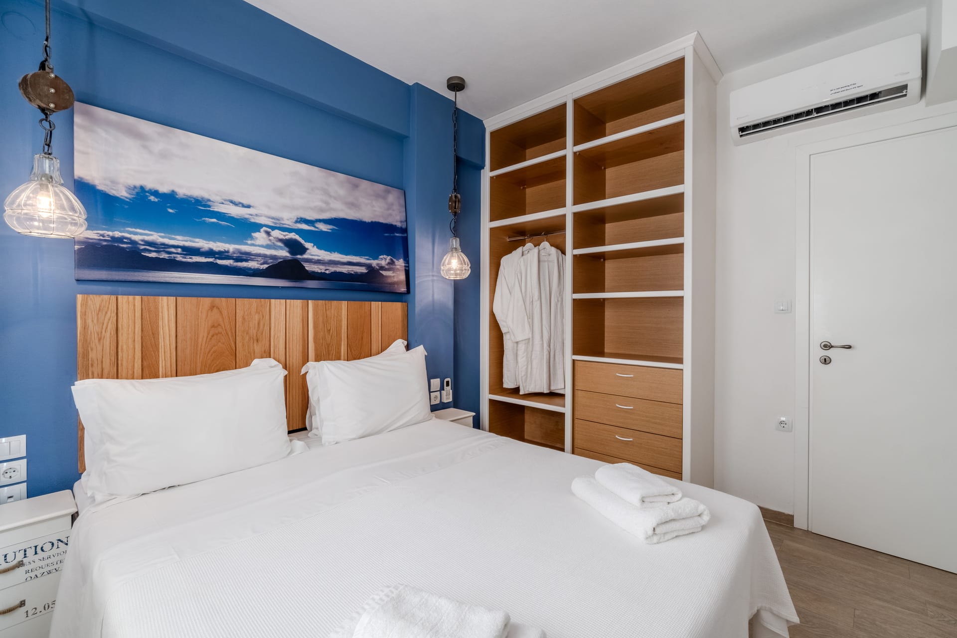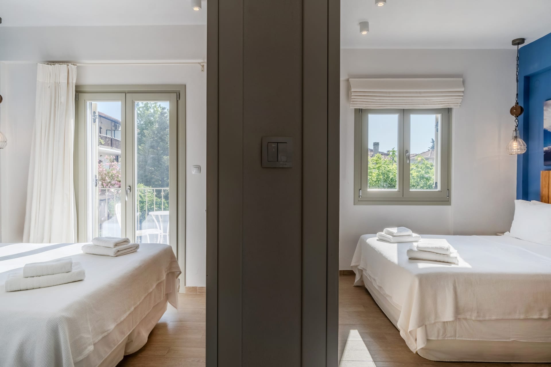 The cave house is in the heart of Oia. Very close to the center and away from all the hustle and bustle of the main street. ‘SUNSET Terrace’ cave house consists of two bedrooms with traditional style double beds and a living room with a large sofa bed.