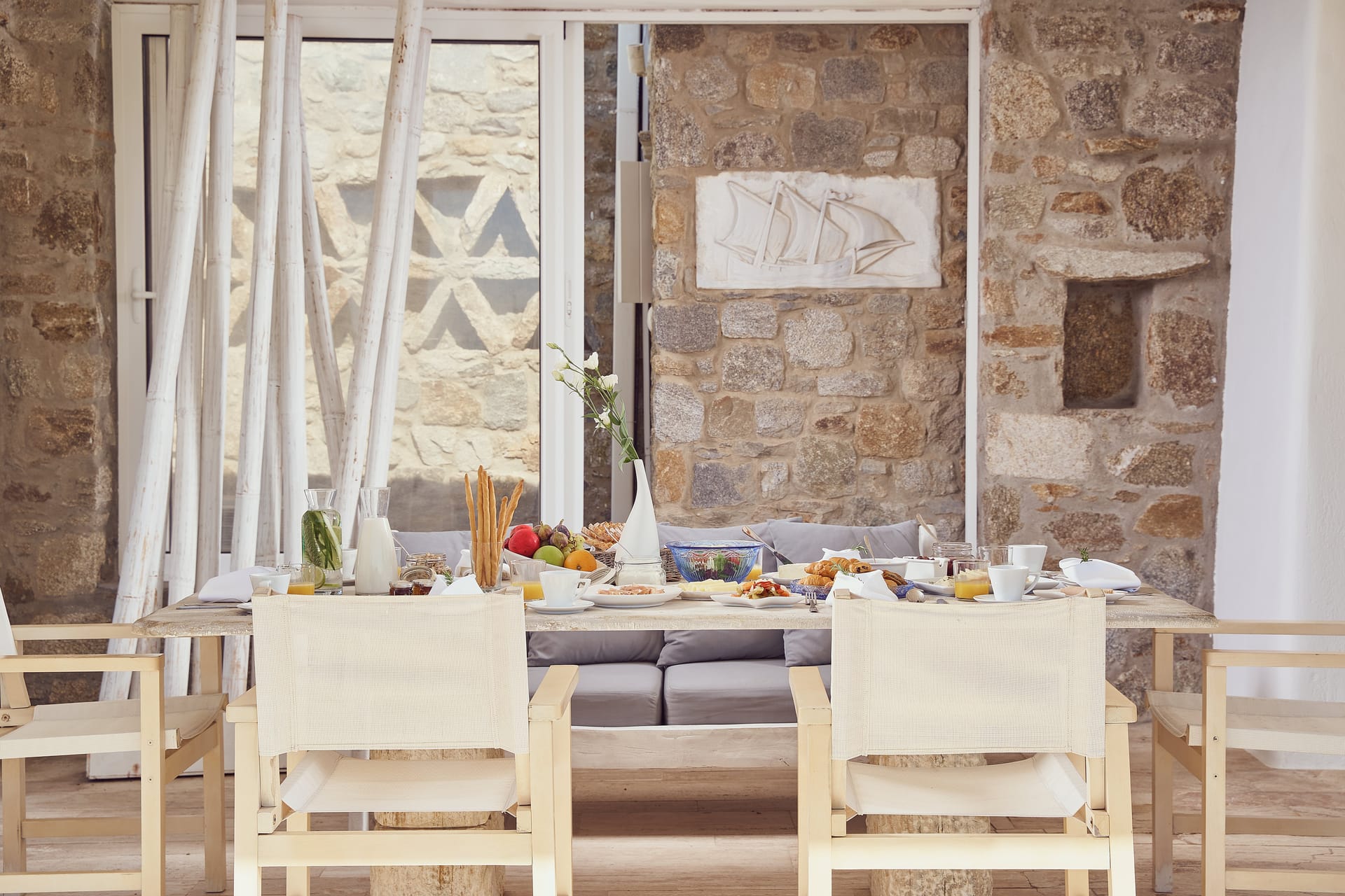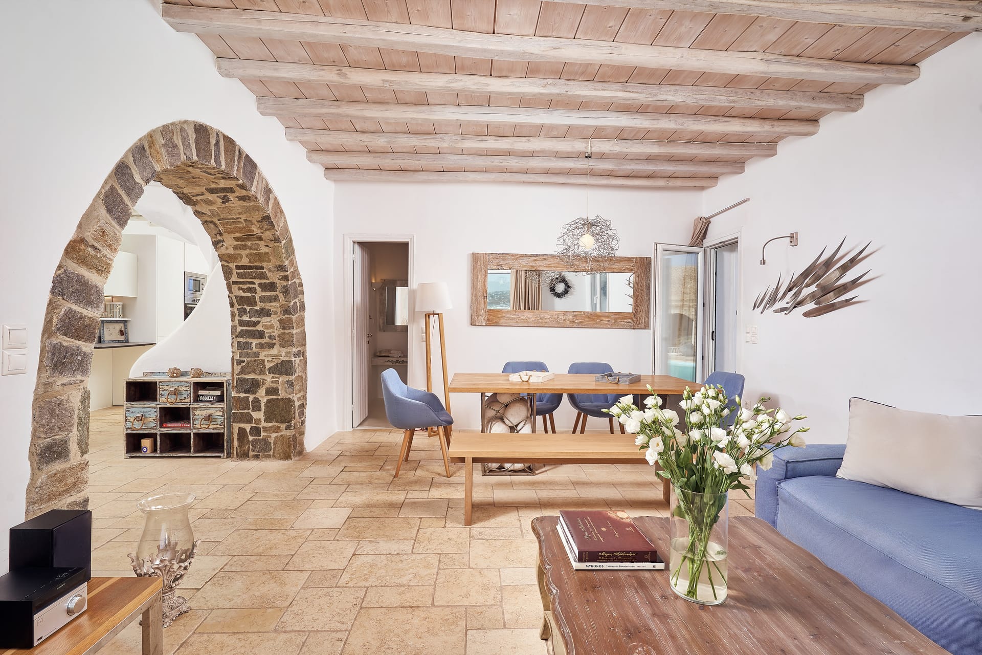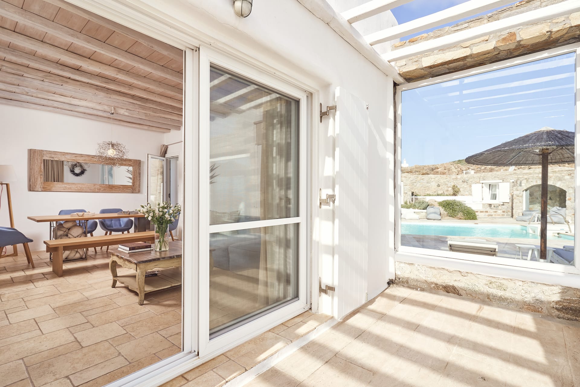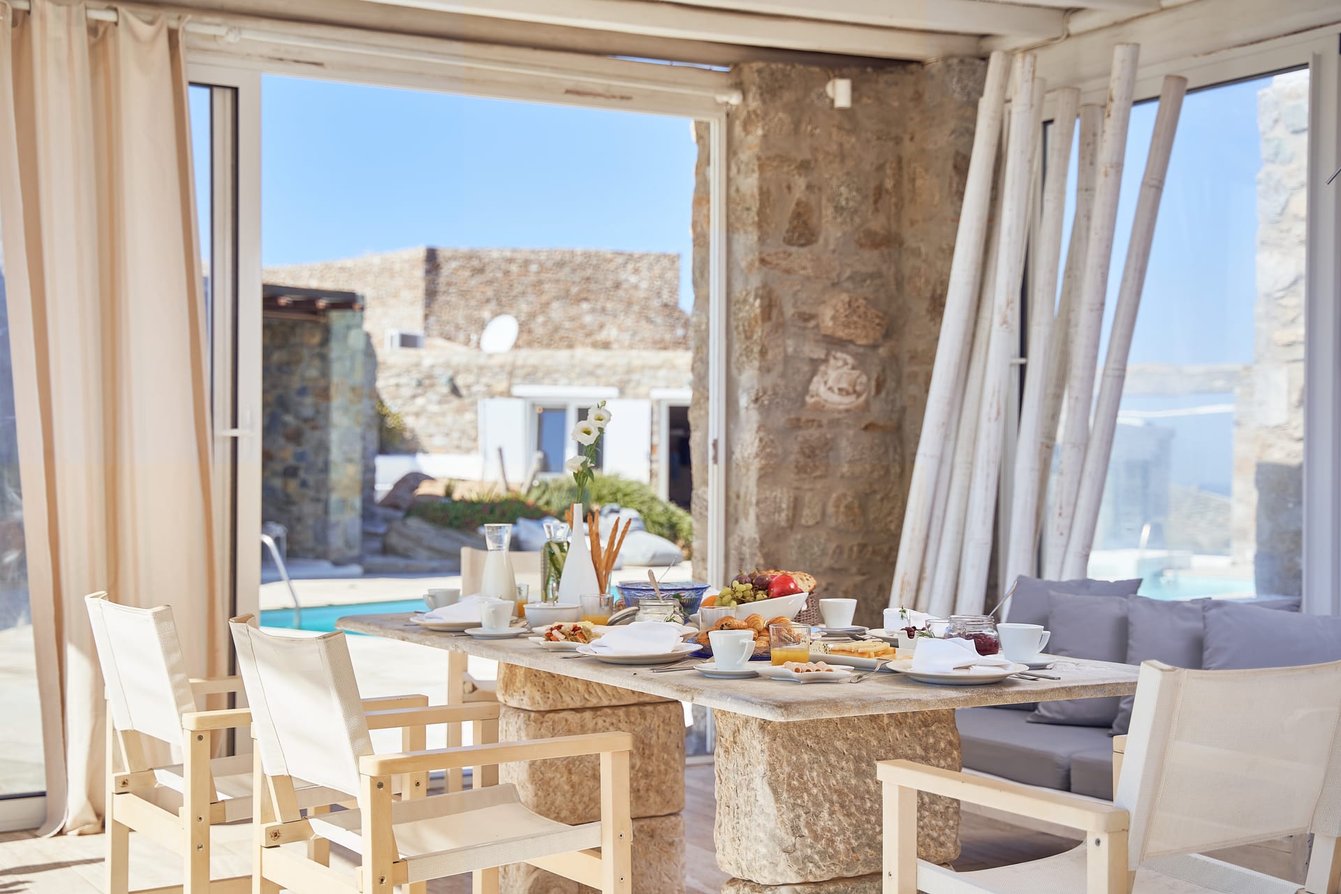 Near to some of the best and most famous restaurants and nightlife in Mykonos it combines style with comfort. Two bedrooms are in the main house and four are autonomous and separate around the private pool area. It offers a fully equipped kitchen and large living room with unique pieces of Cycladic art. Also 6 bathrooms traditionally built with local materials and 1 WC. Wide terraces surround the house, overlooking magnificent views of Chora, Mykonos town and the Aegean Sea. Breathtaking beauty, elegant decoration, and well-designed spaces position Ornos villa as the perfect option for your holidays in Mykonos.