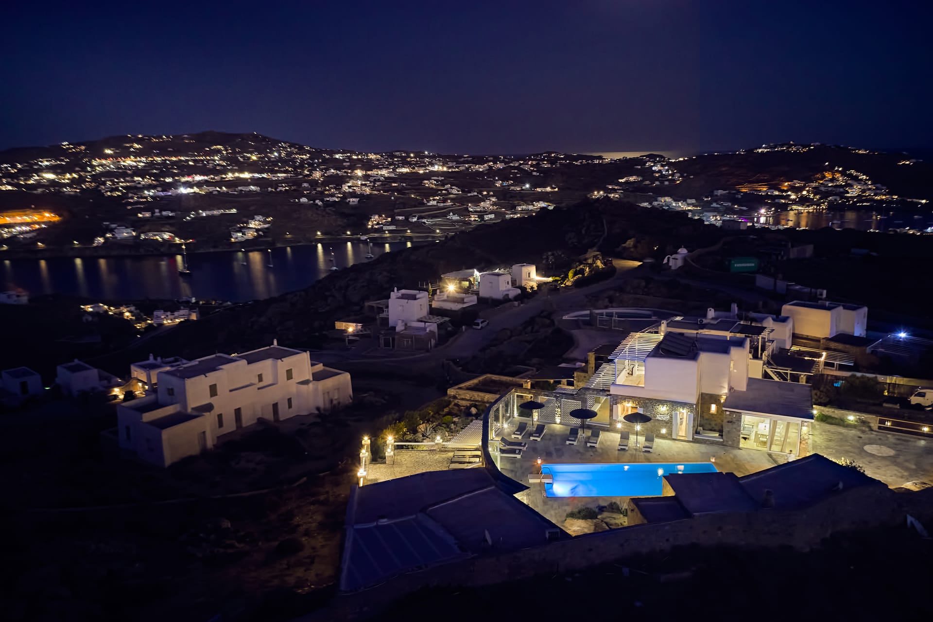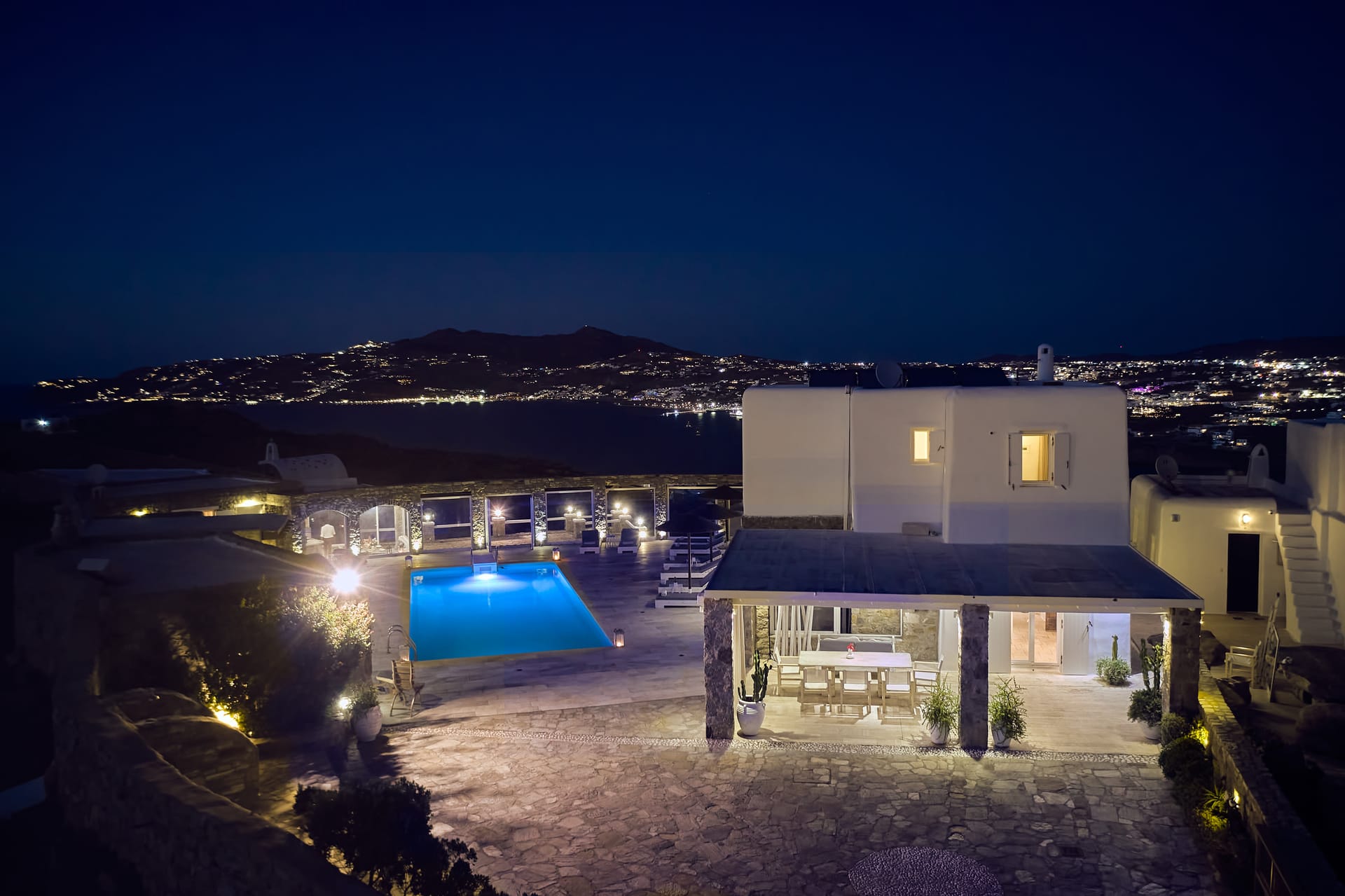 Villa Petrolefko in Ano Diakoftis (closed to Ornos area) is a luxurious residence of 6 spacious double bedrooms built with all modern-day facilities and comforts in traditional Cycladic architecture on beautiful landscapes overlooking the sea and offers tranquility, privacy and a spectacular view of Chora, the main town of Mykonos.