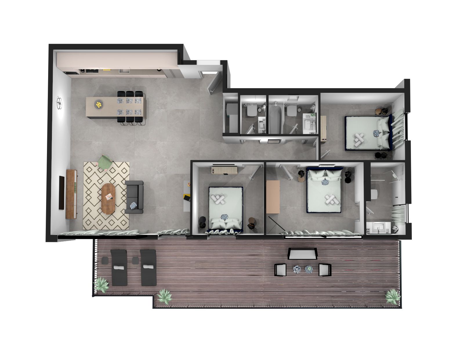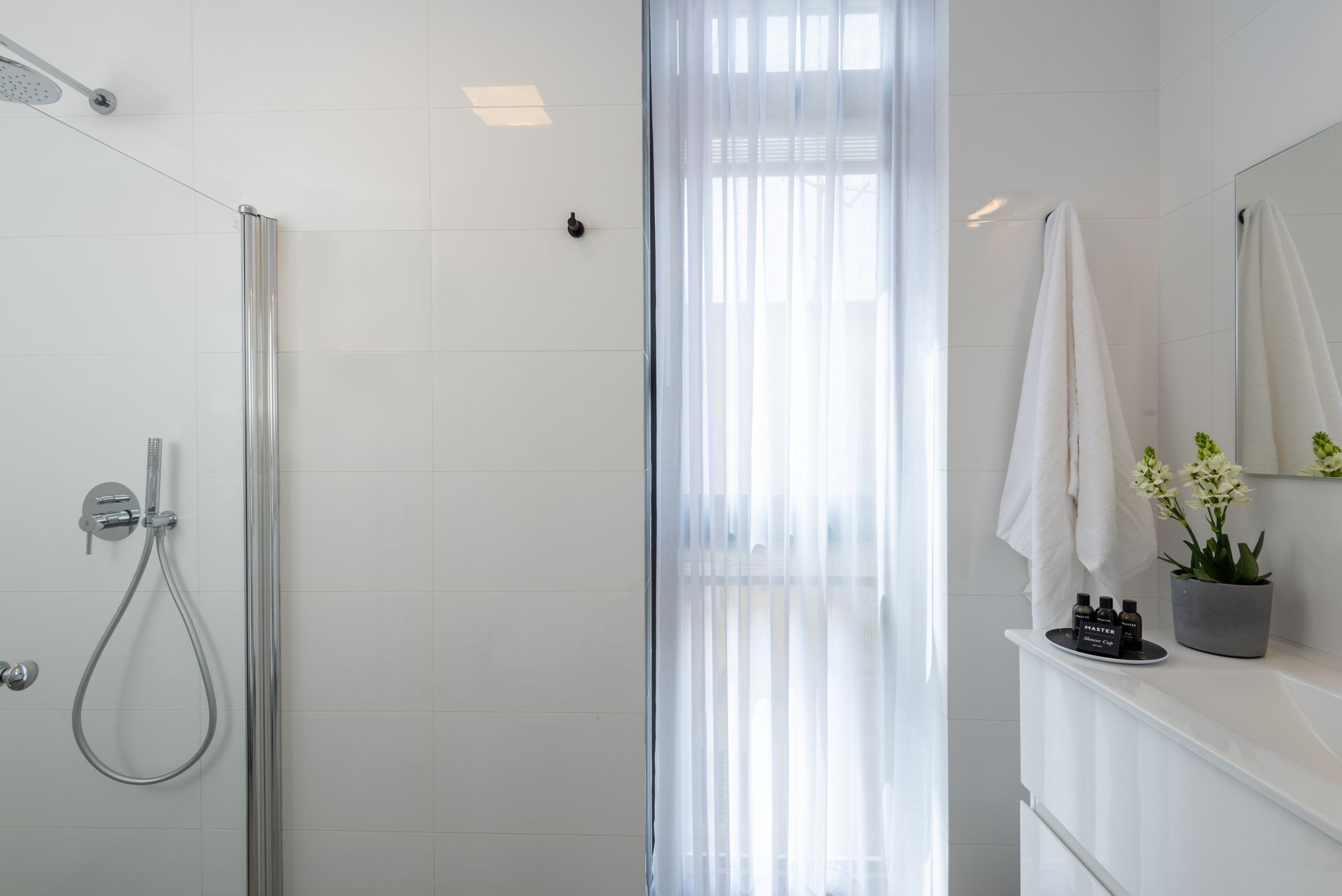 Our spacious 120 sq. m, Three-bedroom Serviced Apartment with 40 s.qm Big Terrace, accommodates up to 8 guests and is the ideal retreat for long family vacations and extended business stays. Large windows let in a profusion of natural light and offer great views of the White City.