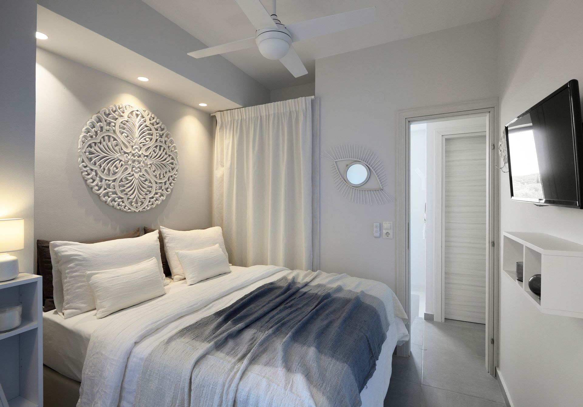 There is direct access to the outdoor seating area and your comfortable outdoor dining area from the ground floor so you would dine facing the Aegean Sea. Right next to it you will find your private pool and your comfortable sunbed with Moroccan pillows, shades-equipped for serene moments. The outdoor area also provides an outdoor shower with hot water. Enjoy a coffee or a cocktail in your private garden, which is filled with all kinds of Mediterranean aromas.