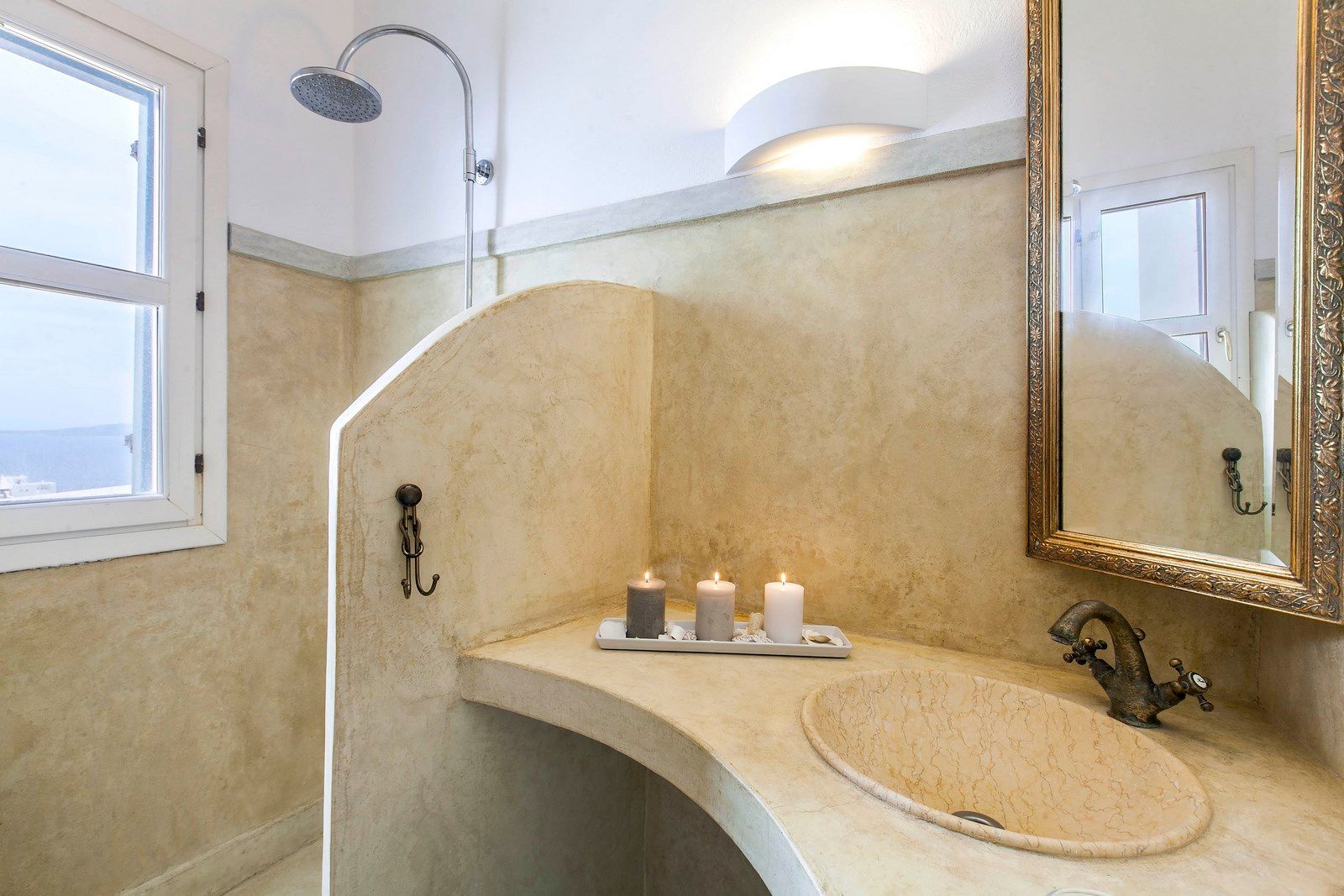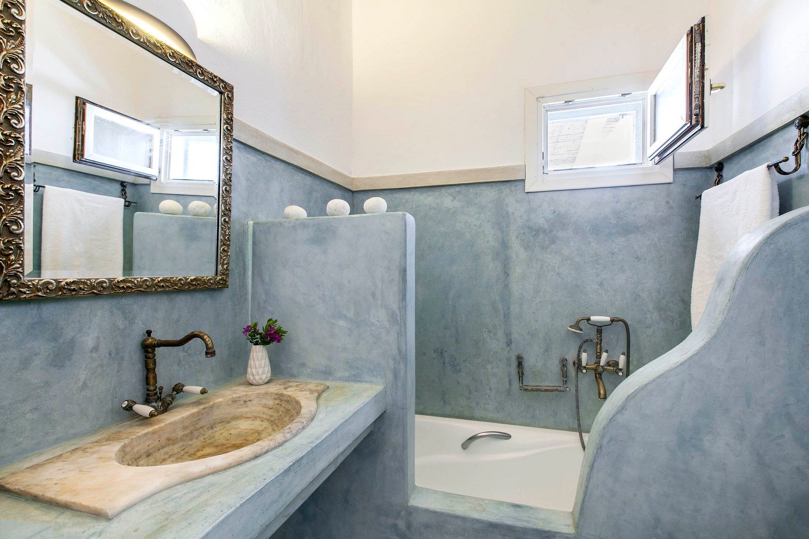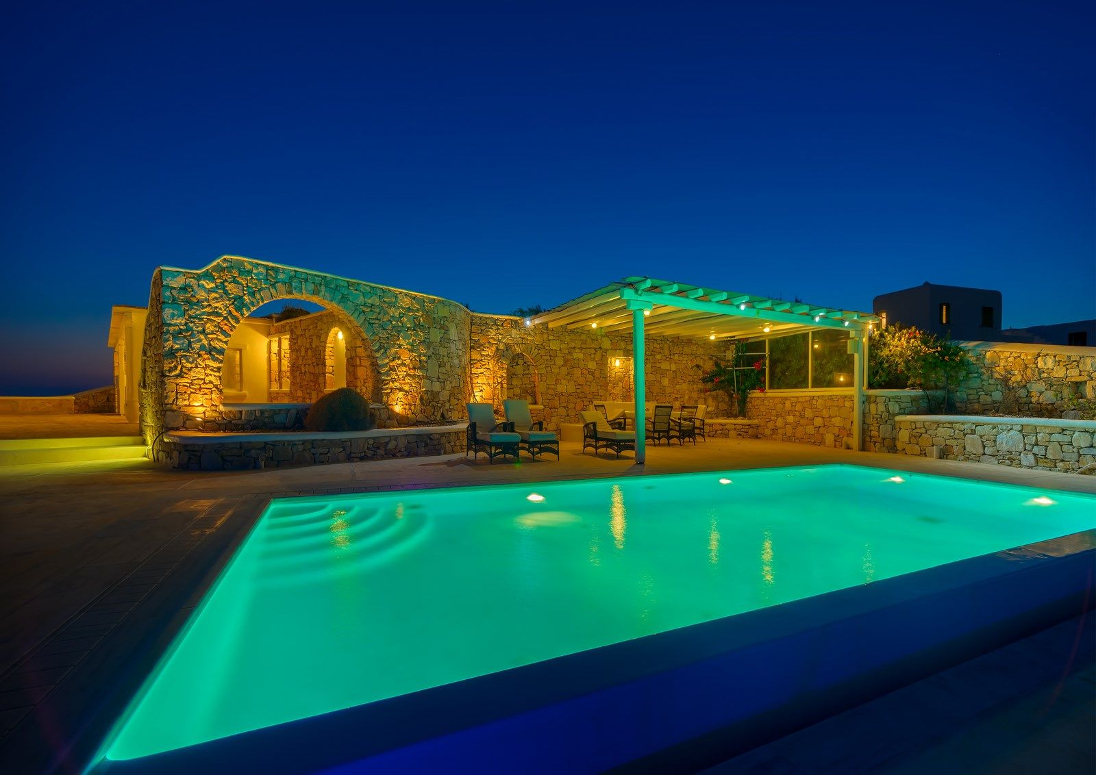 🏛️ White plaster, local stone, built-in couches, and wooden pergolas intertwined with Cycladic arches