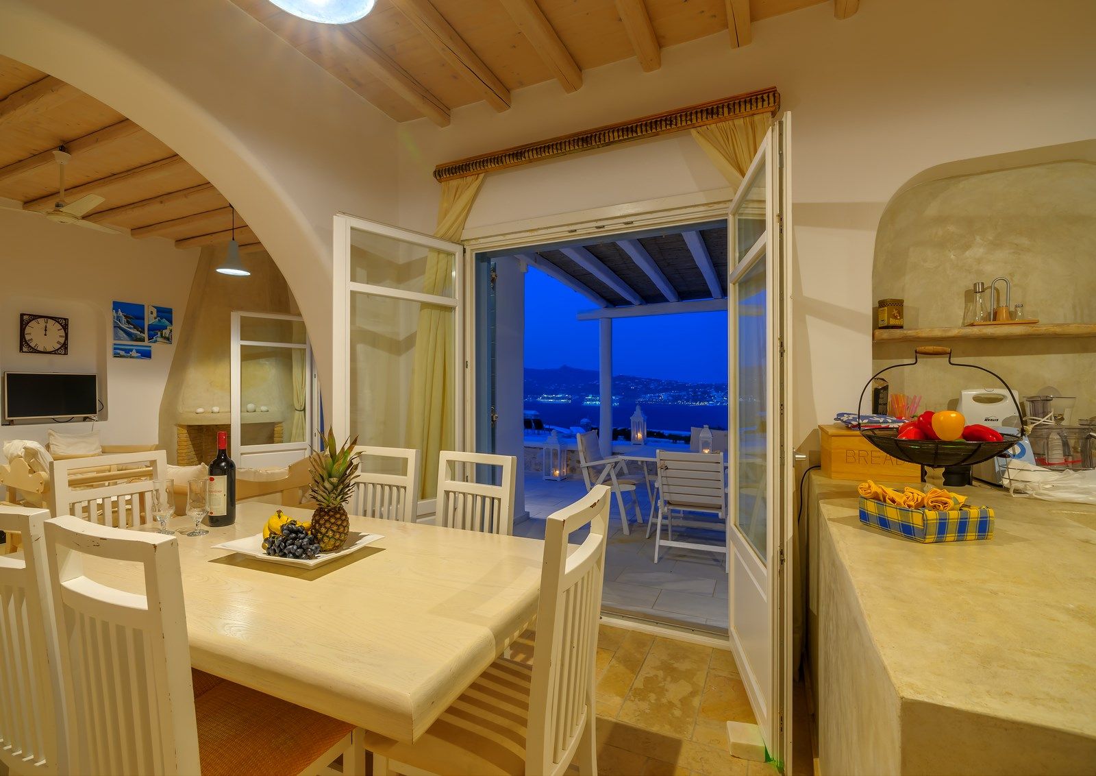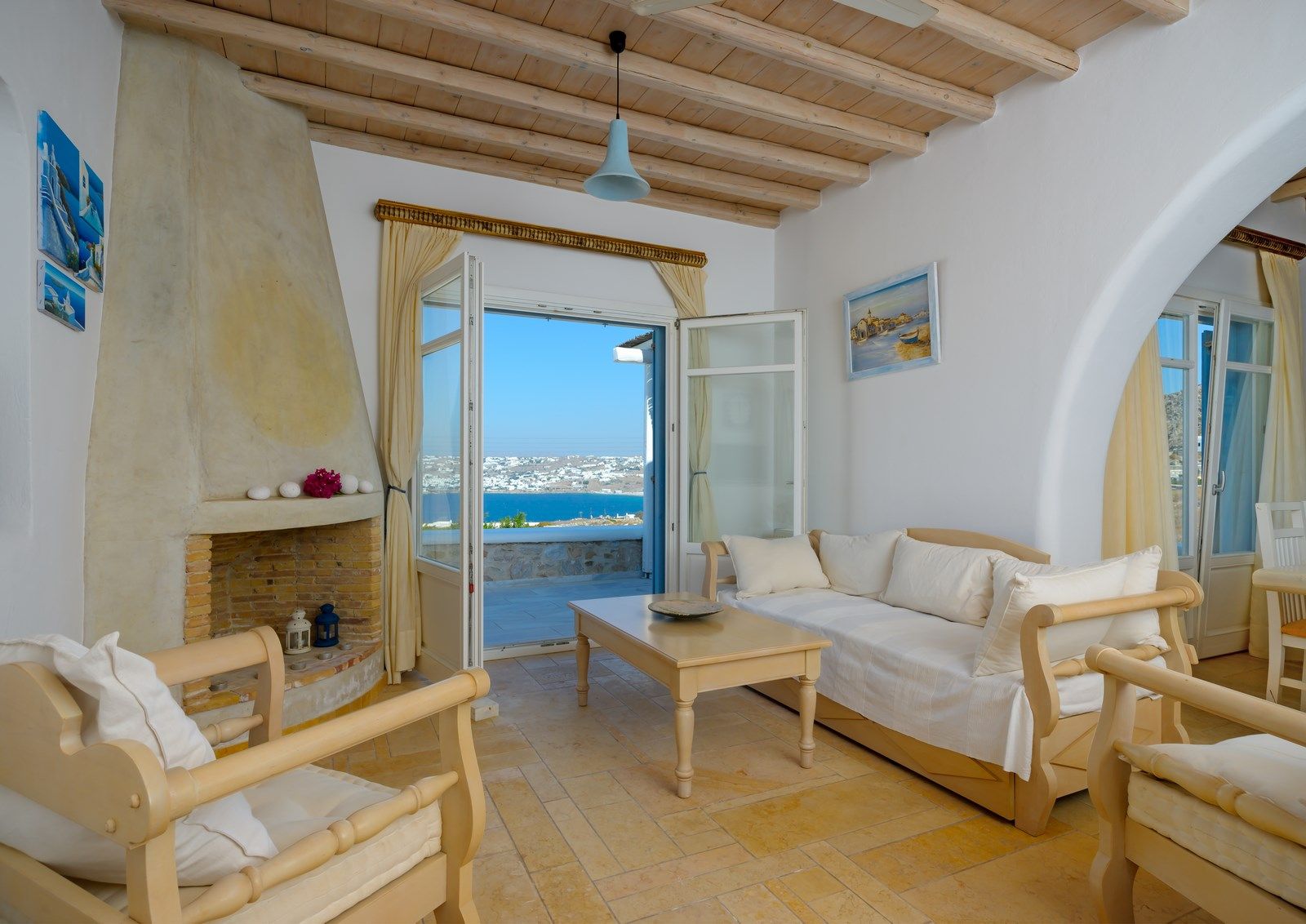 Renovated in 2020, the villa blends traditional Mykonian design—whitewashed walls, marble floors, wooden beams, and built-in furnishings—with modern comforts. Its idyllic setting is enhanced by a 10 sq.m. private pool, lush gardens, and expansive outdoor spaces designed for relaxation and recreation.