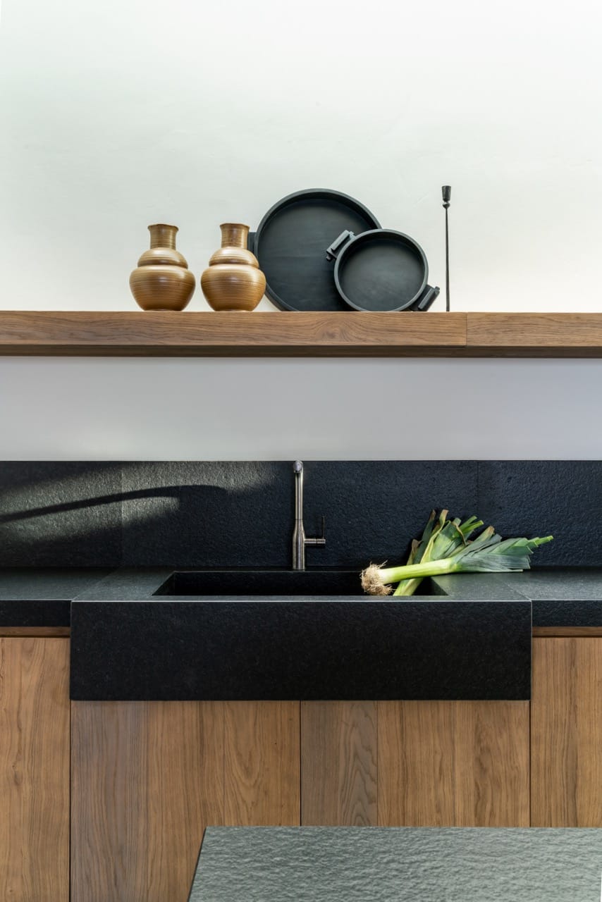 The earthy materials of this construction, such as stone and wood, as well as the rich garden with