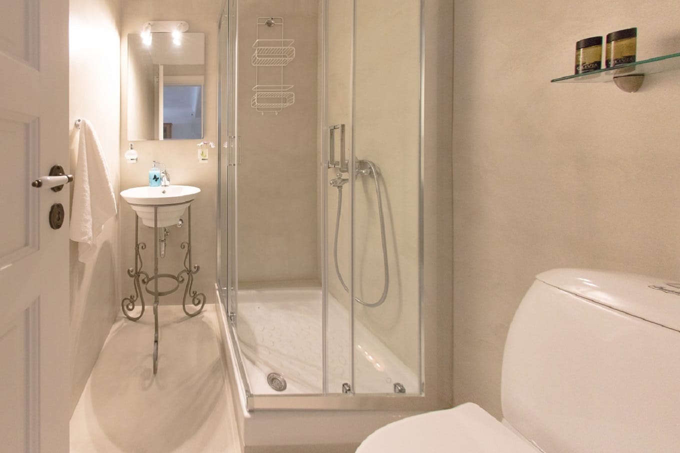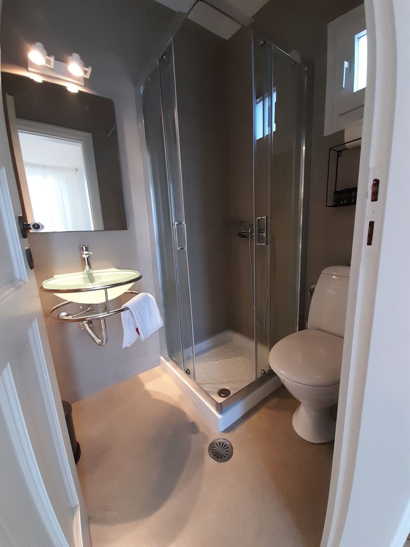 Two more bedrooms are on this level: one with a double size bed and the other one with two single beds. Both of these bedrooms have their own small verandas with views to the backyard of the estate. An additional bathroom with shower is also on this level.