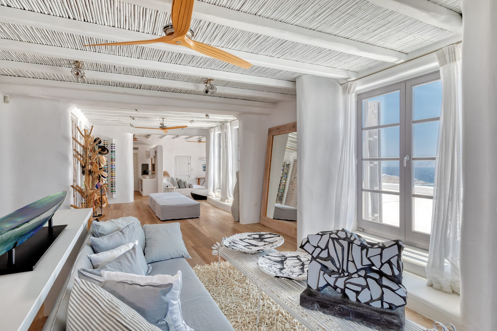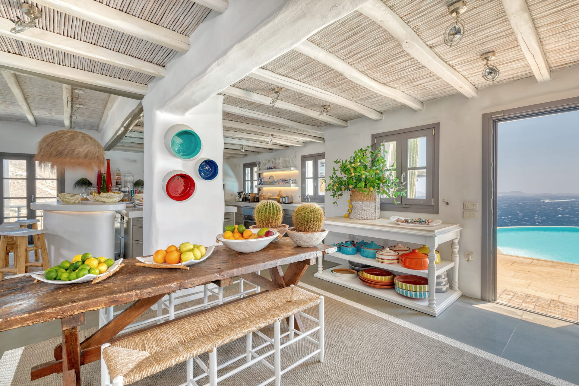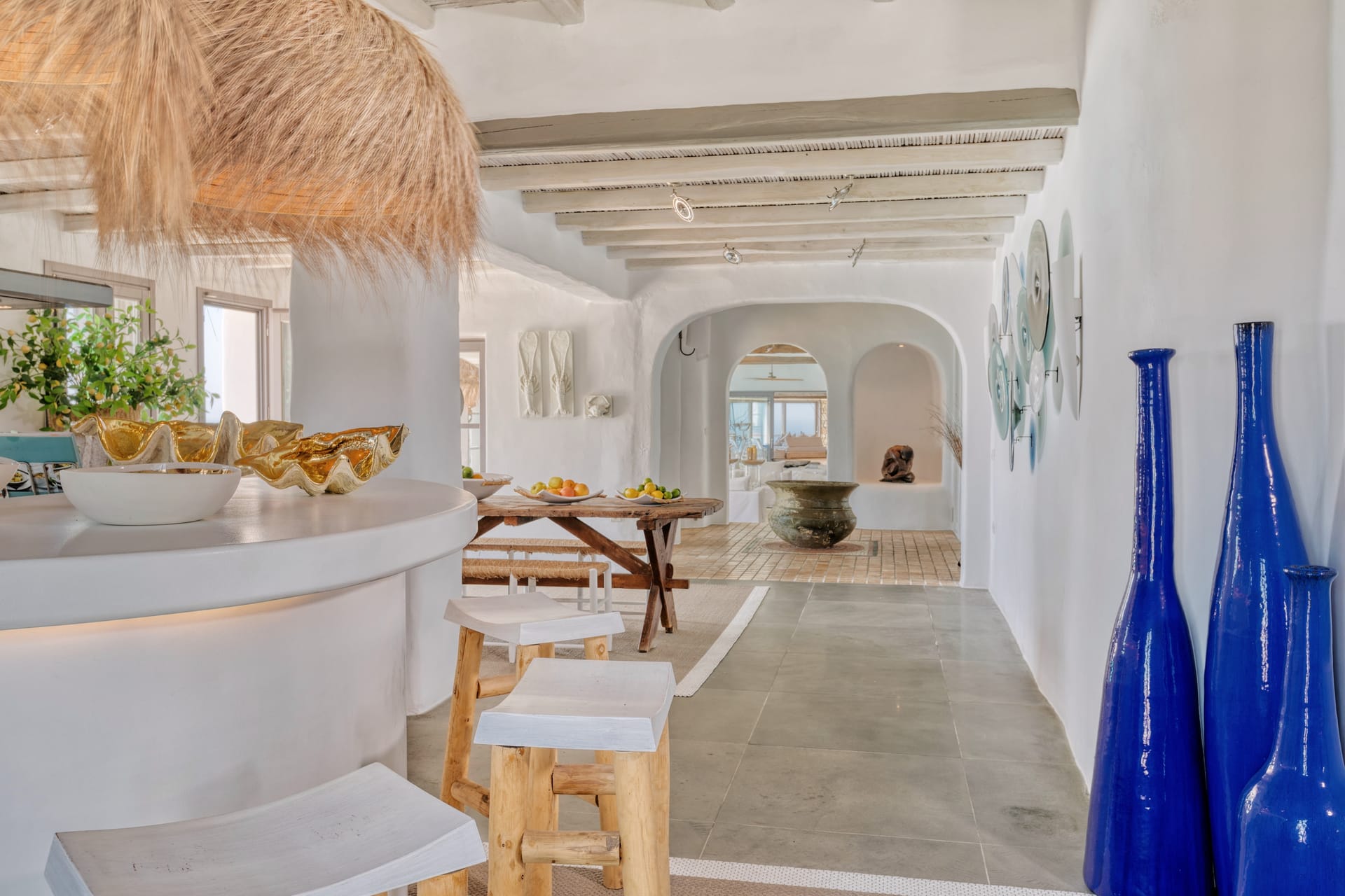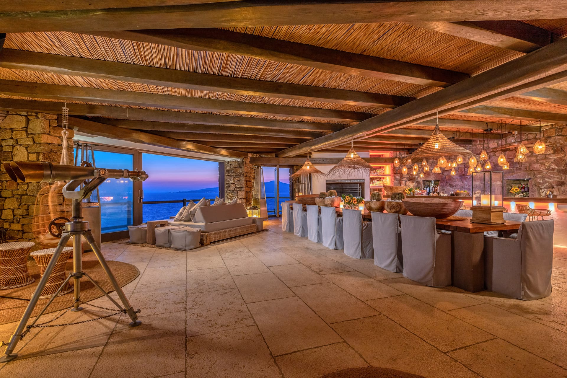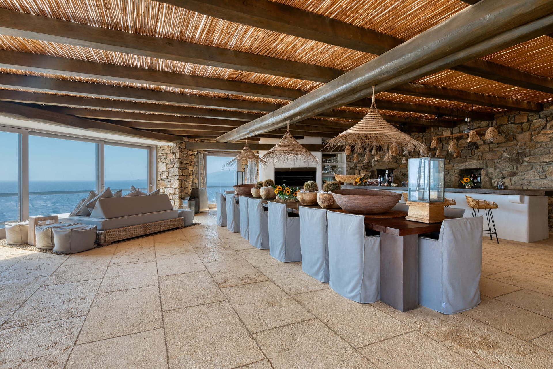 Upon entering through a charming courtyard, you’ll find a fully equipped chef’s kitchen with an inviting breakfast alcove and island seating. The expansive open-plan reception area serves as the heart of the villa, with various seating areas, a cozy fireplace, and multiple doors that open to the vast pool terrace. From here, you’ll enjoy unobstructed views of the sea and Delos Island. The formal dining area is perfect for hosting sophisticated dinners.