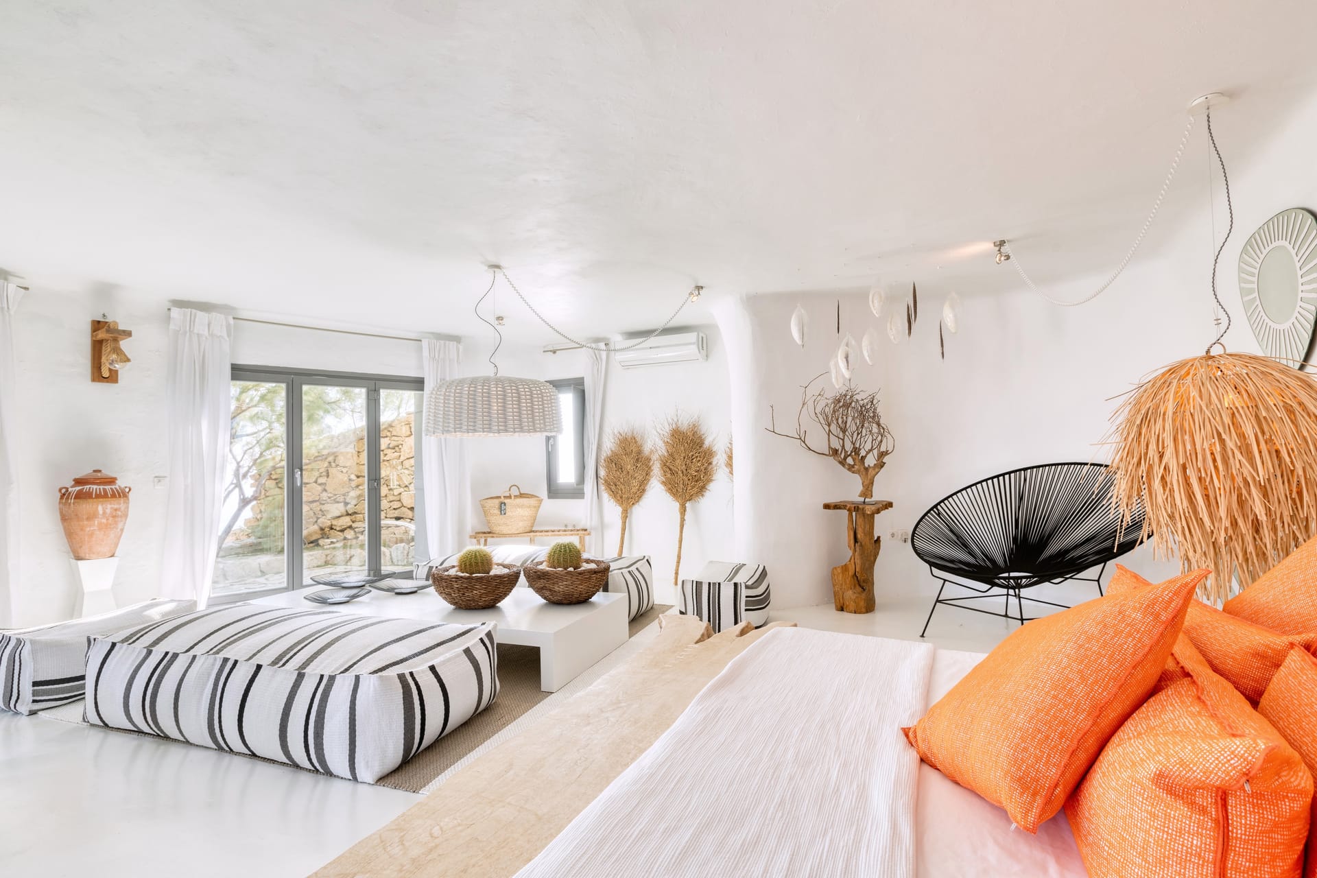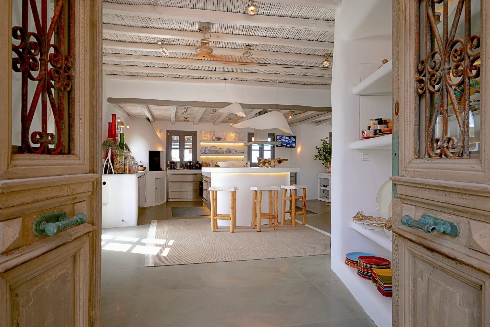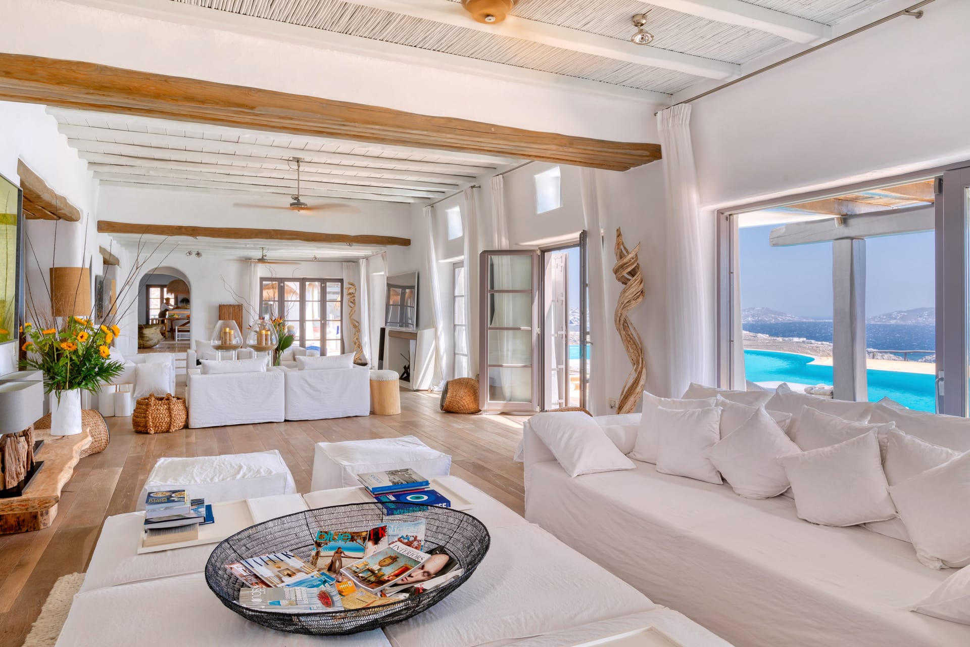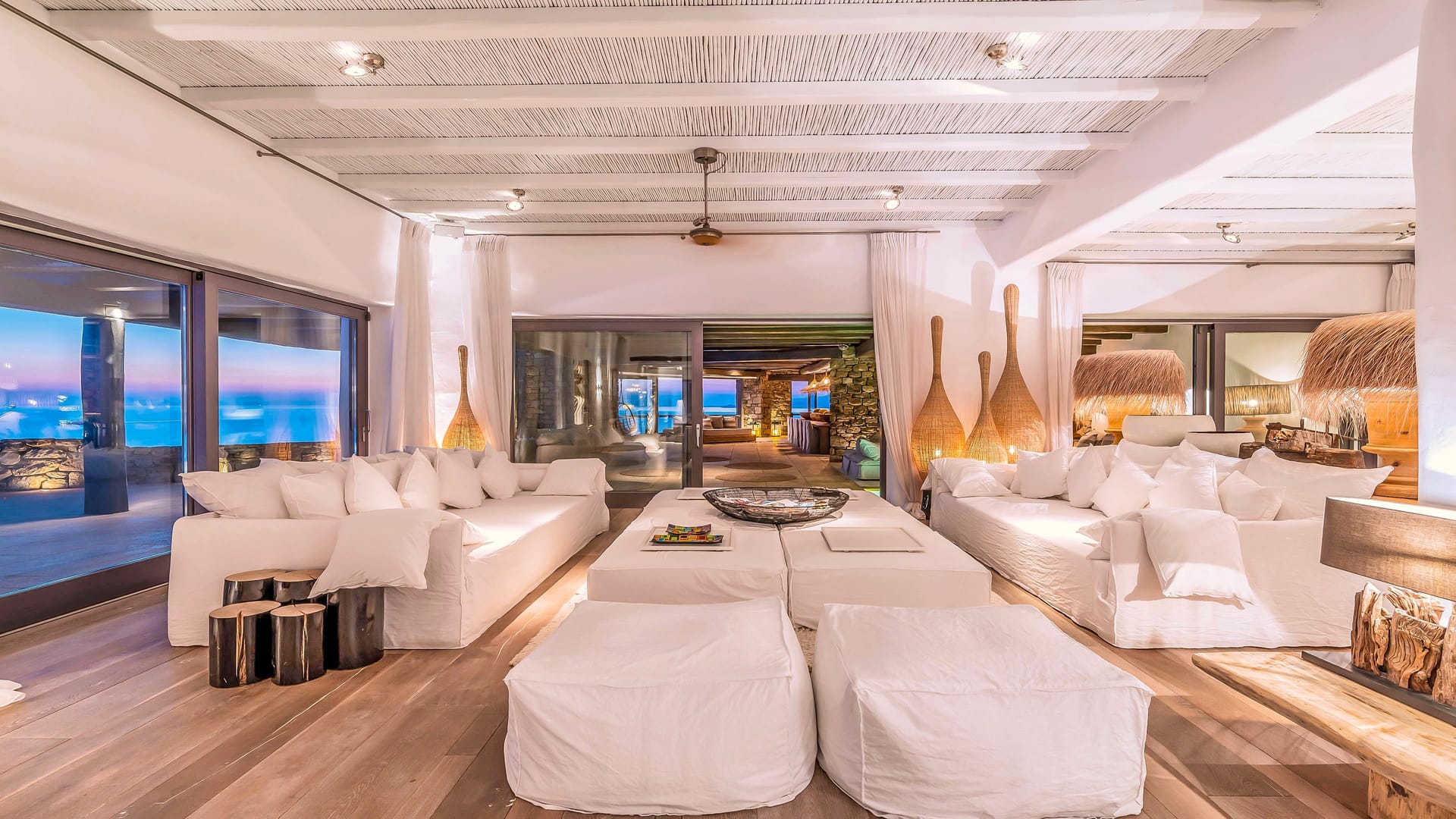 Upon entering through a charming courtyard, you’ll find a fully equipped chef’s kitchen with an inviting breakfast alcove and island seating. The expansive open-plan reception area serves as the heart of the villa, with various seating areas, a cozy fireplace, and multiple doors that open to the vast pool terrace. From here, you’ll enjoy unobstructed views of the sea and Delos Island. The formal dining area is perfect for hosting sophisticated dinners.