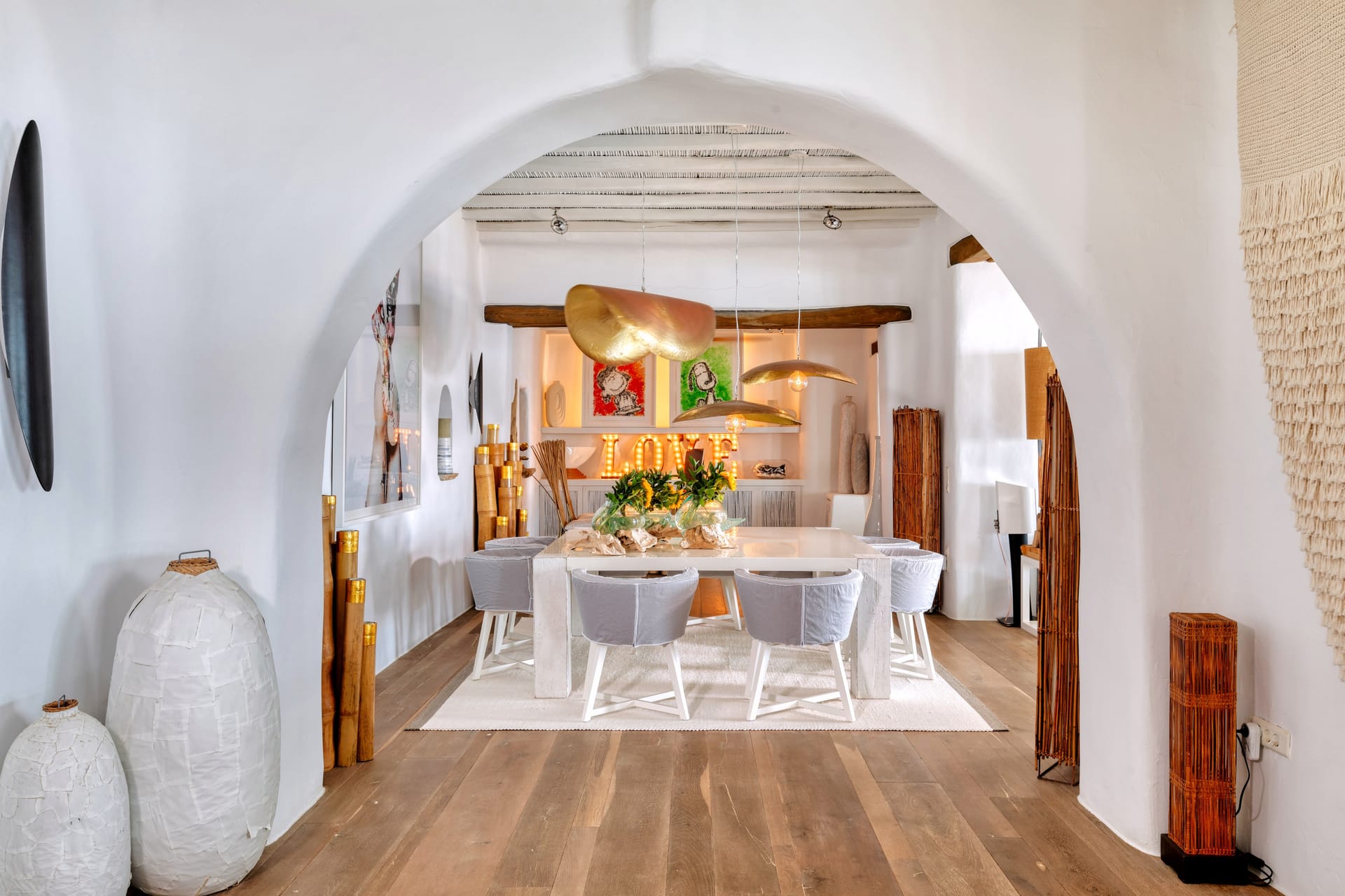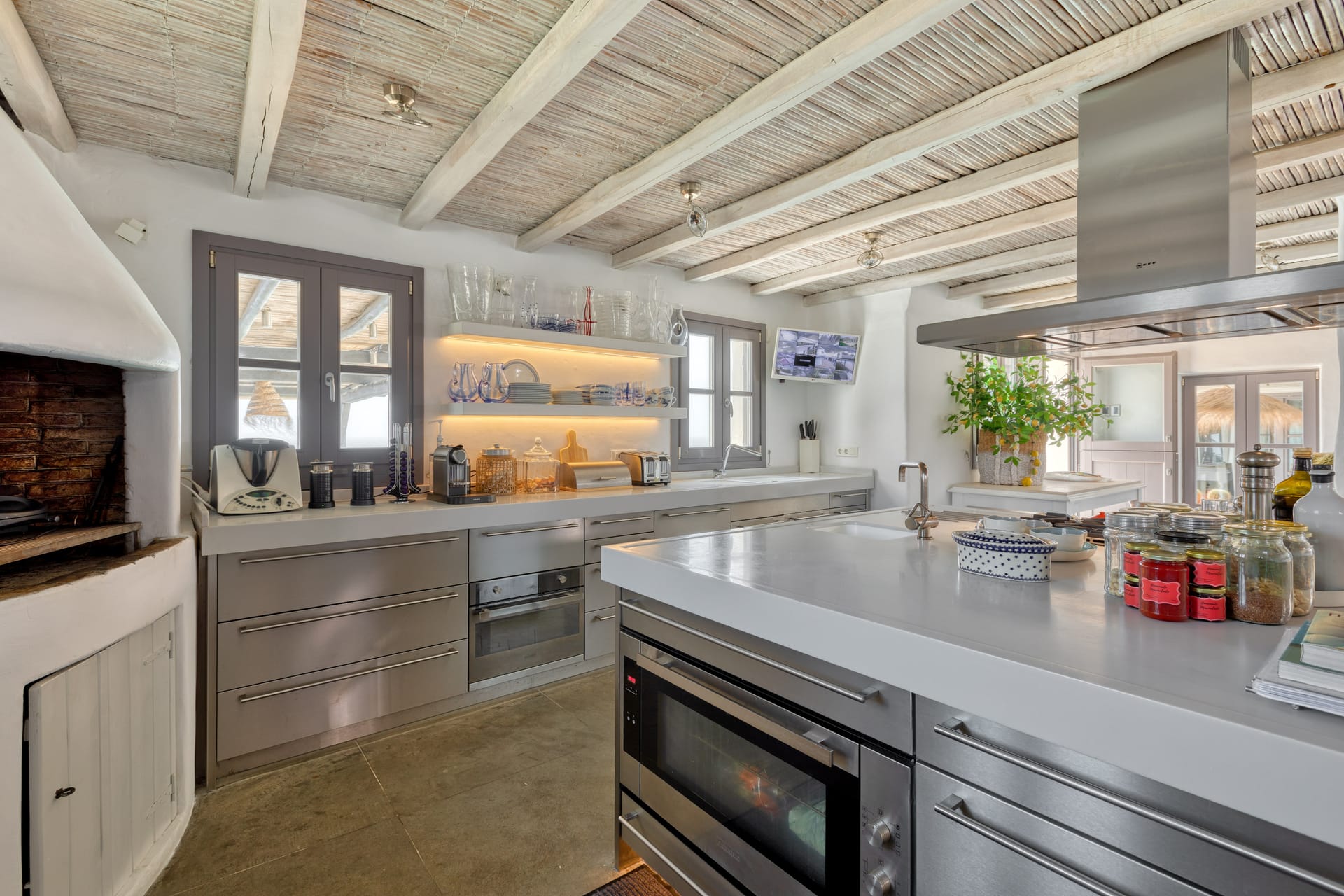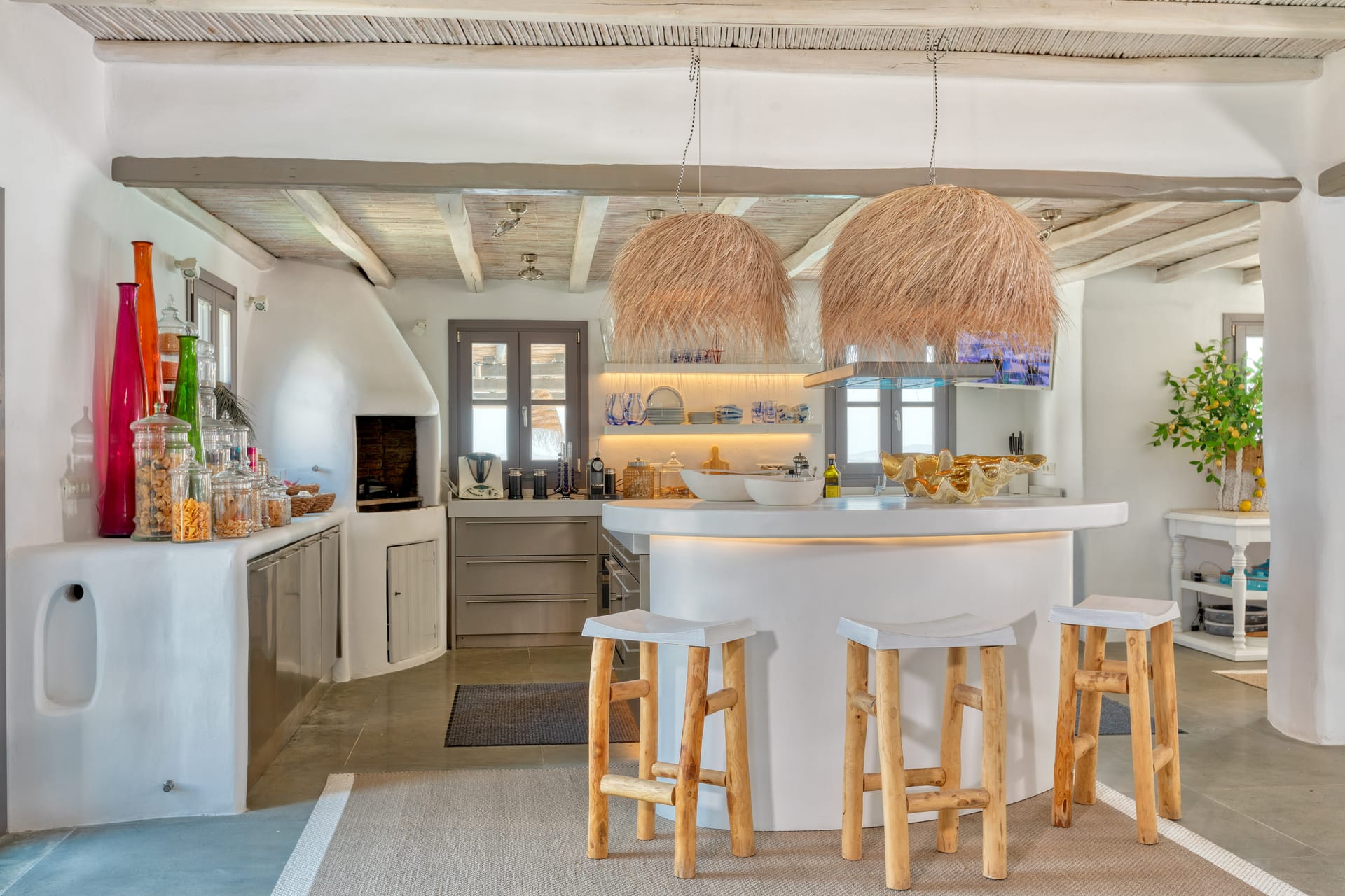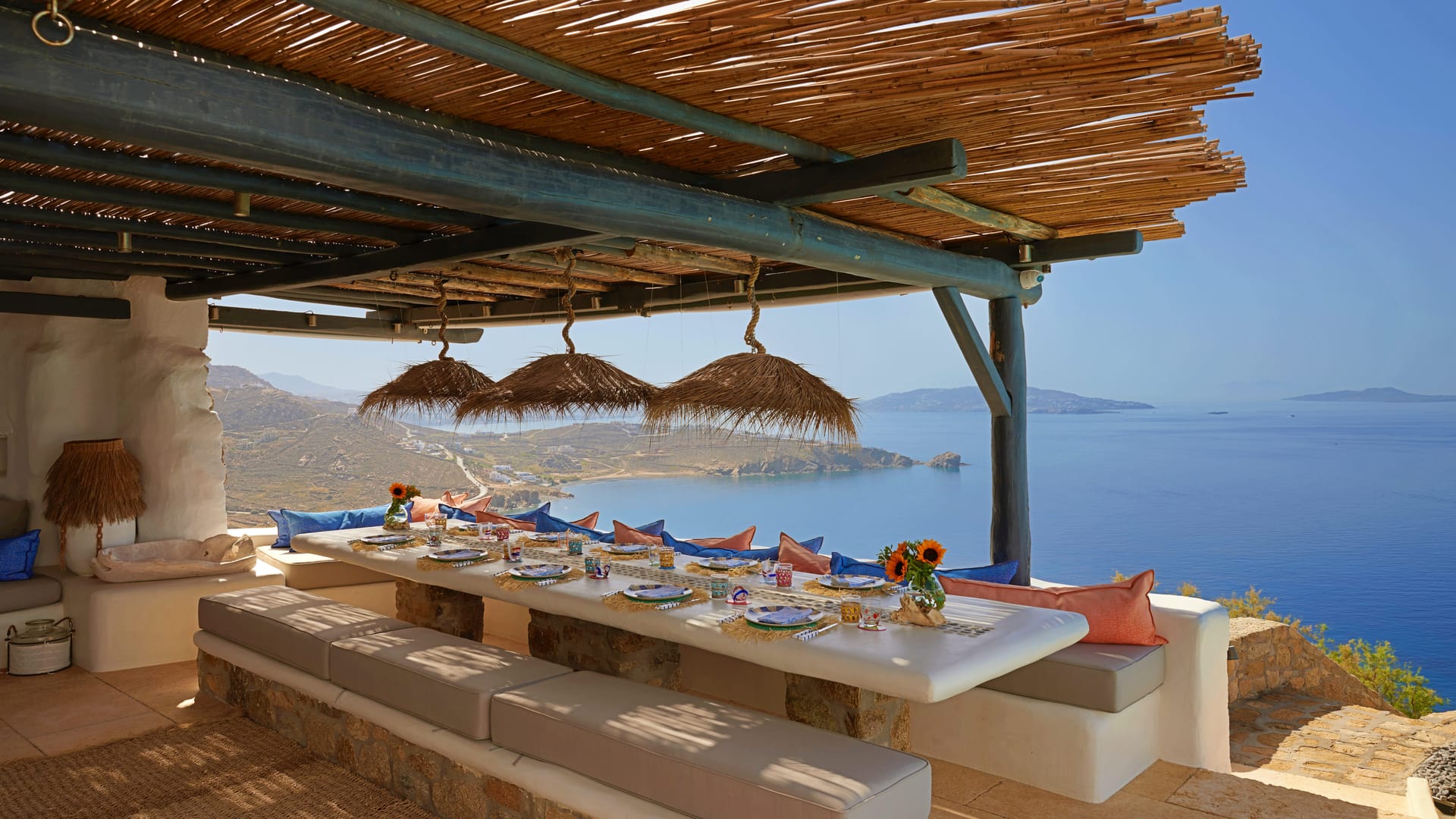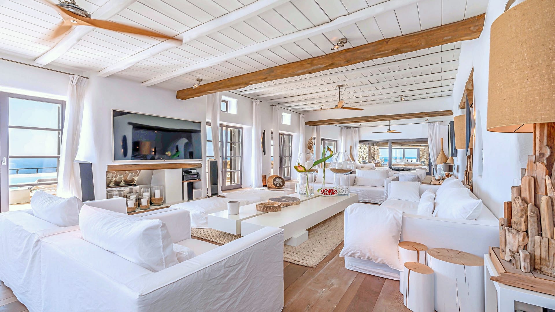 Upon entering through a charming courtyard, you’ll find a fully equipped chef’s kitchen with an inviting breakfast alcove and island seating. The expansive open-plan reception area serves as the heart of the villa, with various seating areas, a cozy fireplace, and multiple doors that open to the vast pool terrace. From here, you’ll enjoy unobstructed views of the sea and Delos Island. The formal dining area is perfect for hosting sophisticated dinners.