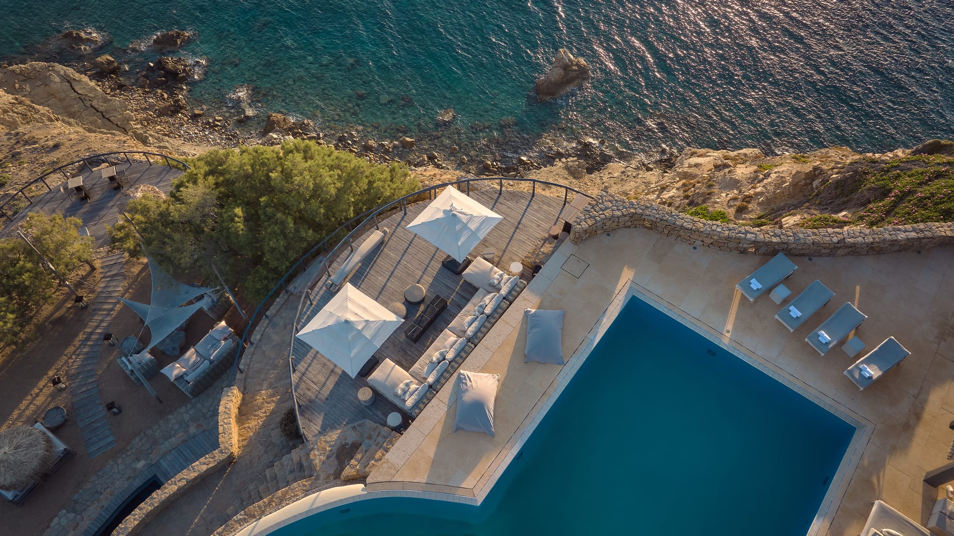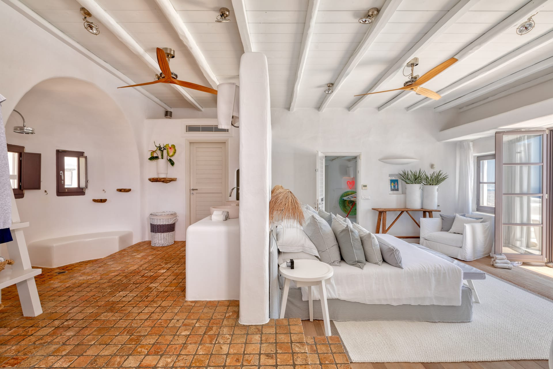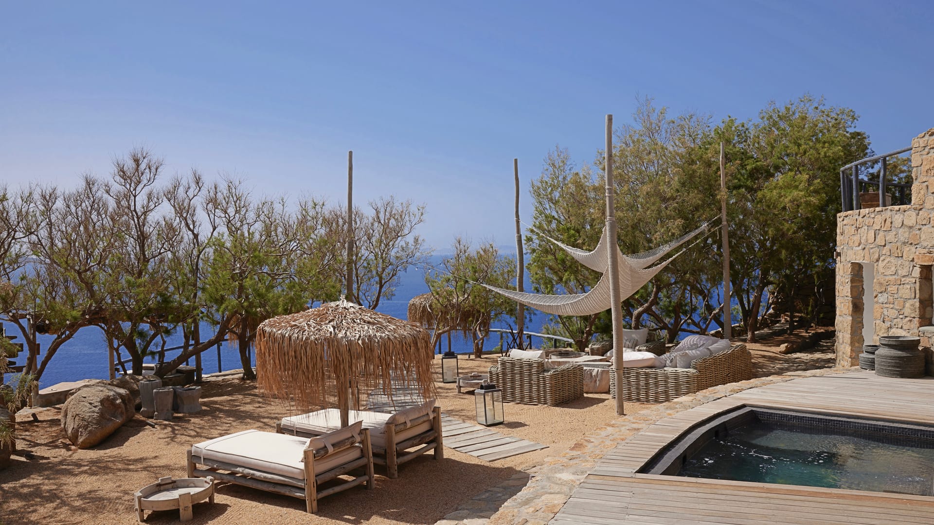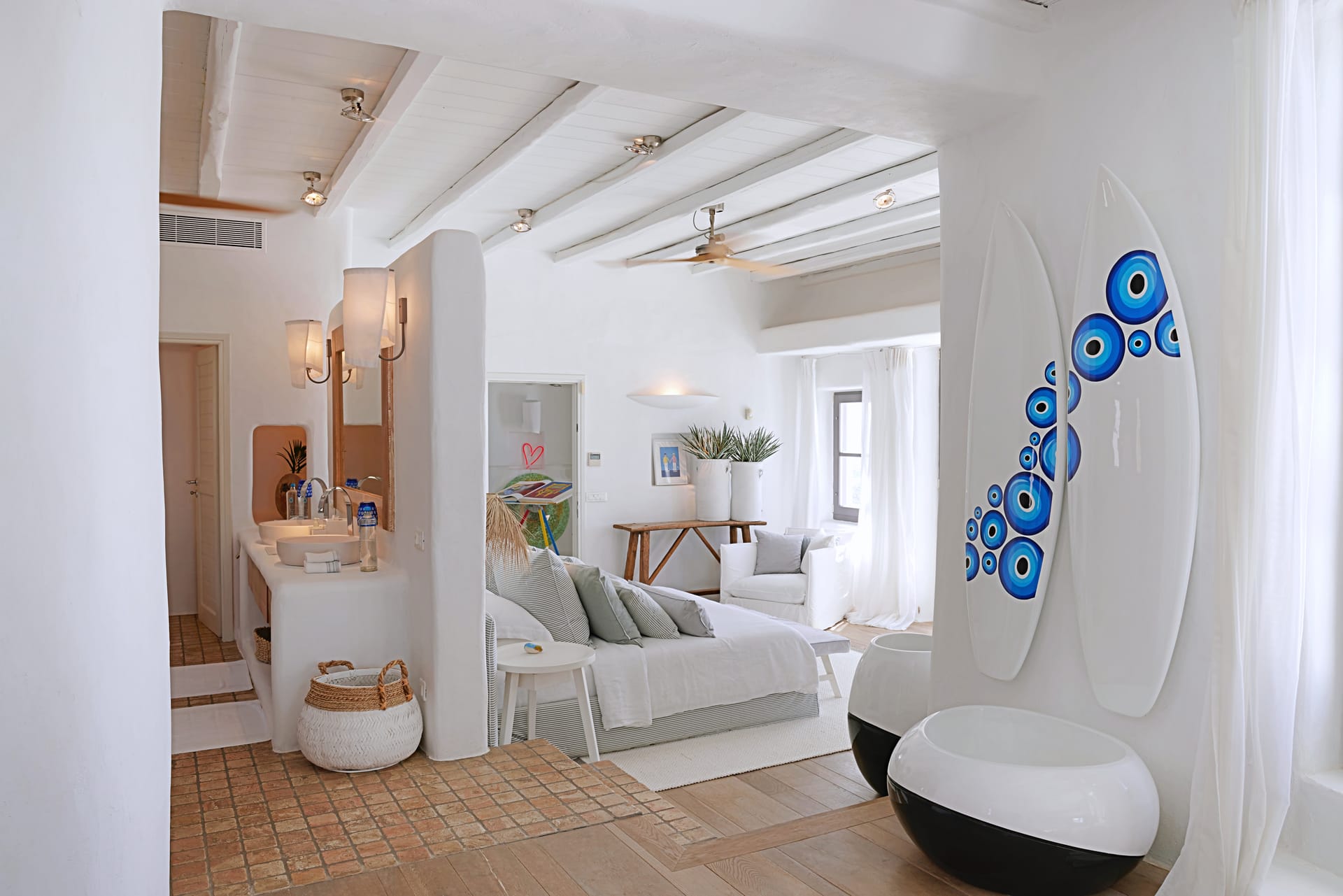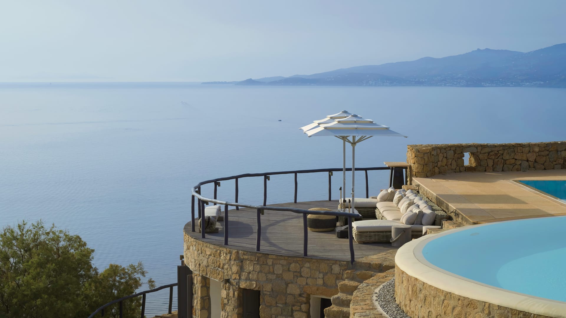 Step out from the suite onto a large private yoga terrace that offers unrivaled views of the pool and the Aegean Sea—an ideal space for yoga sessions or evening meditation, allowing you to connect with the natural beauty of Mykonos.