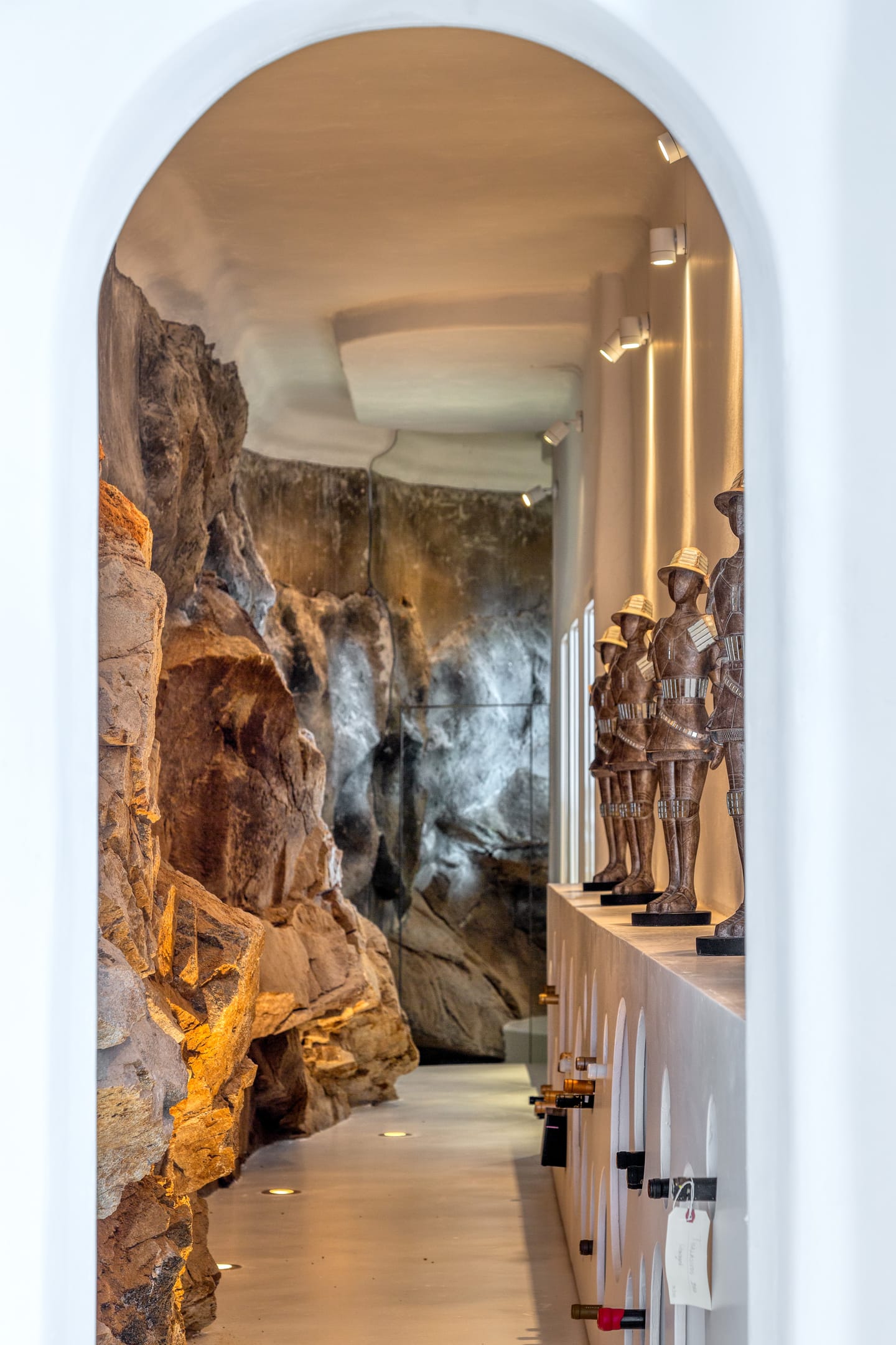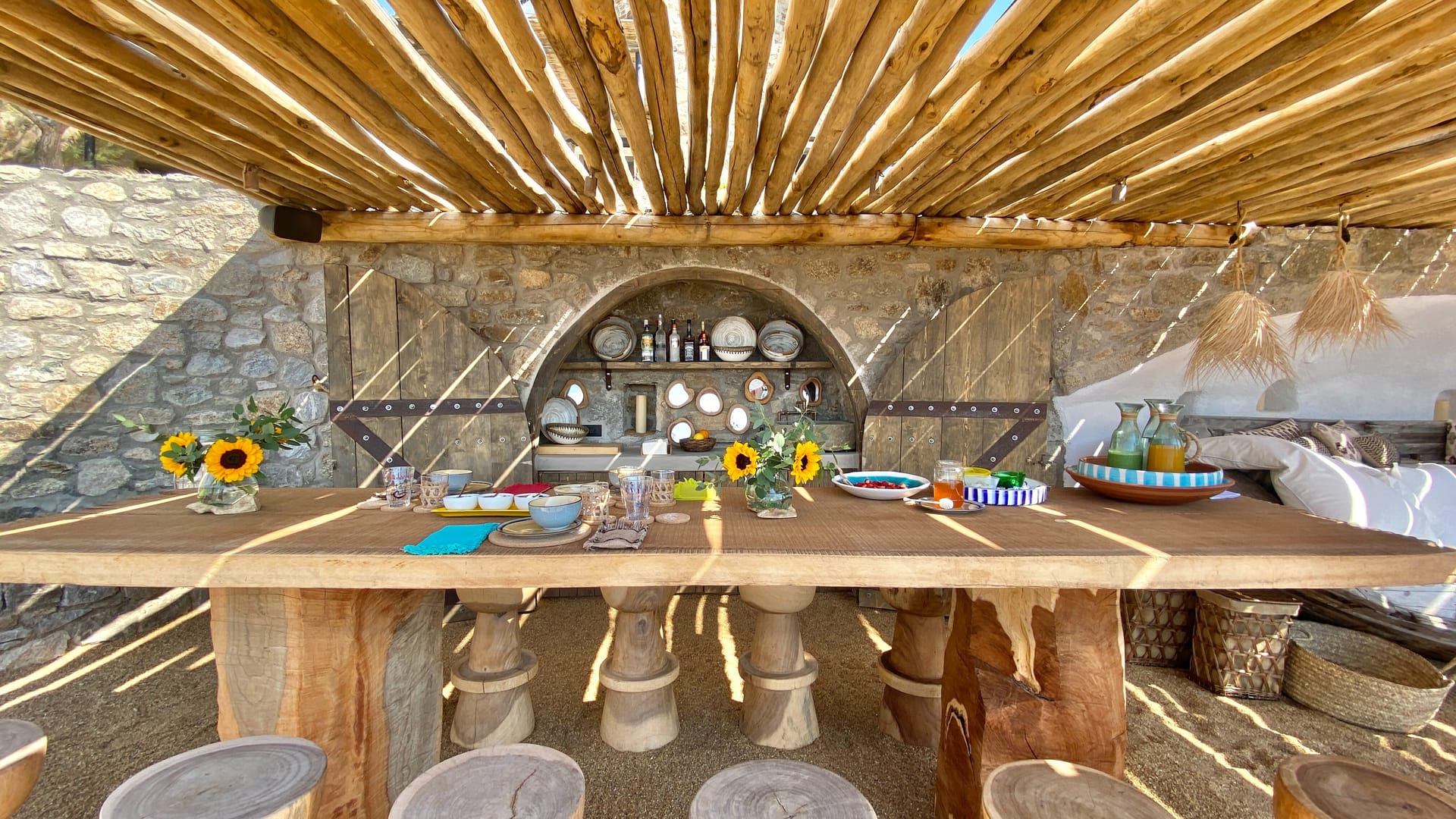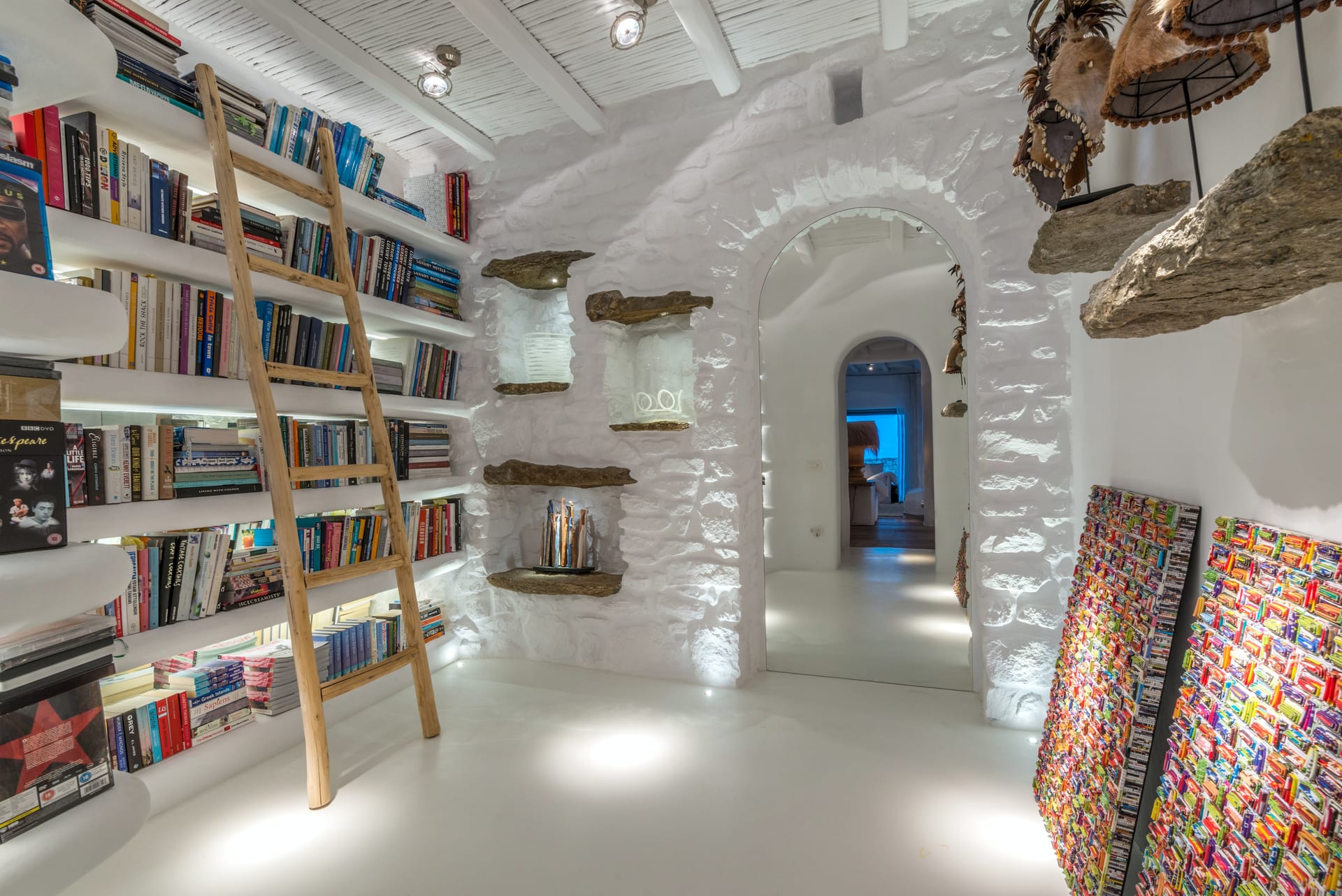 The villa’s architecture blends seamlessly with the rugged landscape, featuring a timeless stone and whitewashed exterior that embodies the essence of traditional Mykonian style. The design, both inside and out, integrates harmoniously with the natural topography, creating a perfect balance of boldness and serenity.