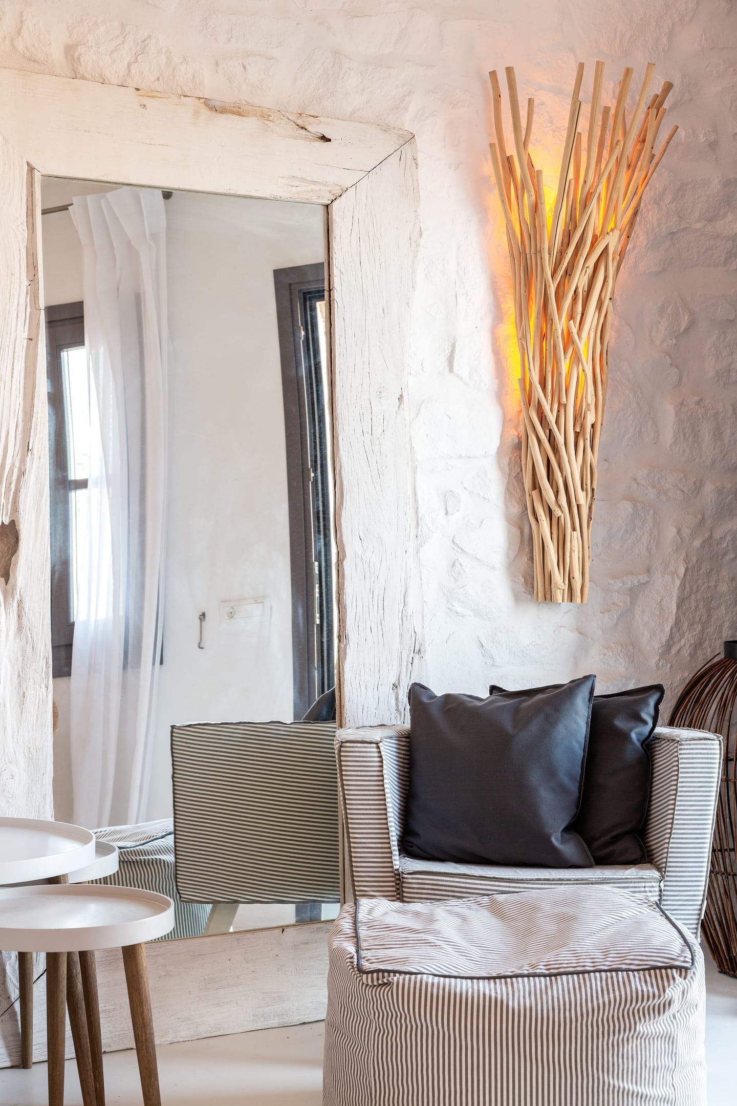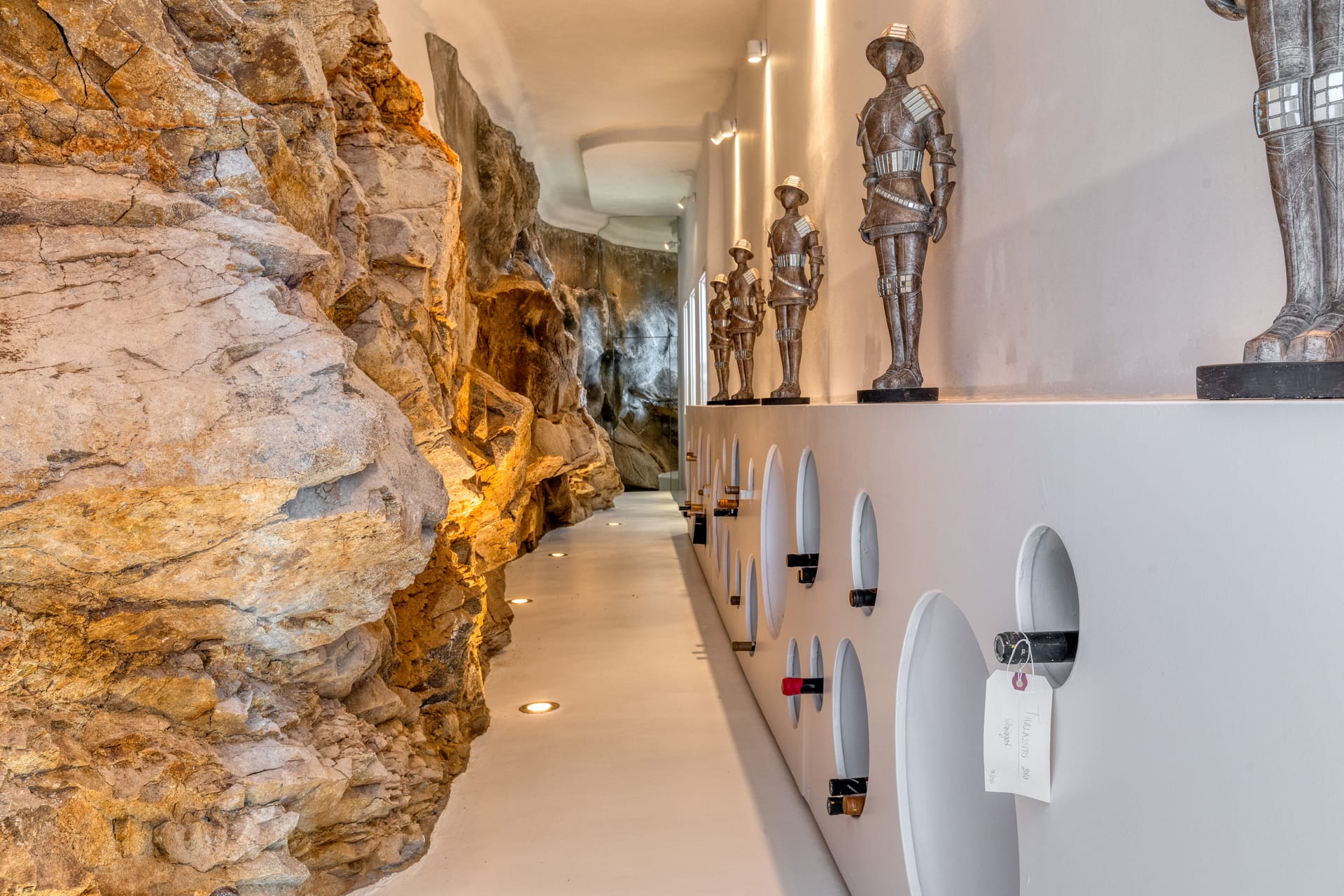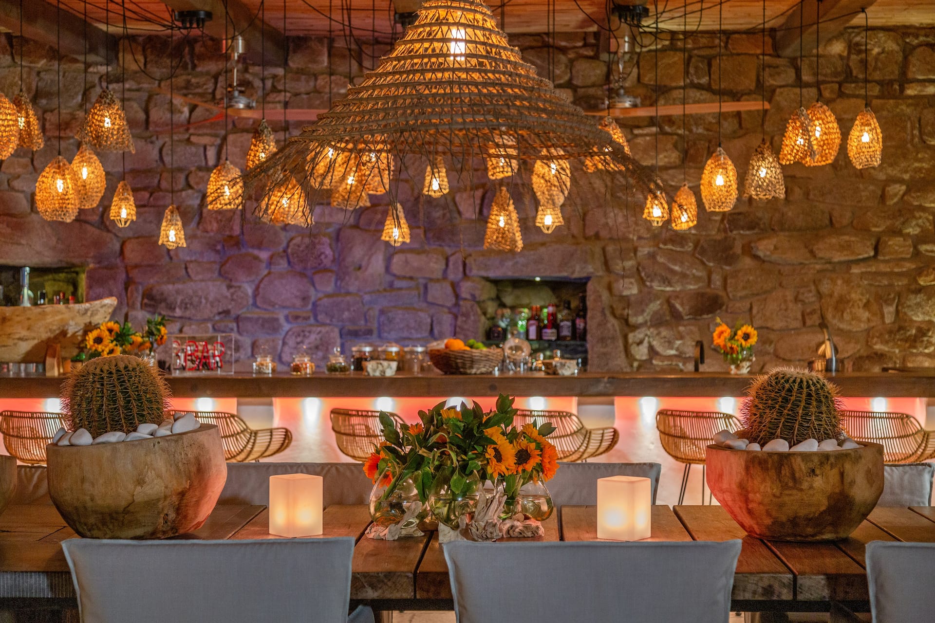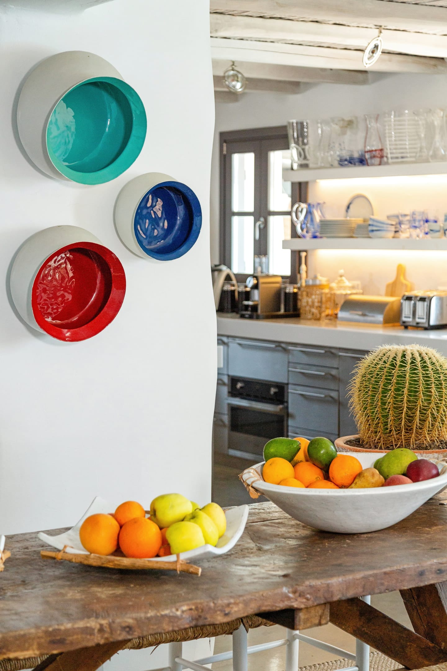 The villa’s architecture blends seamlessly with the rugged landscape, featuring a timeless stone and whitewashed exterior that embodies the essence of traditional Mykonian style. The design, both inside and out, integrates harmoniously with the natural topography, creating a perfect balance of boldness and serenity.