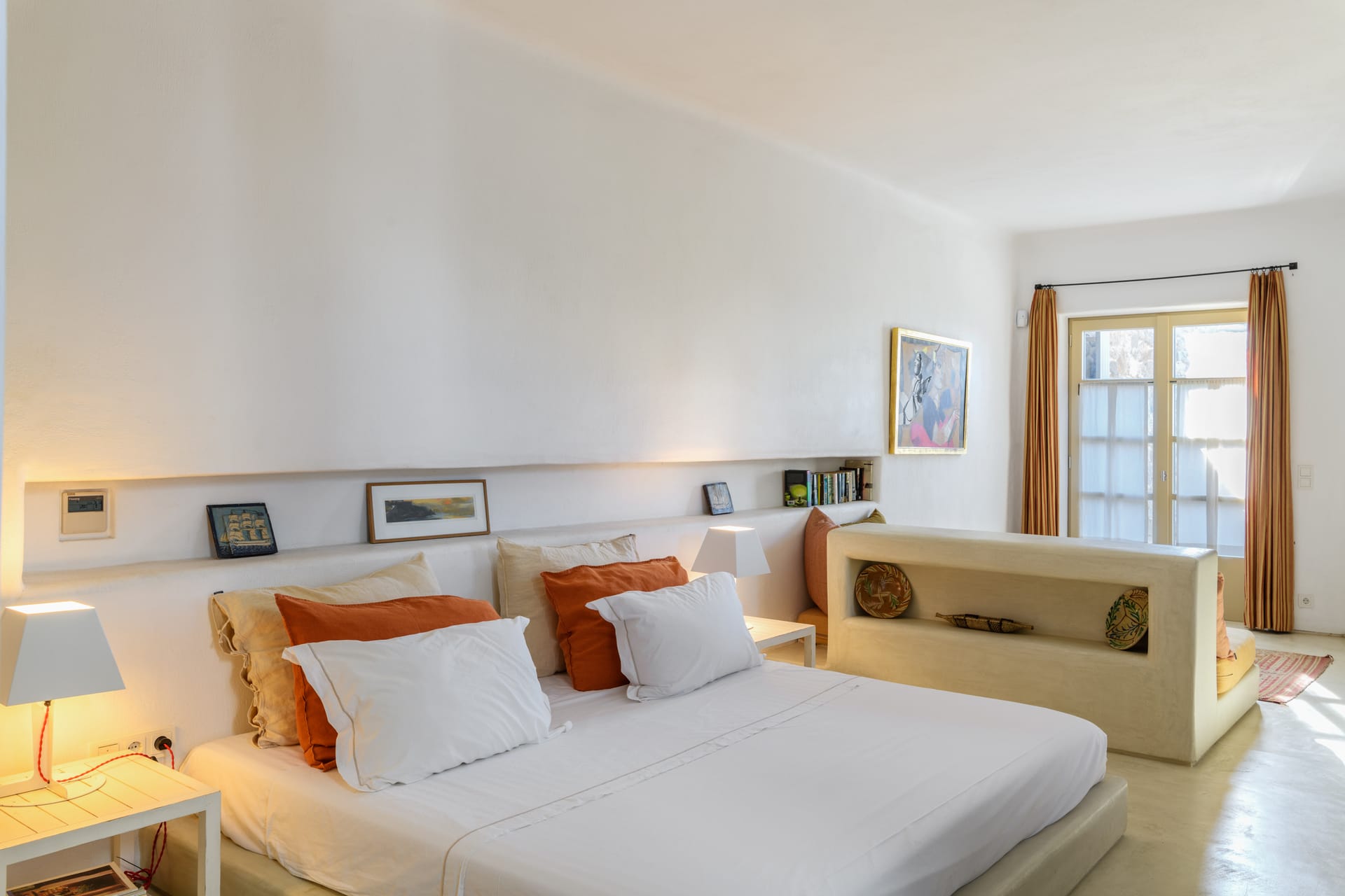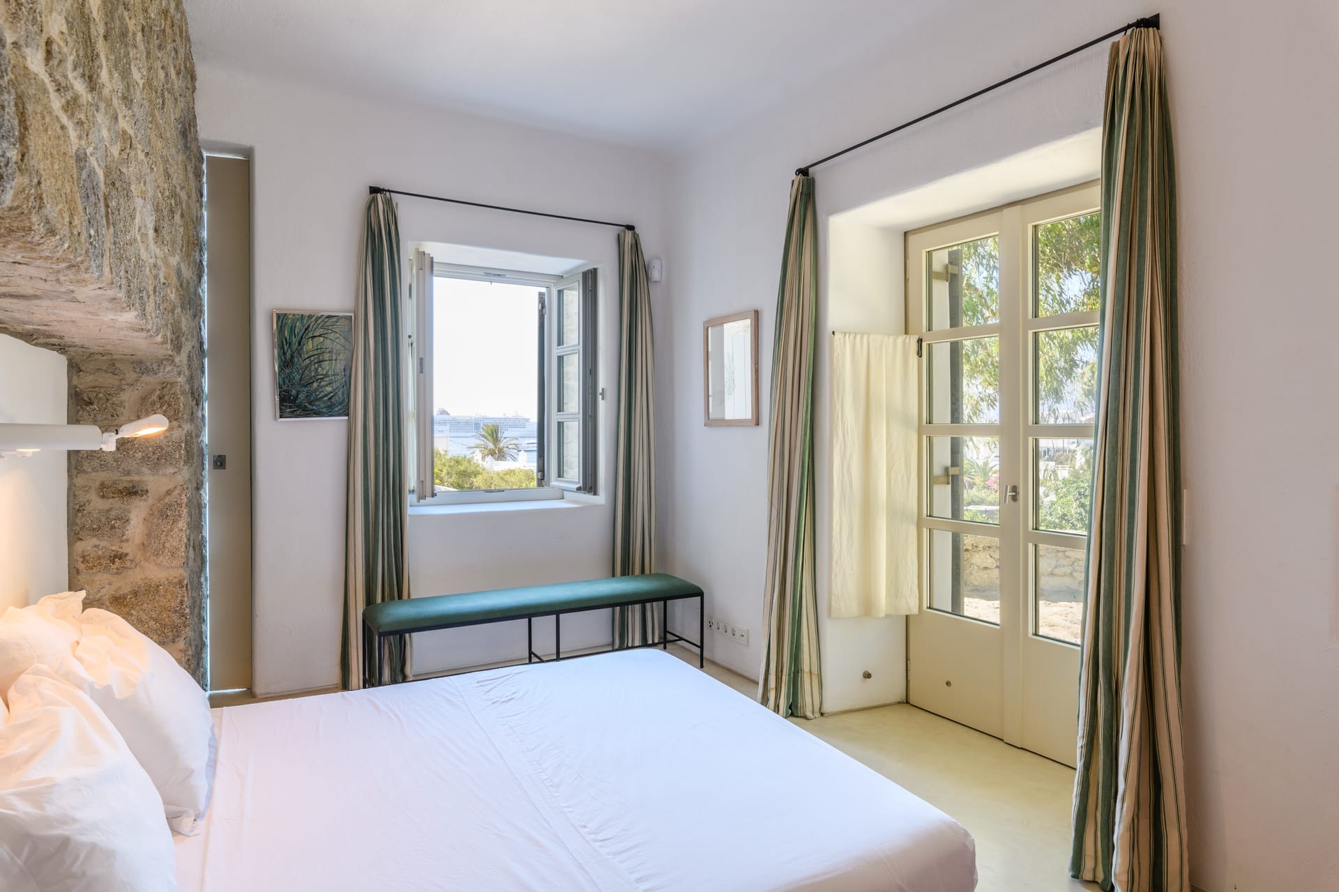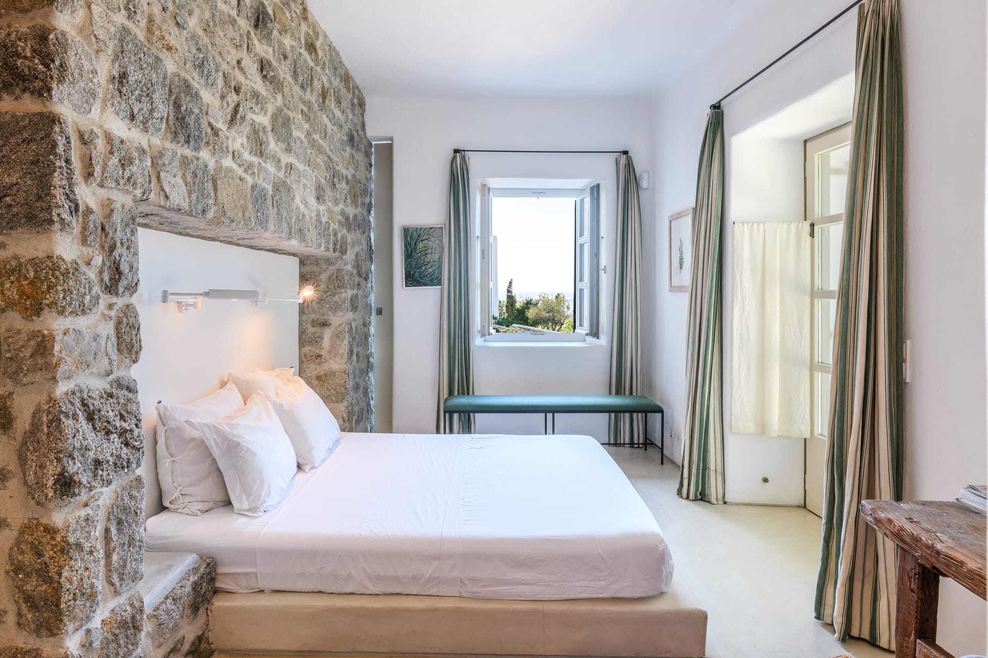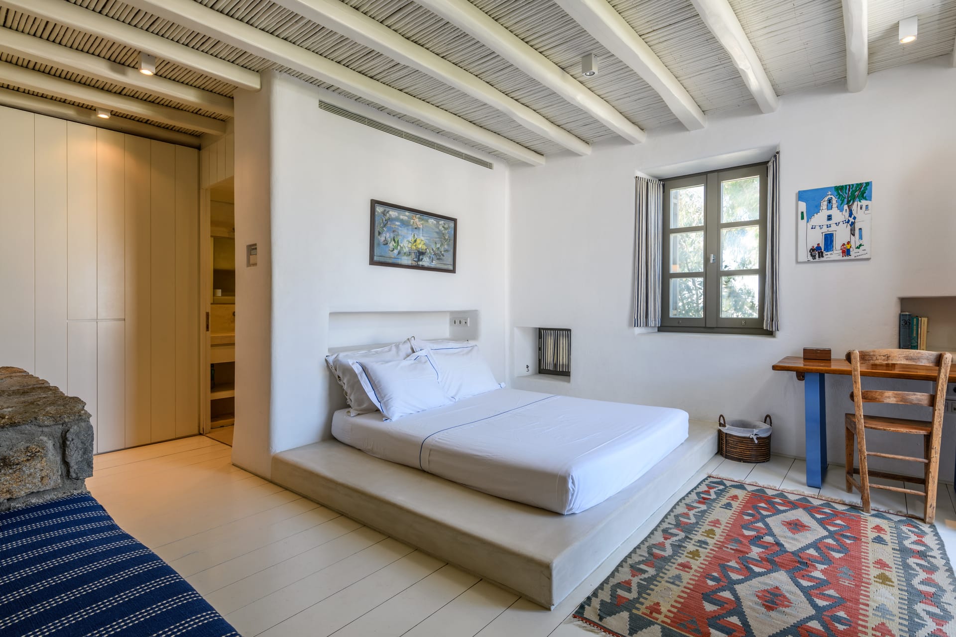 Masterbedroom: 42 m2 with direct seaview,sunset view and view to MykonosTown, balcony. Kingsize bed.The room has 2 bathrooms,one for him and one for her and it is equipped with a working desk, safebox, hairdryer, A/C, bathroom amenities and towels.