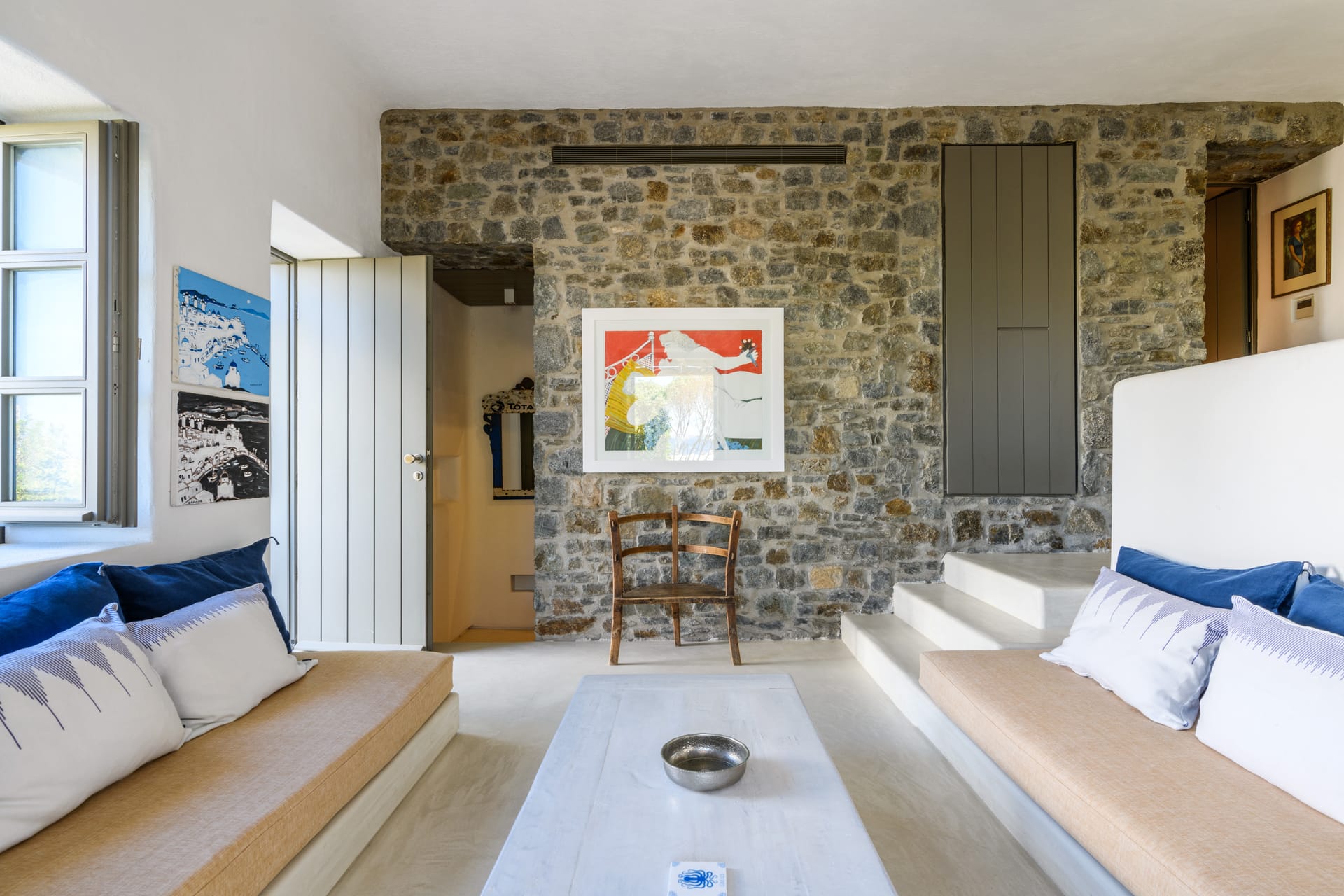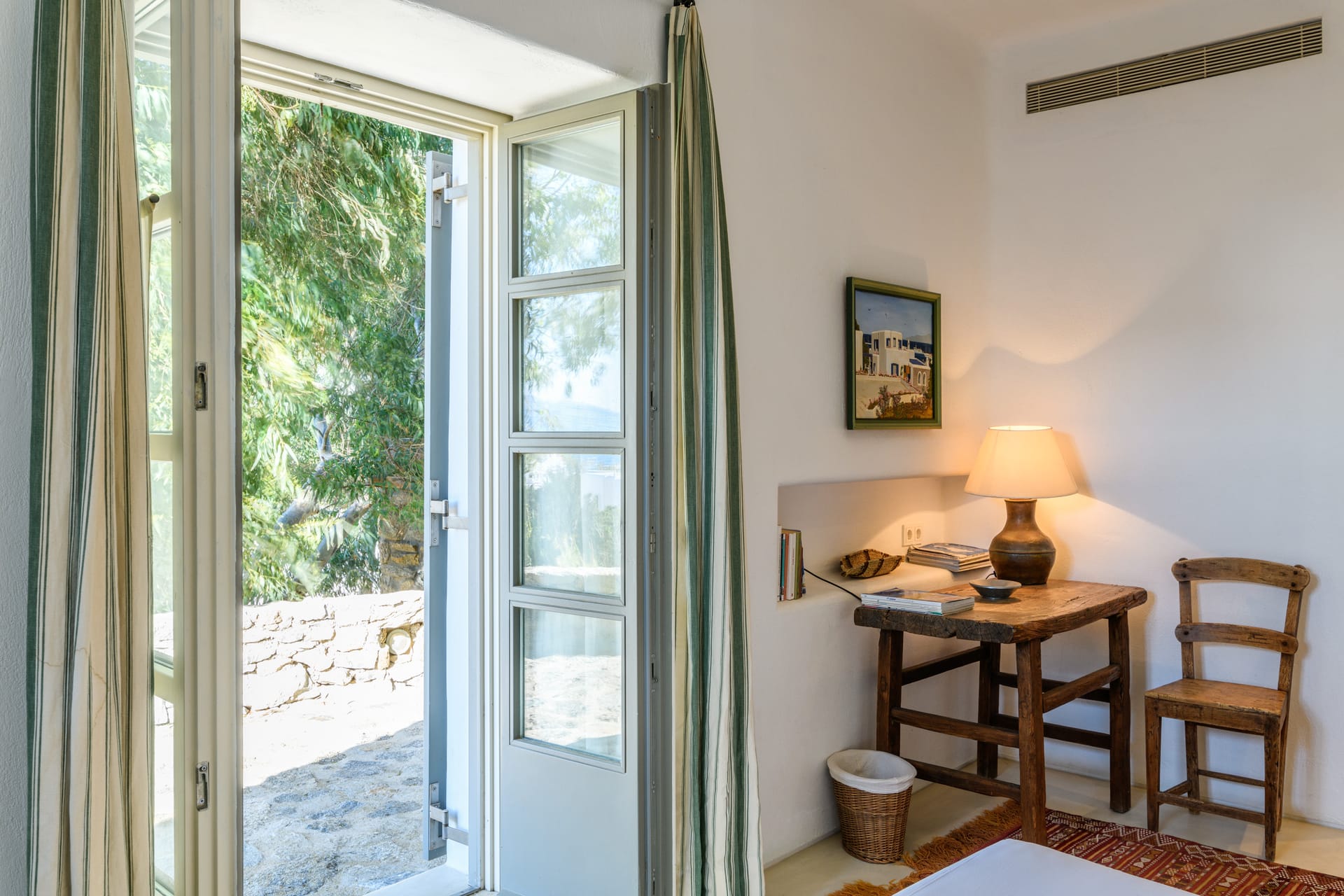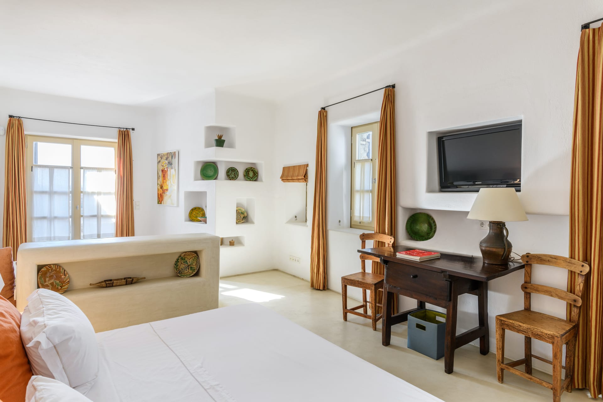 Masterbedroom: 42 m2 with direct seaview,sunset view and view to MykonosTown, balcony. Kingsize bed.The room has 2 bathrooms,one for him and one for her and it is equipped with a working desk, safebox, hairdryer, A/C, bathroom amenities and towels.
