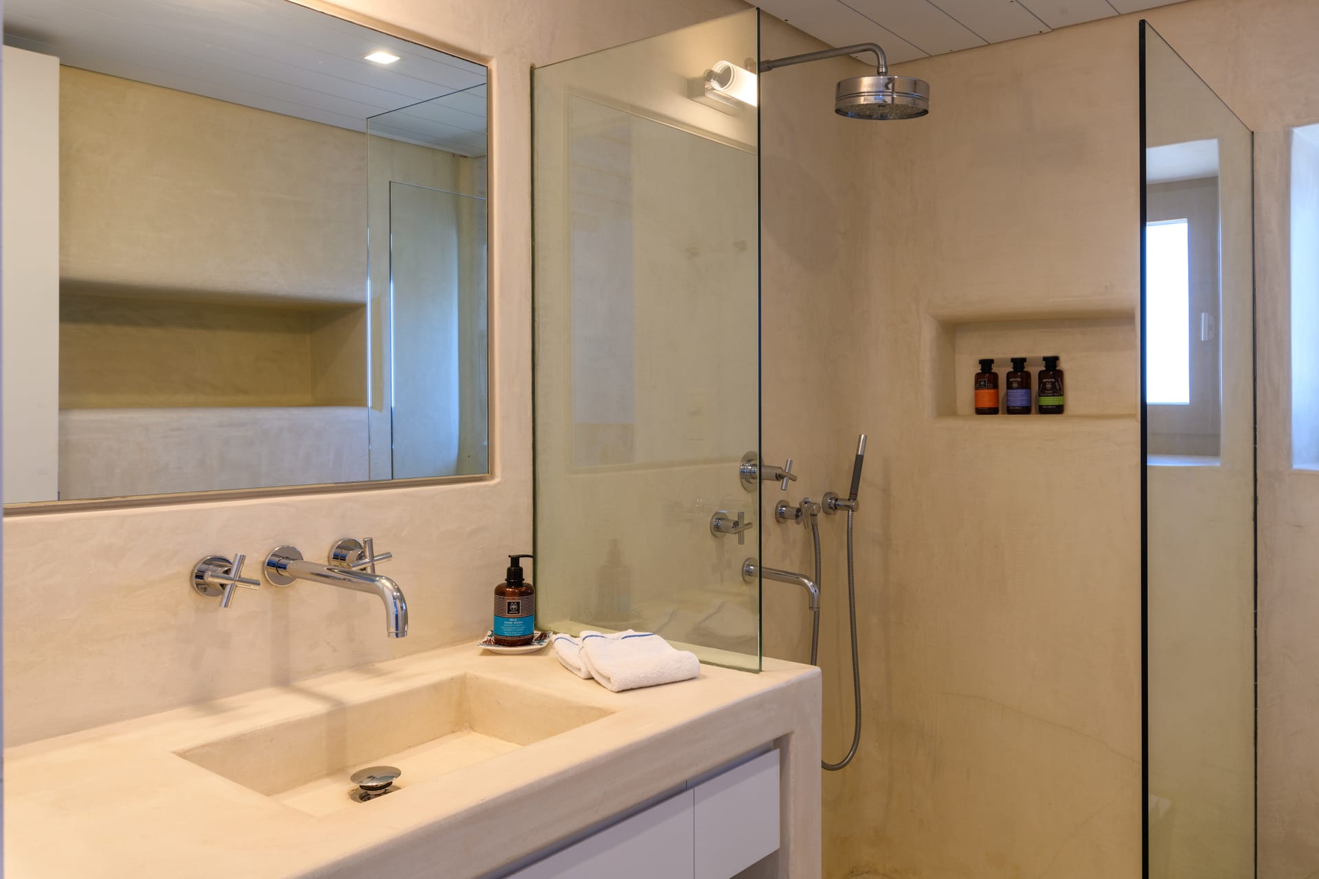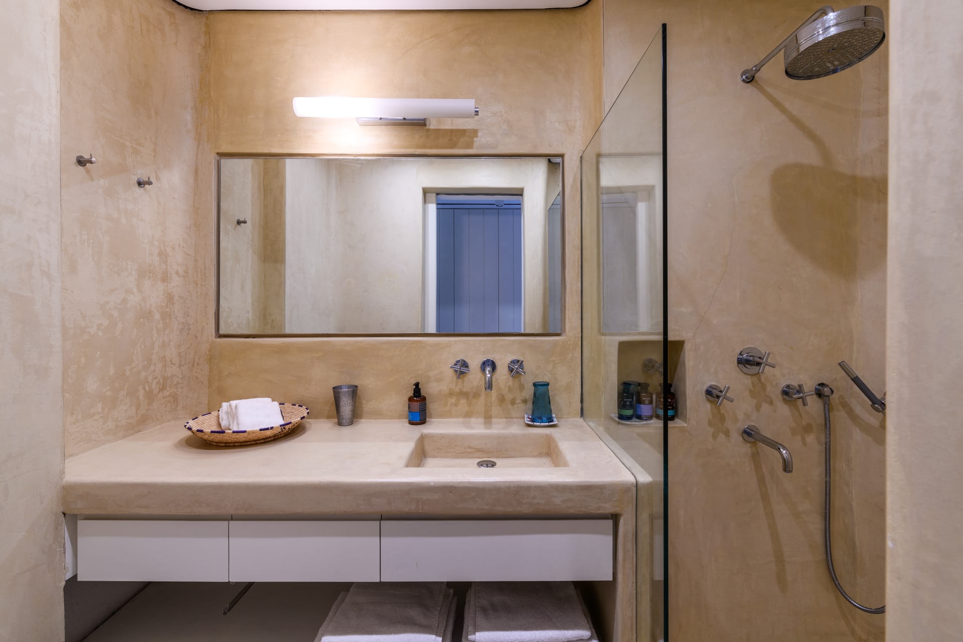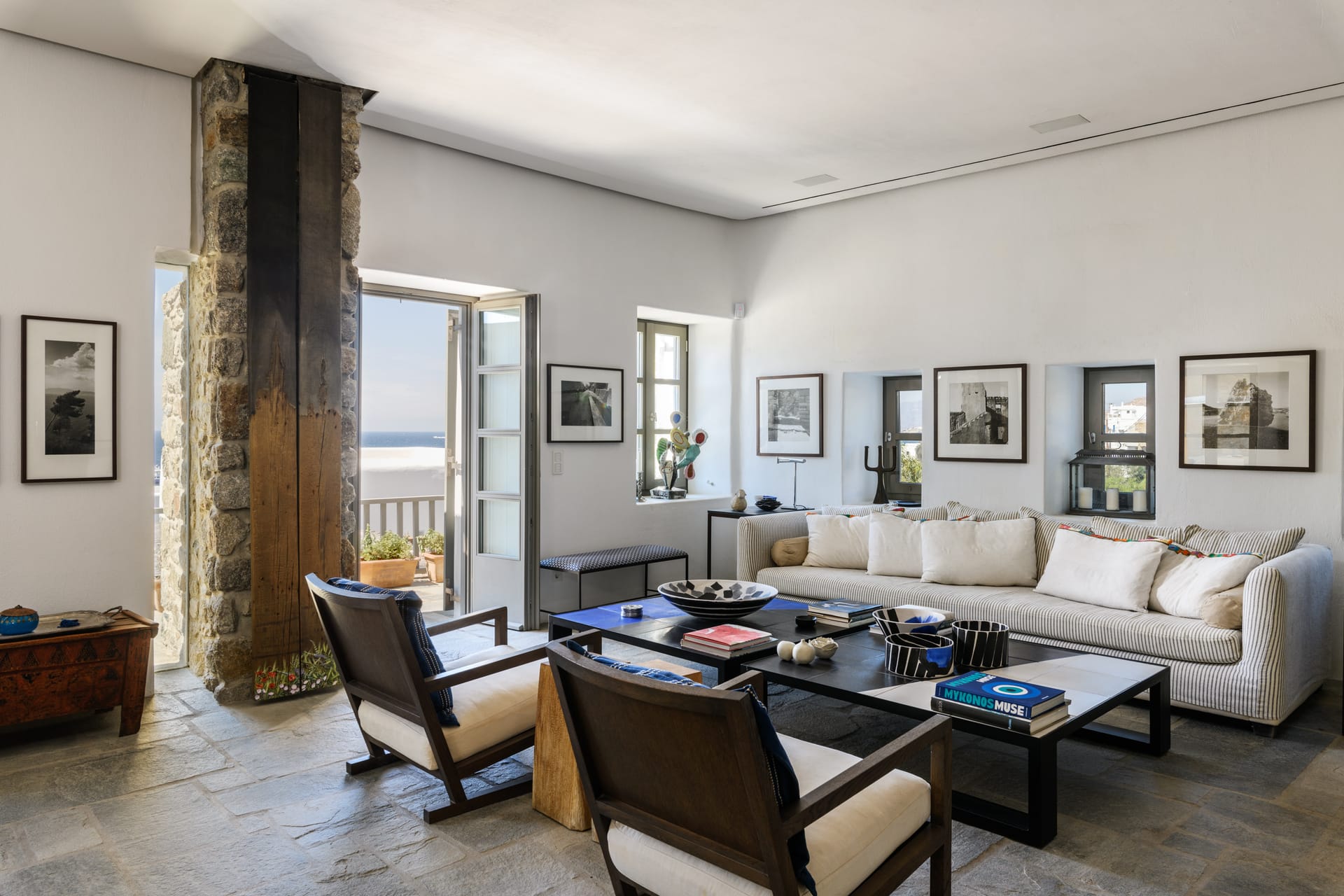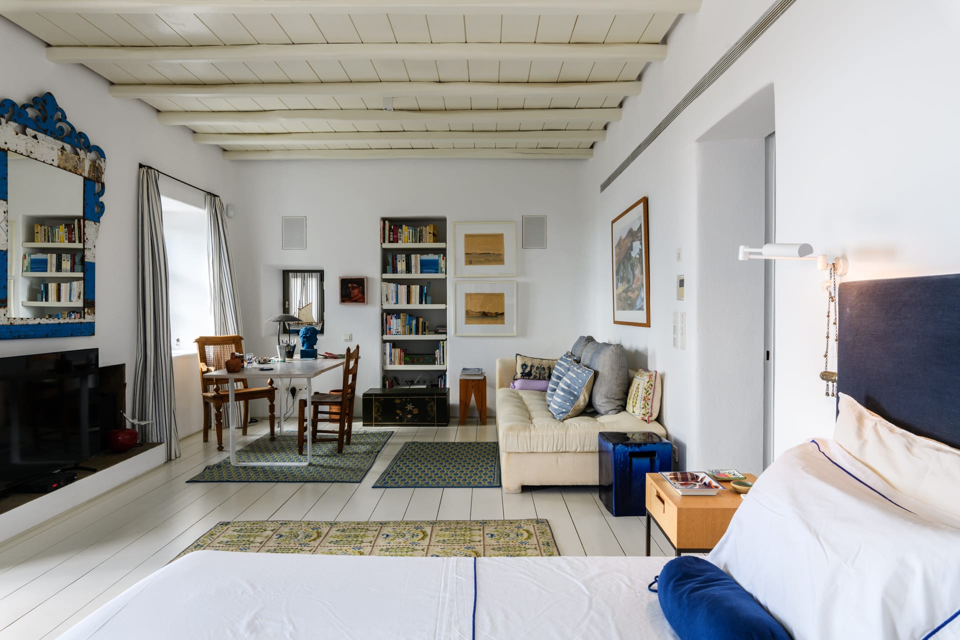 Masterbedroom: 42 m2 with direct seaview,sunset view and view to MykonosTown, balcony. Kingsize bed.The room has 2 bathrooms,one for him and one for her and it is equipped with a working desk, safebox, hairdryer, A/C, bathroom amenities and towels.