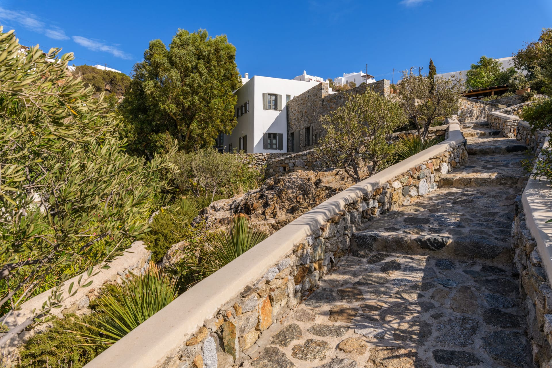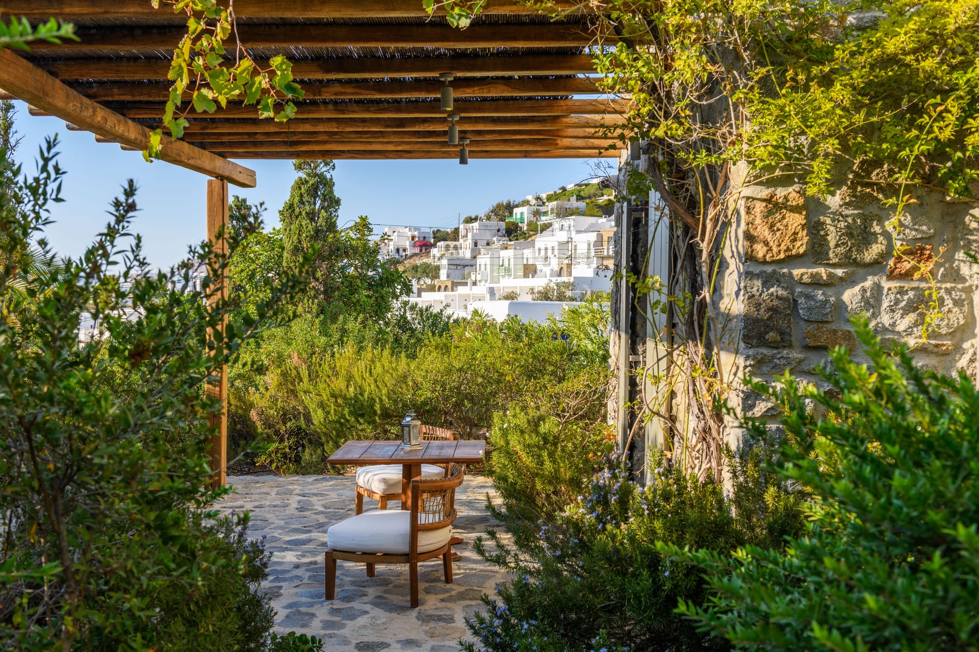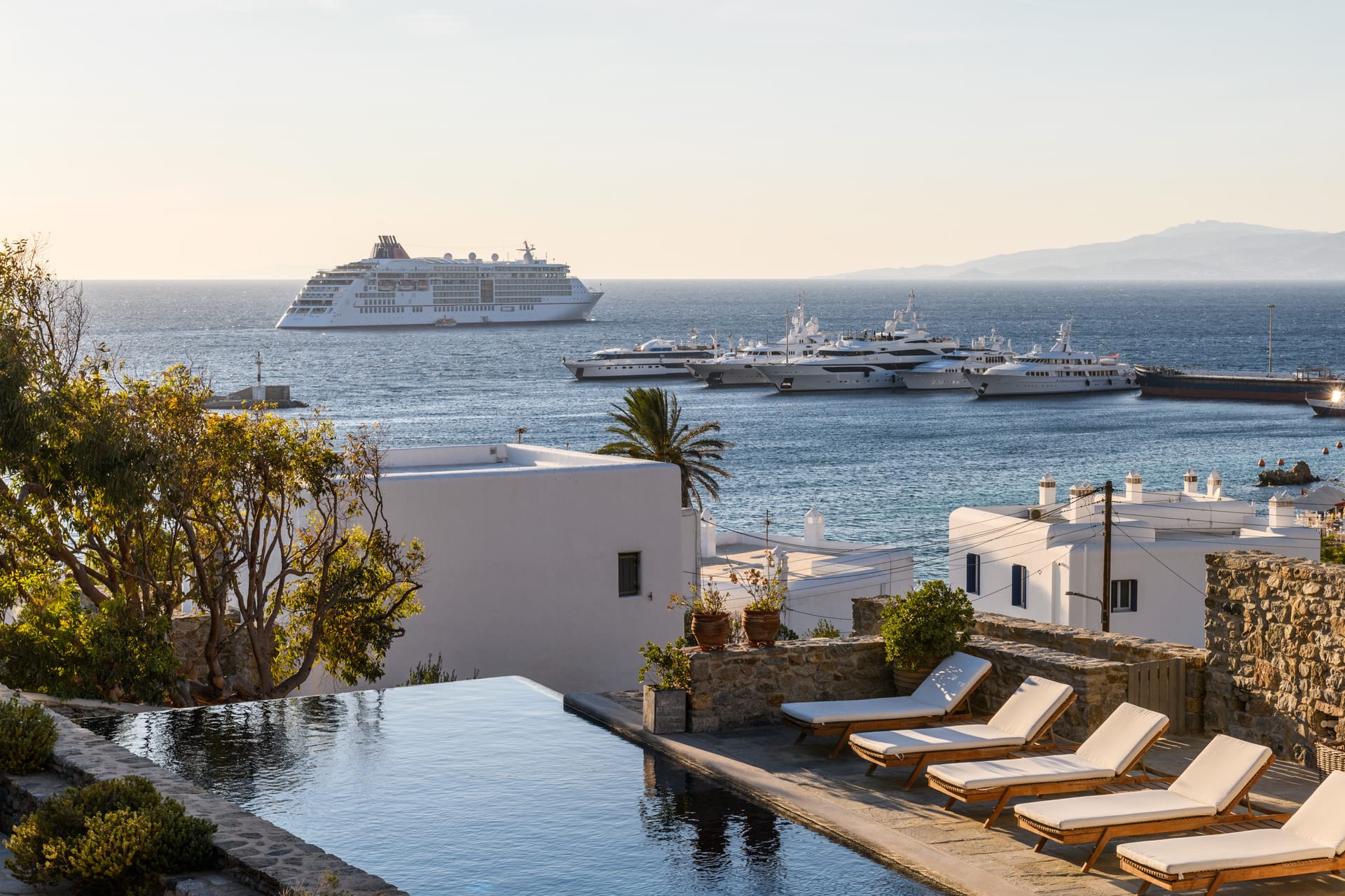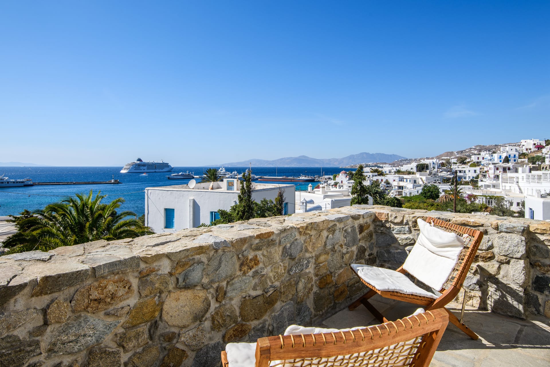Villa Gardenia is a Luxury Estate which considered as one of the most luxurious properties of the island, it owns a huge land, with three entrances in Mykonos Town, located in the most demanded location. Bathed in the world-famous Cycladic light and cooled by the Aegean breeze, it is one of the largest Villas in Mykonos (1091sqm), with an adjacent Gym (50sqm), built ona plot of 3,200sqm, and offers the ideal holiday destination for large families or groups of friends up to 16 people. Villa Gardenia is the only Villa that is located in Mykonos Town and offers its guests the ultimate Mediterranean experience, with a superb panoramic view of the Aegean Sea, Mykonos Town, the old and new port,and breathtaking sunsets.