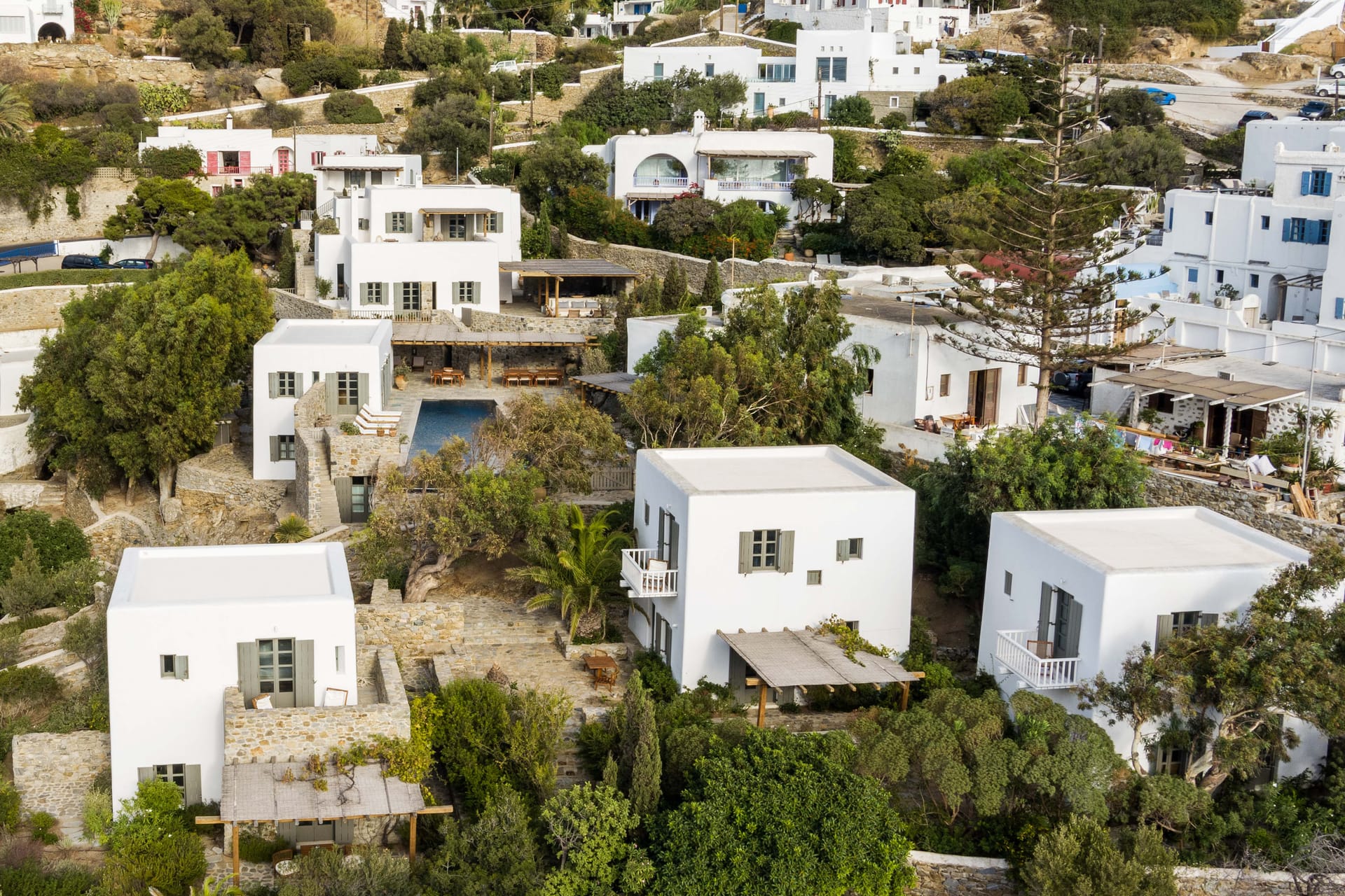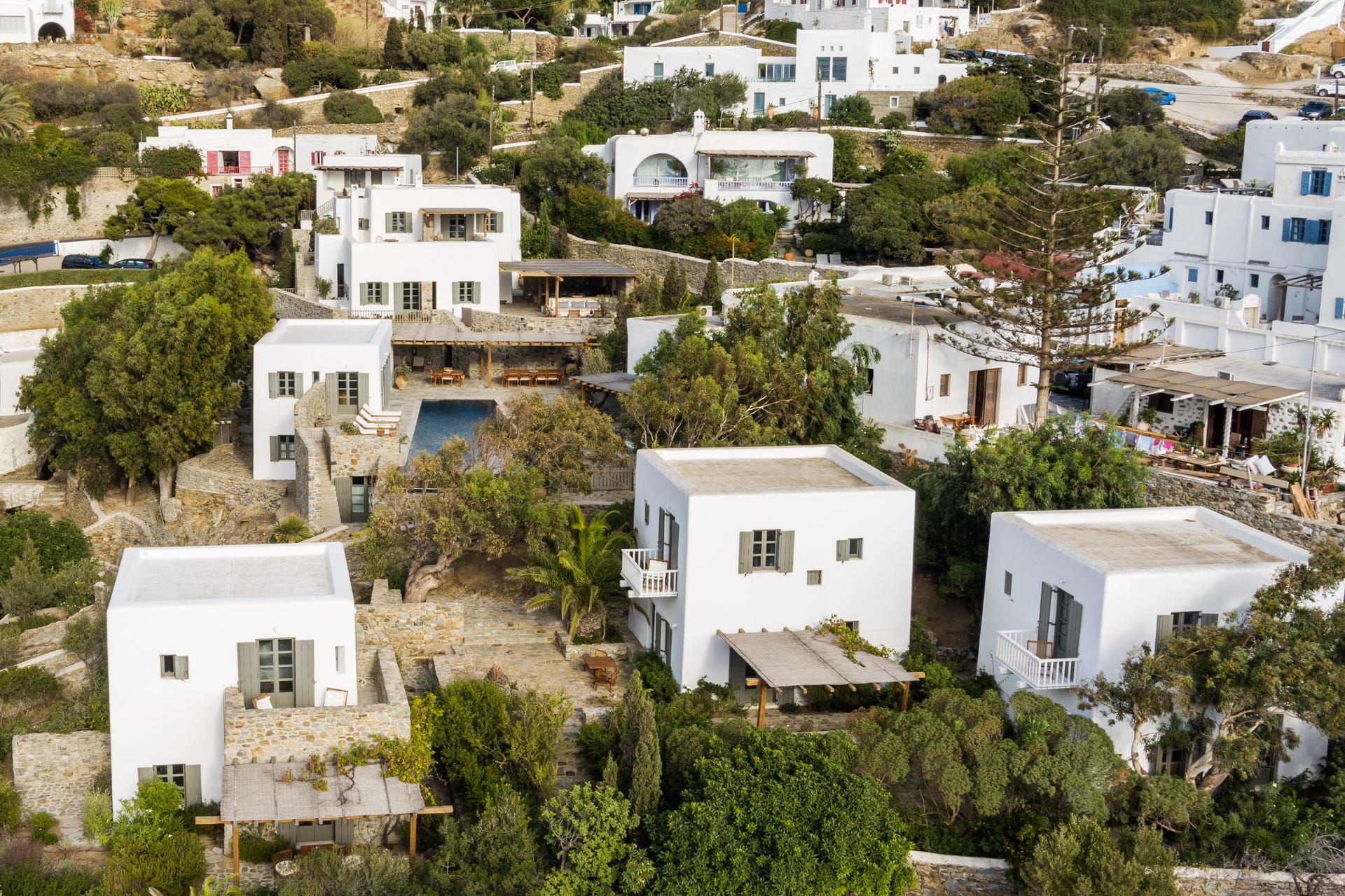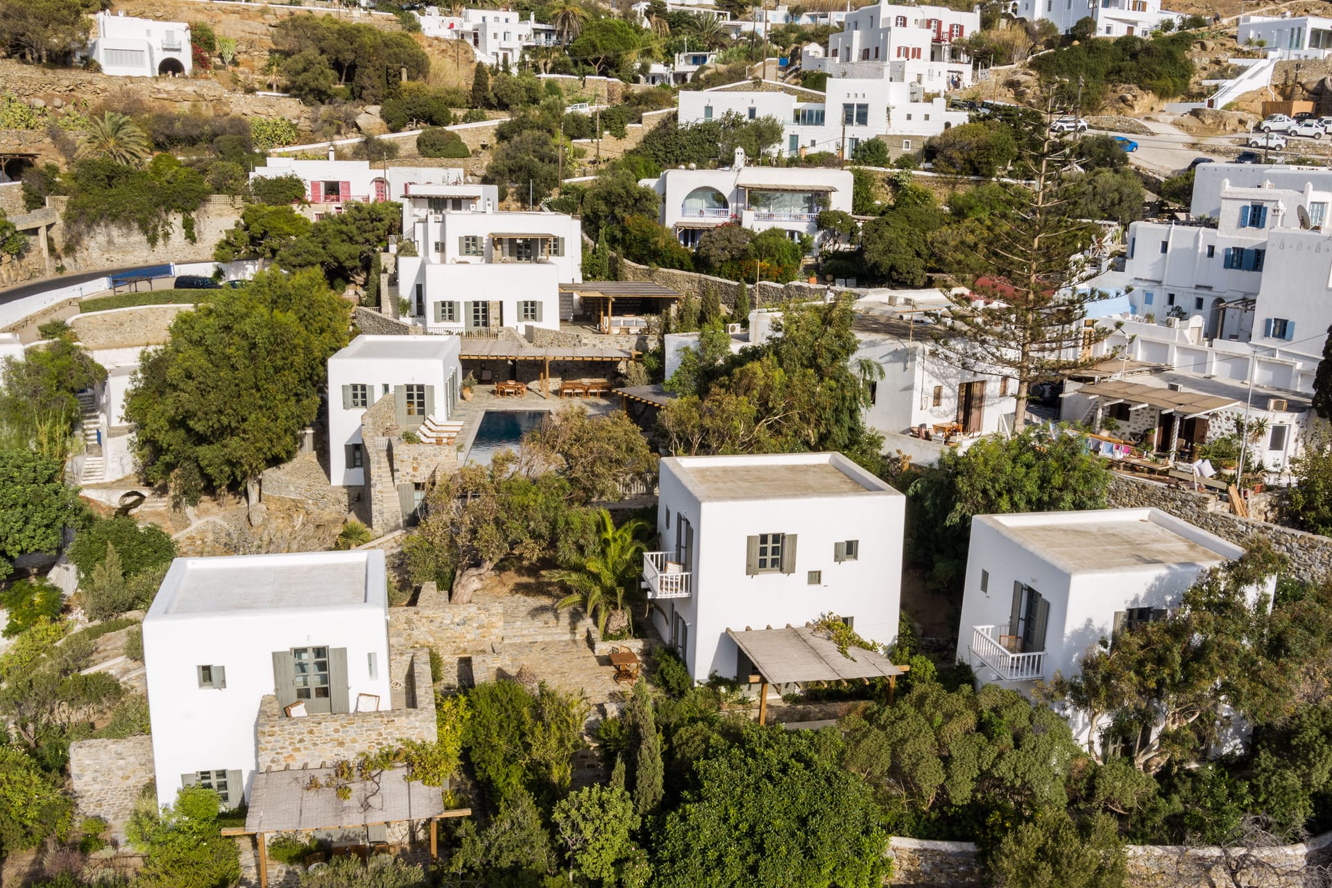 The Villa is bult in 4 levels and consists of 1 main building, 3 one-bedroom maisonettes, 1 pool house and one maisonette that is used as staff houseand three staff houses.
