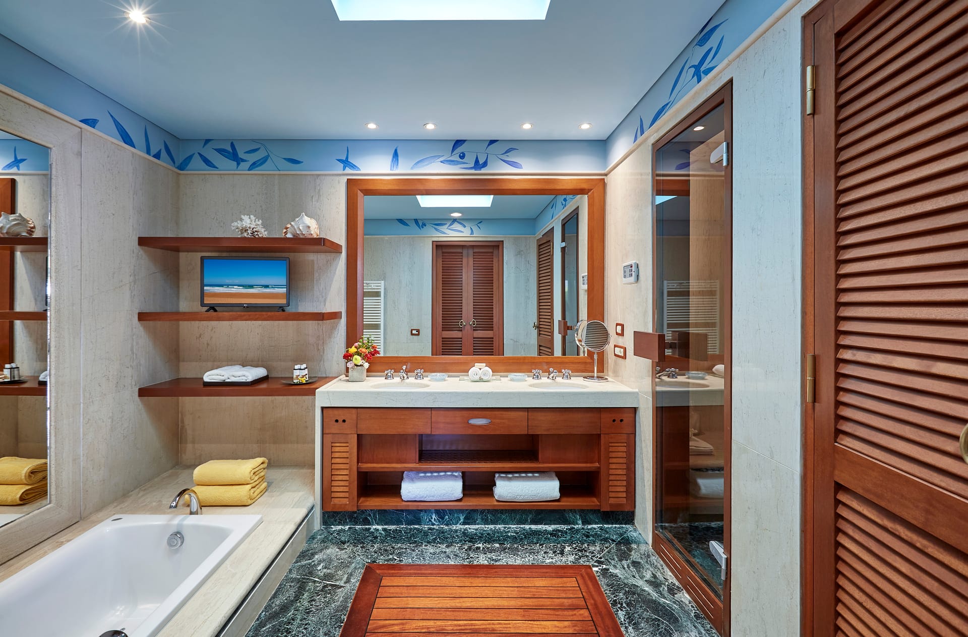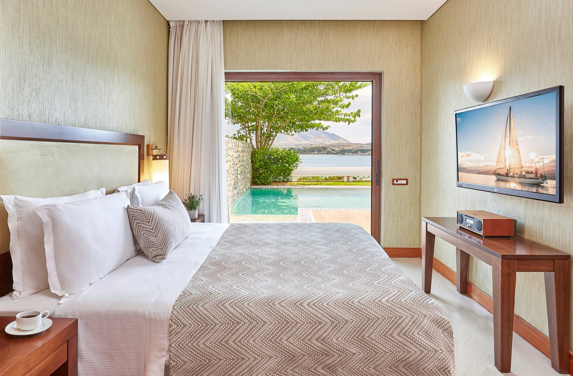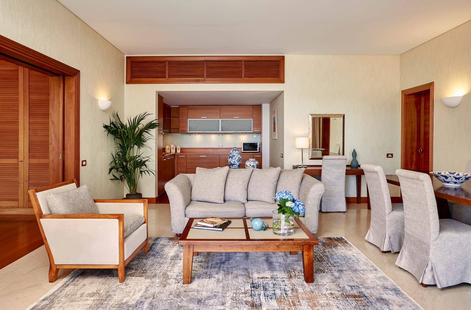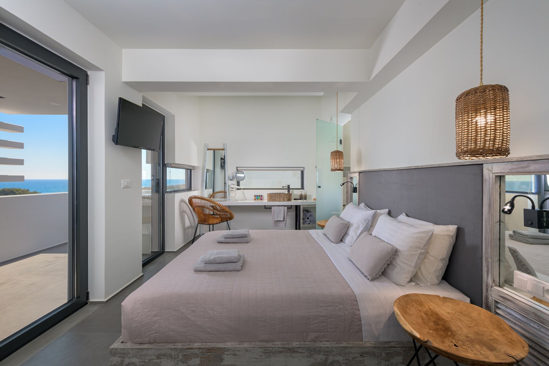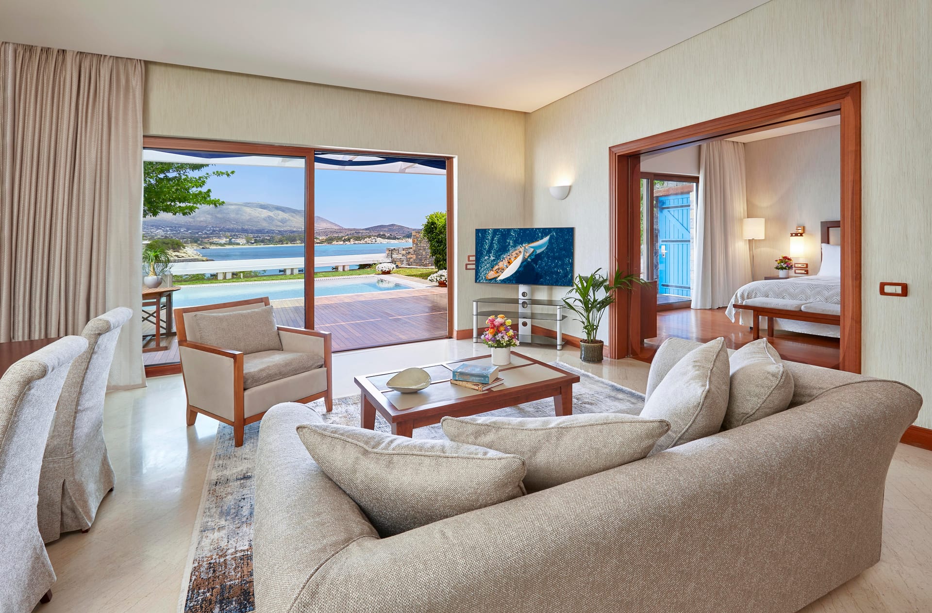 Open plan living and dining area with sea views and direct access to the outdoor spaces and the pool