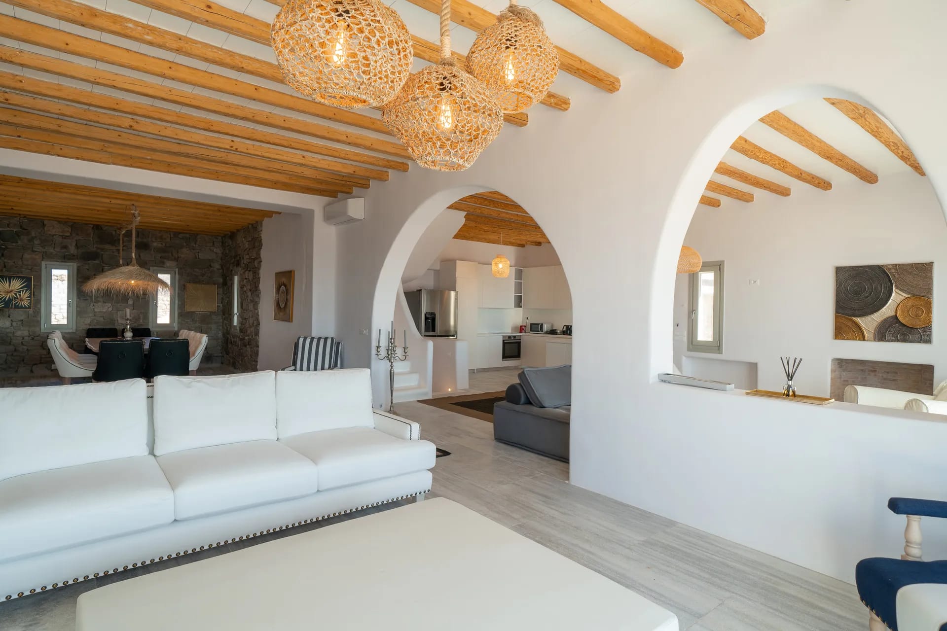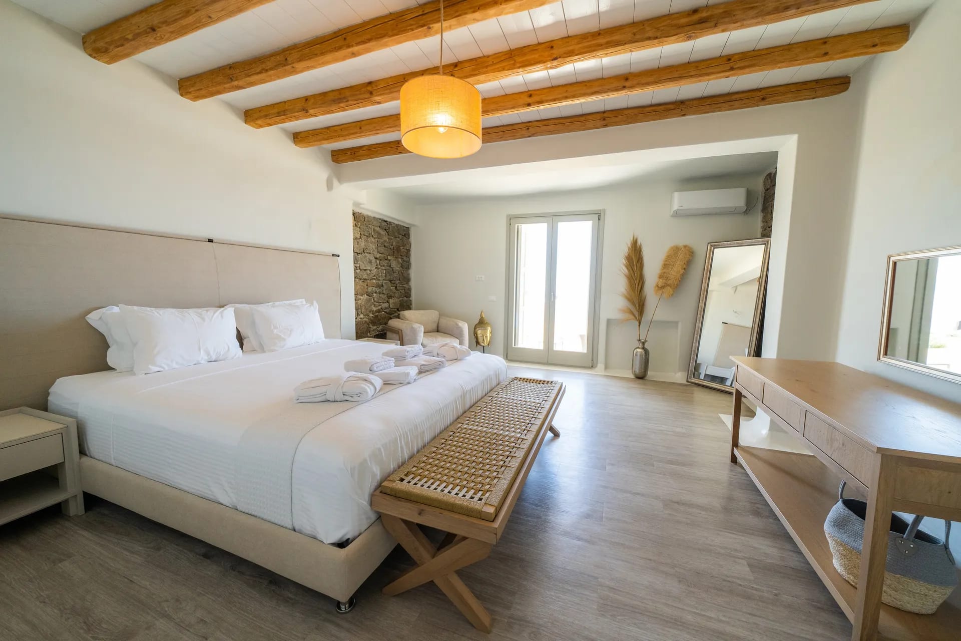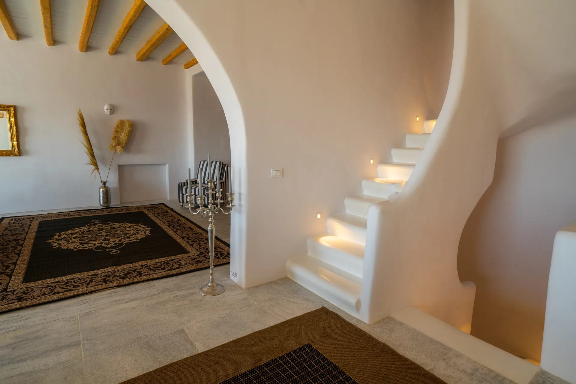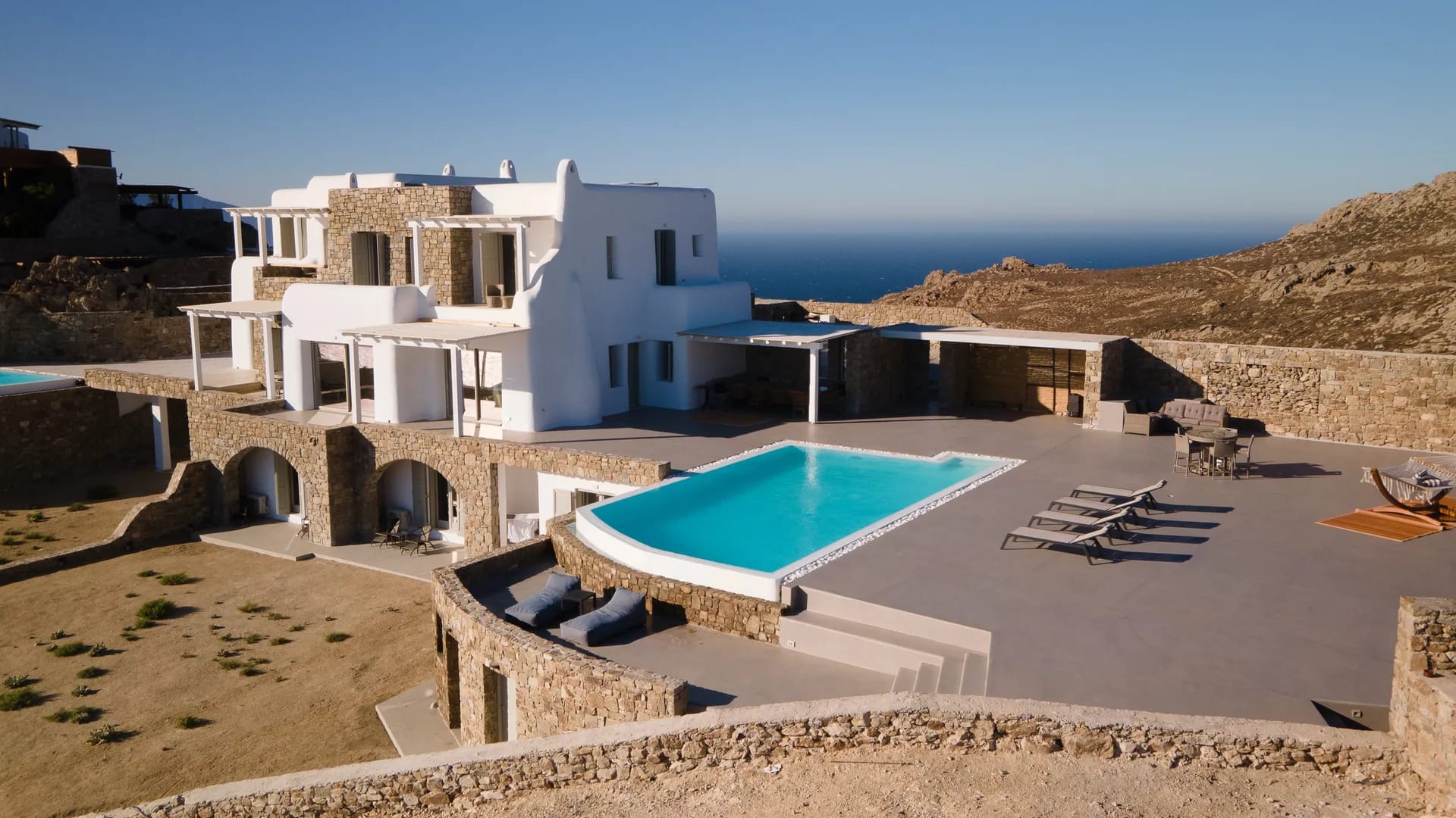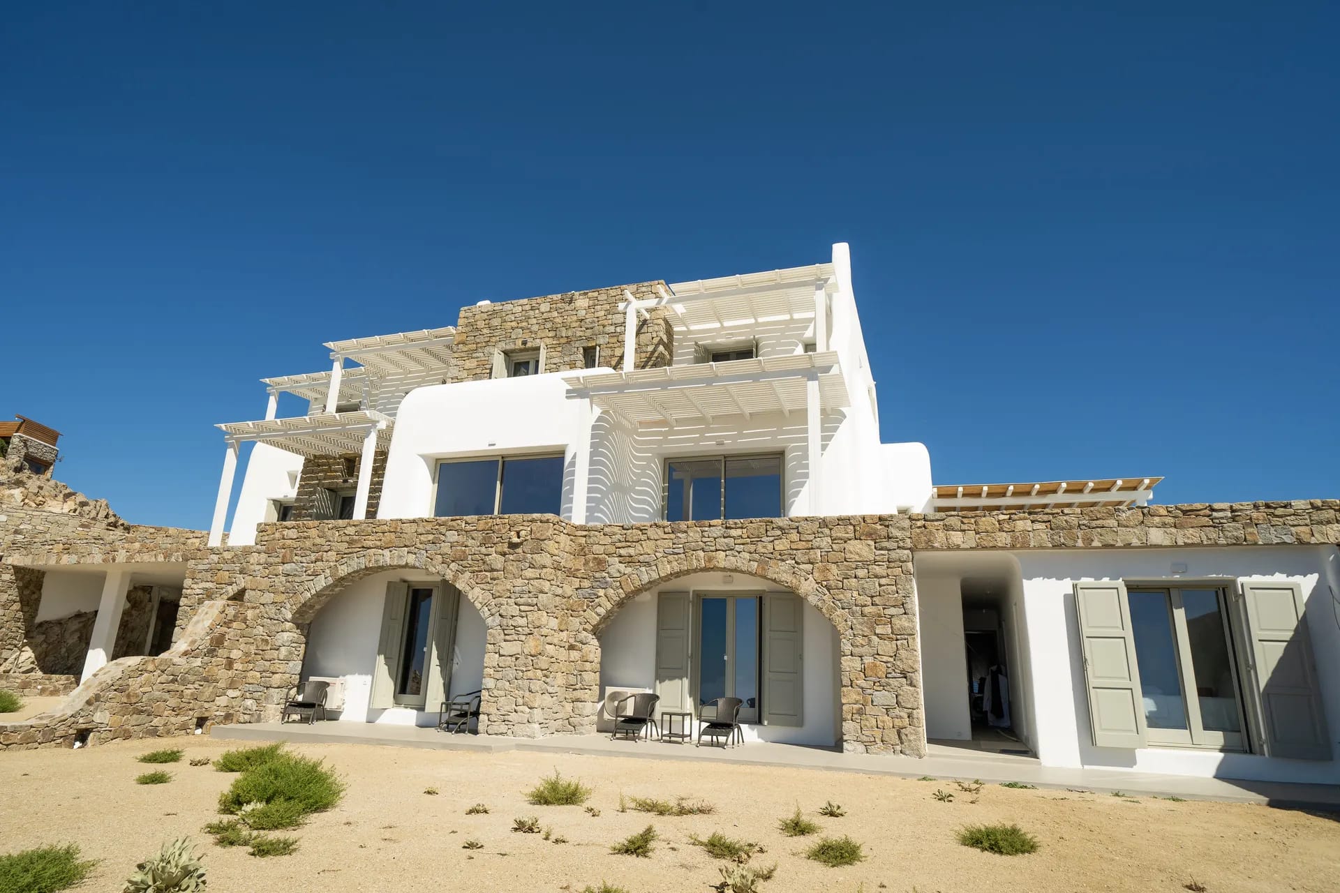 The property combines minimal Cycladic architecture with contemporary luxury, whitewashed lines, natural stone elements, and high-end furnishings, creating an elegant and serene atmosphere throughout.