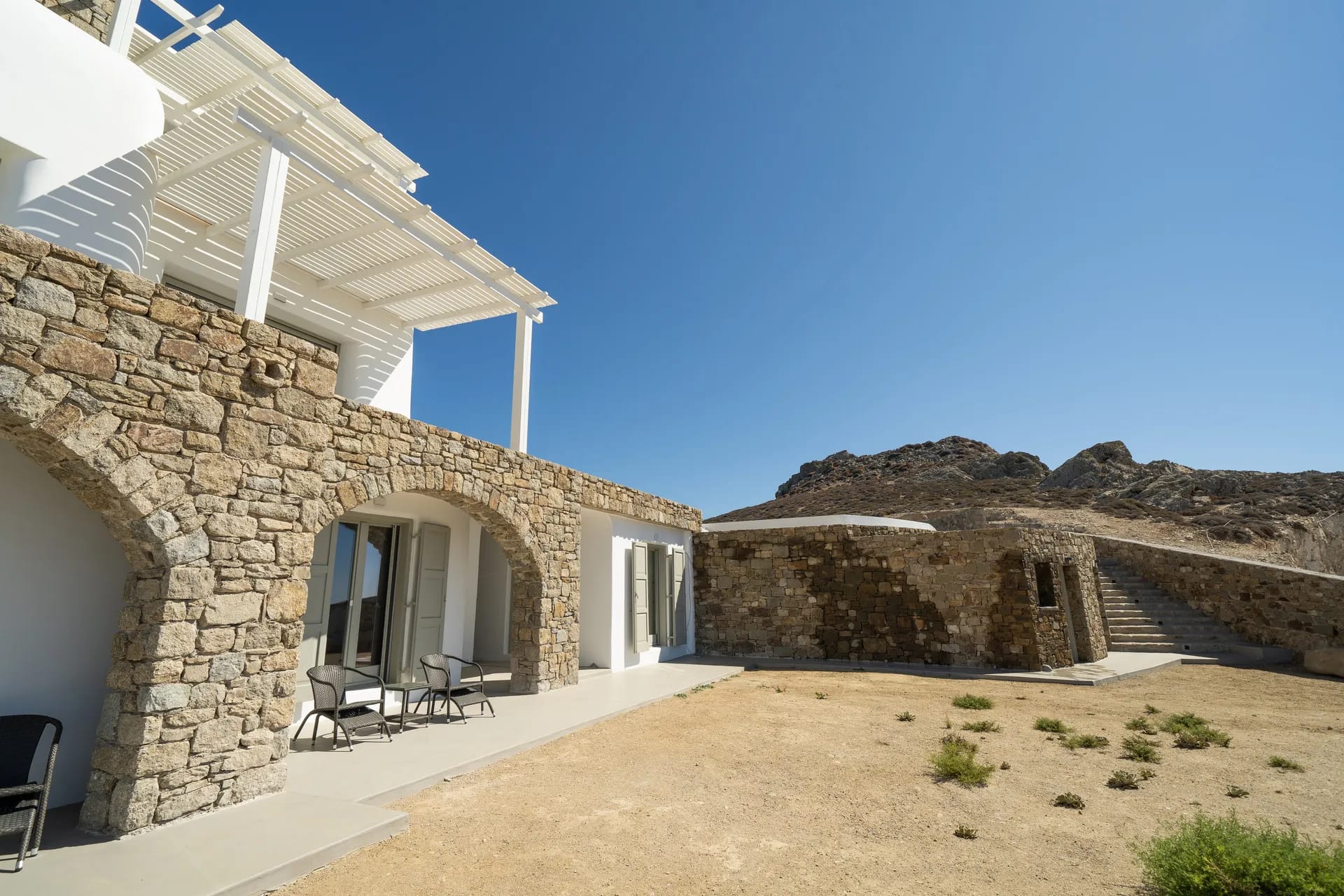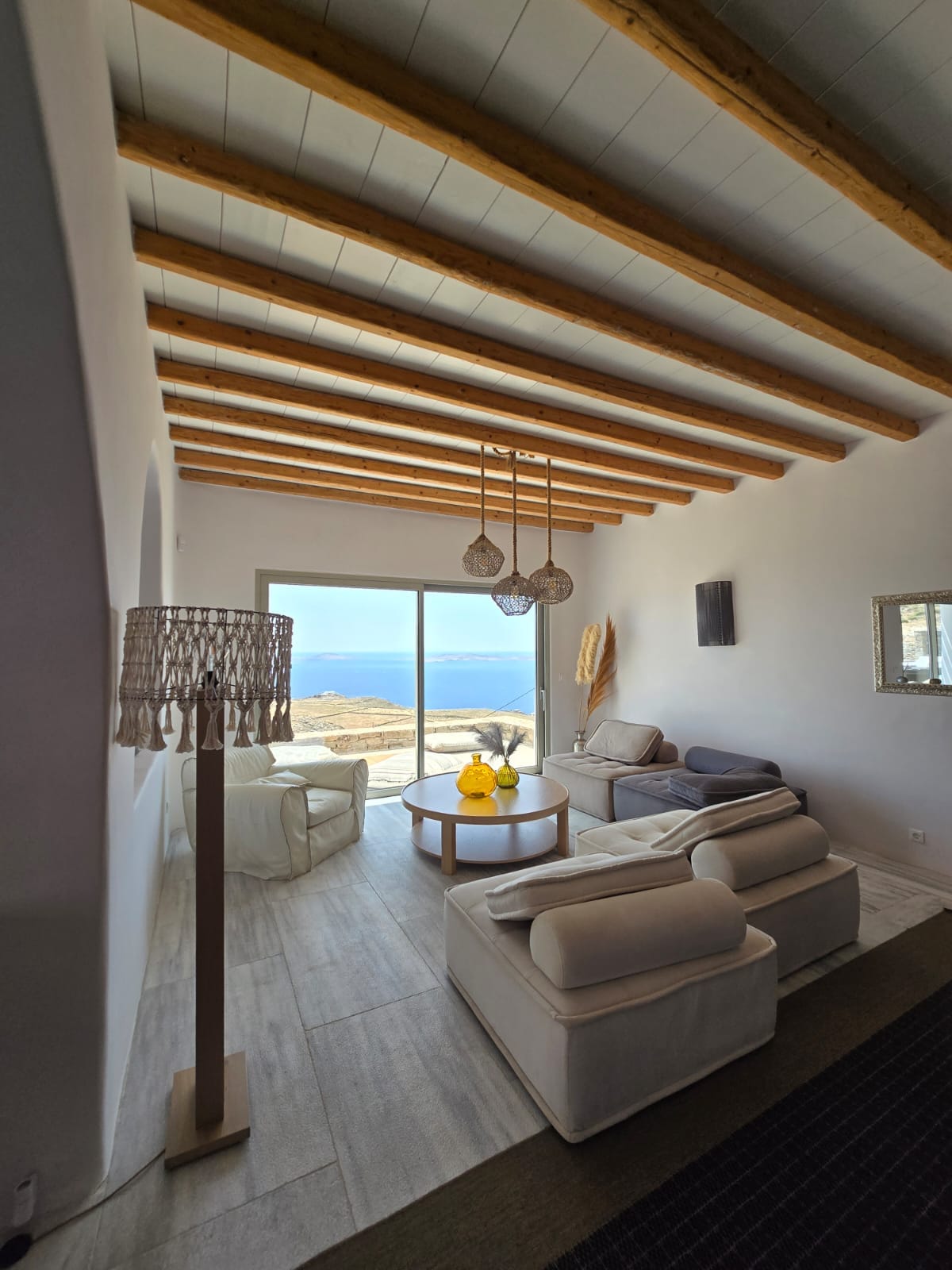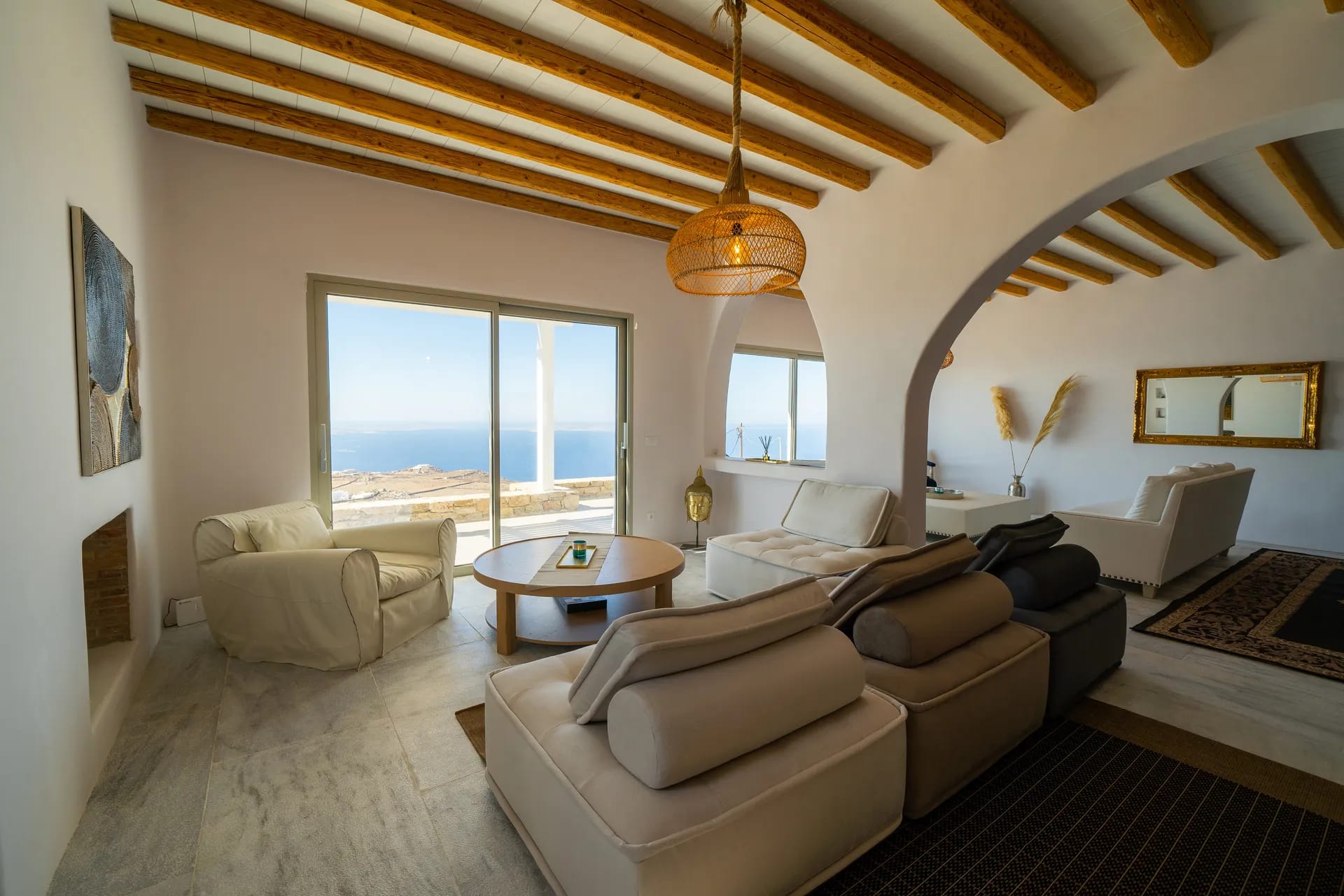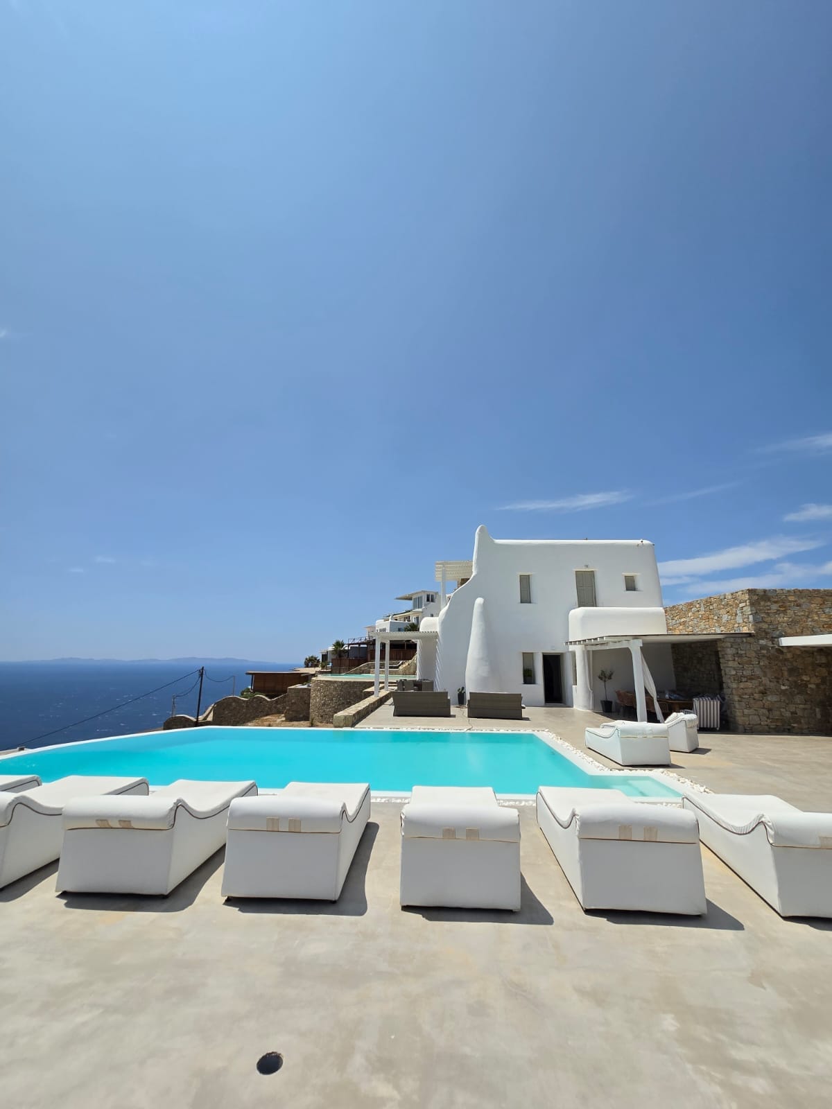 The property combines minimal Cycladic architecture with contemporary luxury, whitewashed lines, natural stone elements, and high-end furnishings, creating an elegant and serene atmosphere throughout.