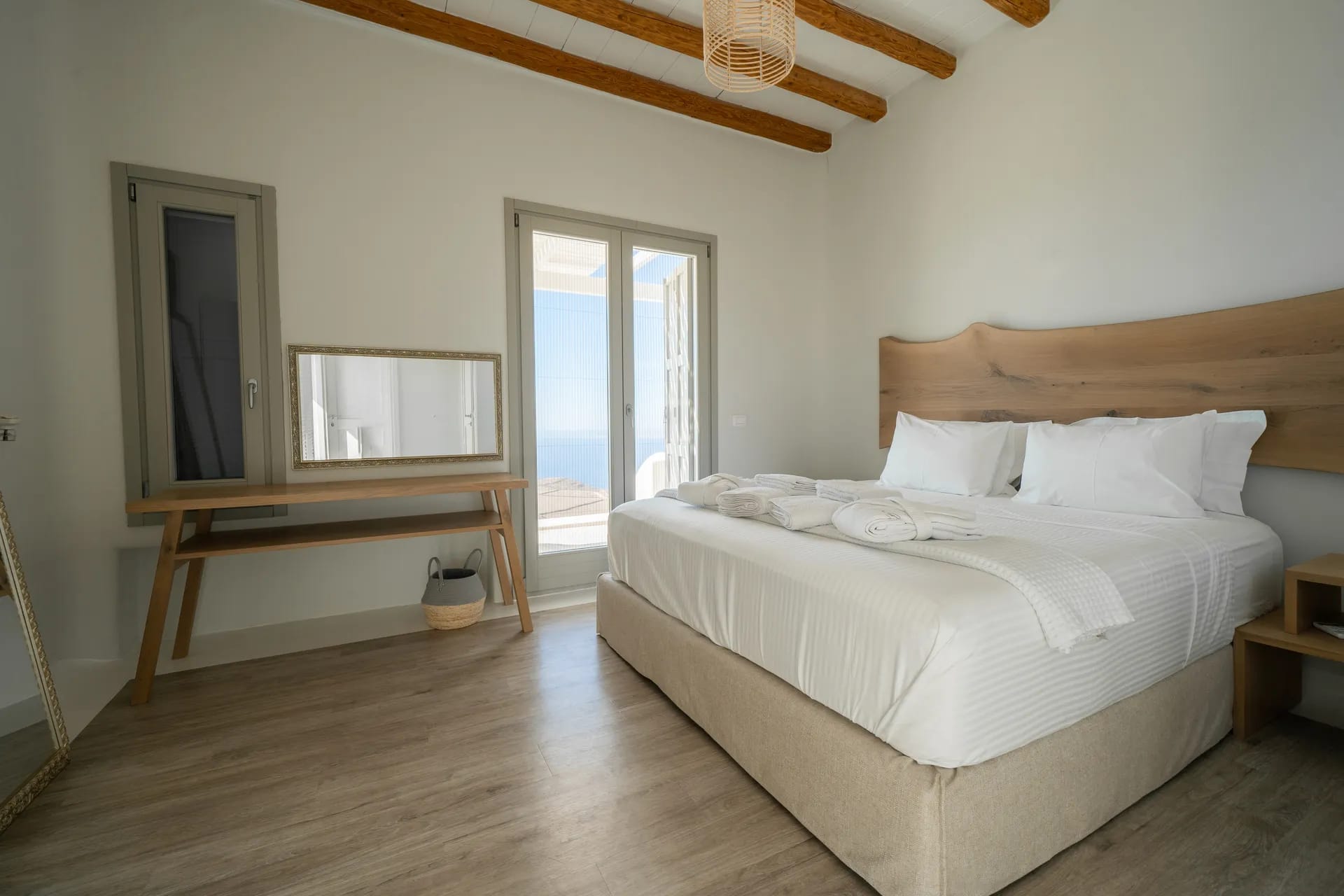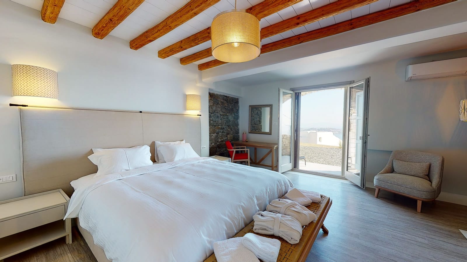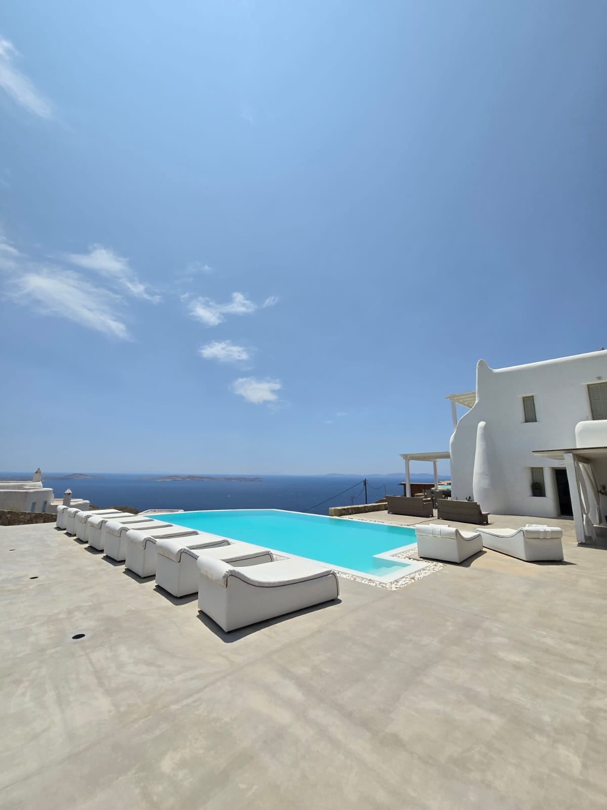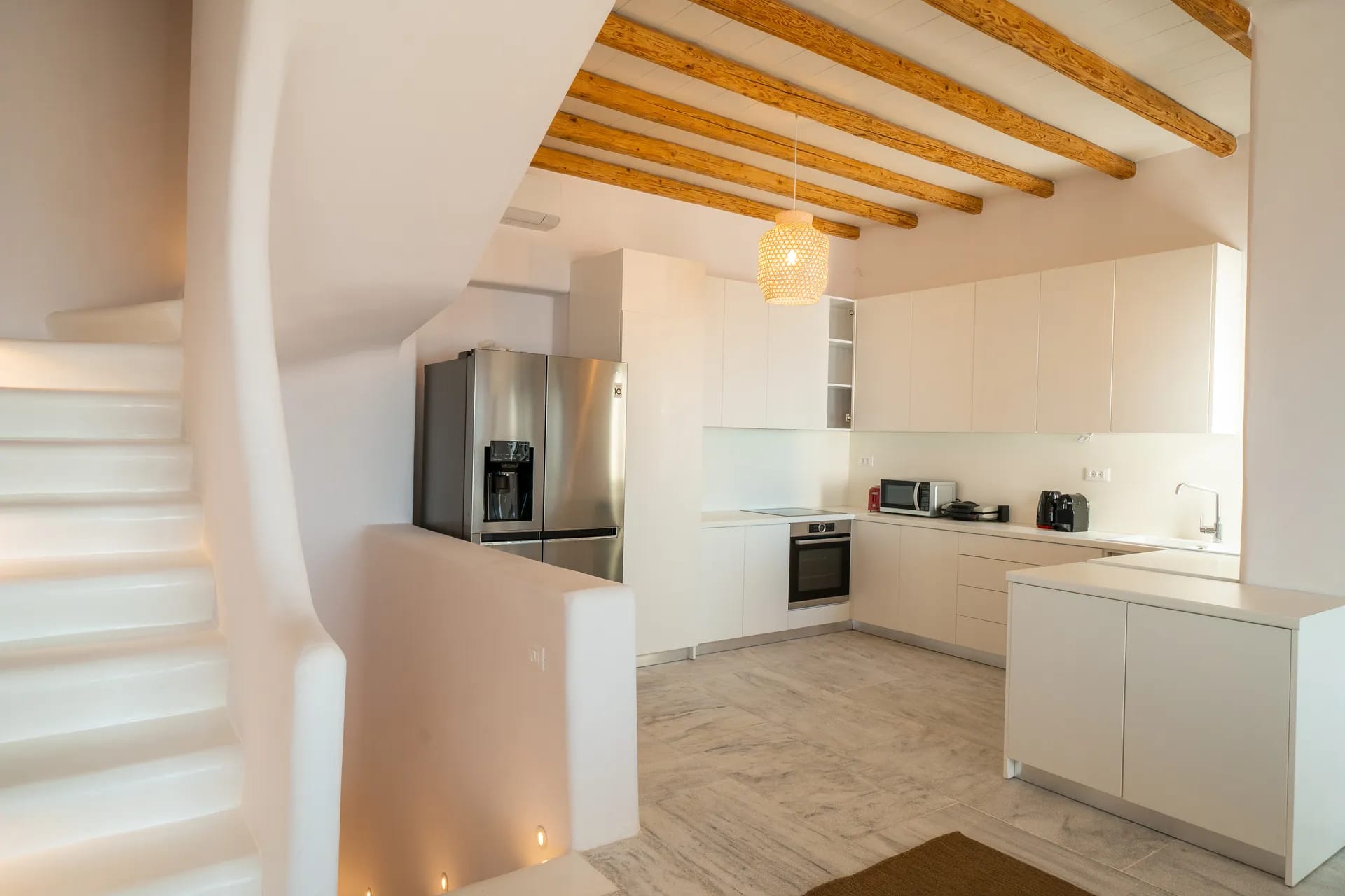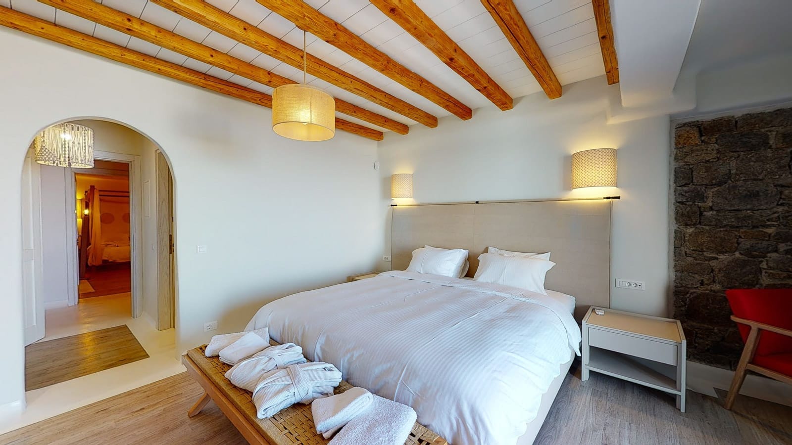 The property combines minimal Cycladic architecture with contemporary luxury, whitewashed lines, natural stone elements, and high-end furnishings, creating an elegant and serene atmosphere throughout.