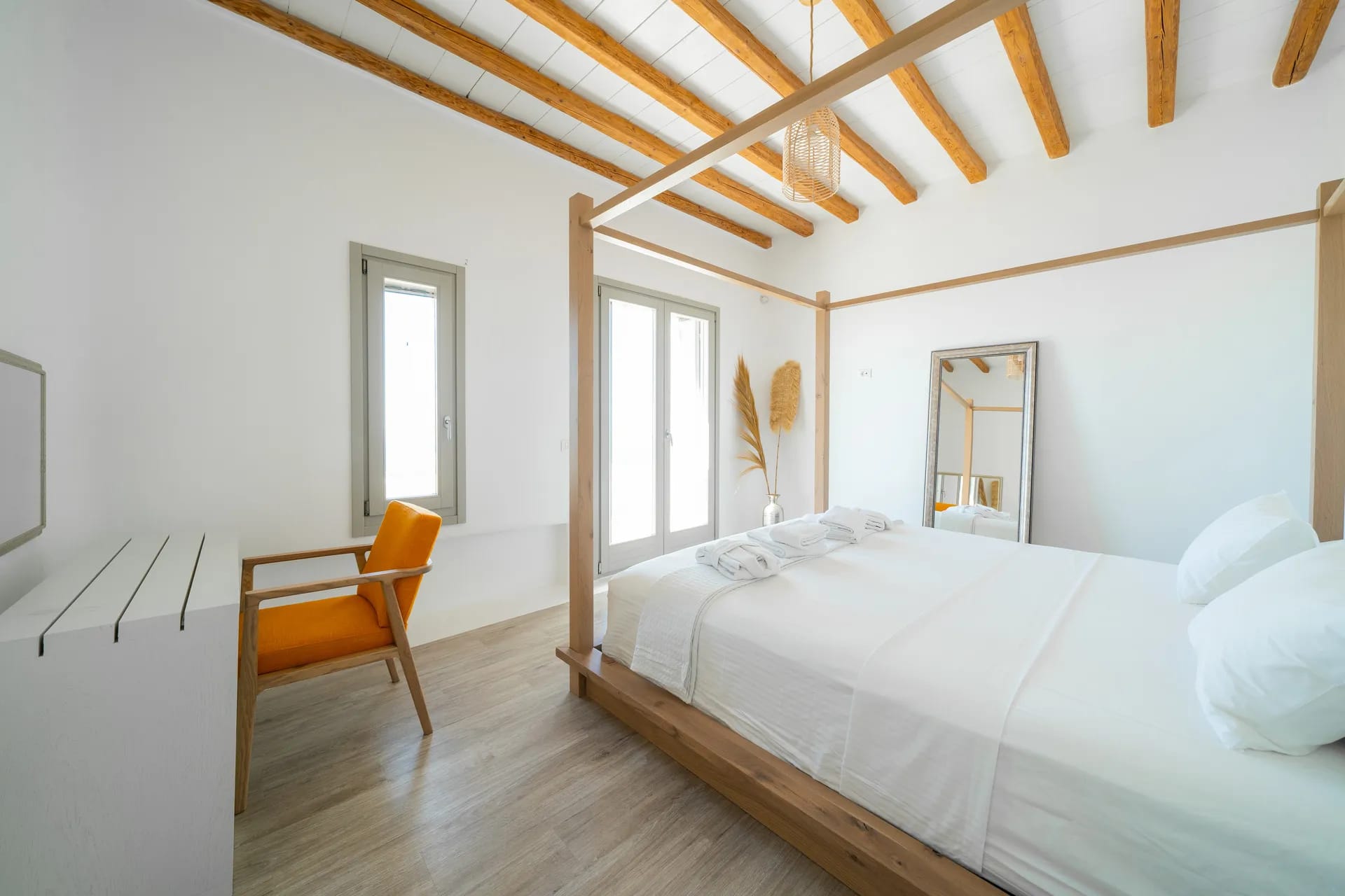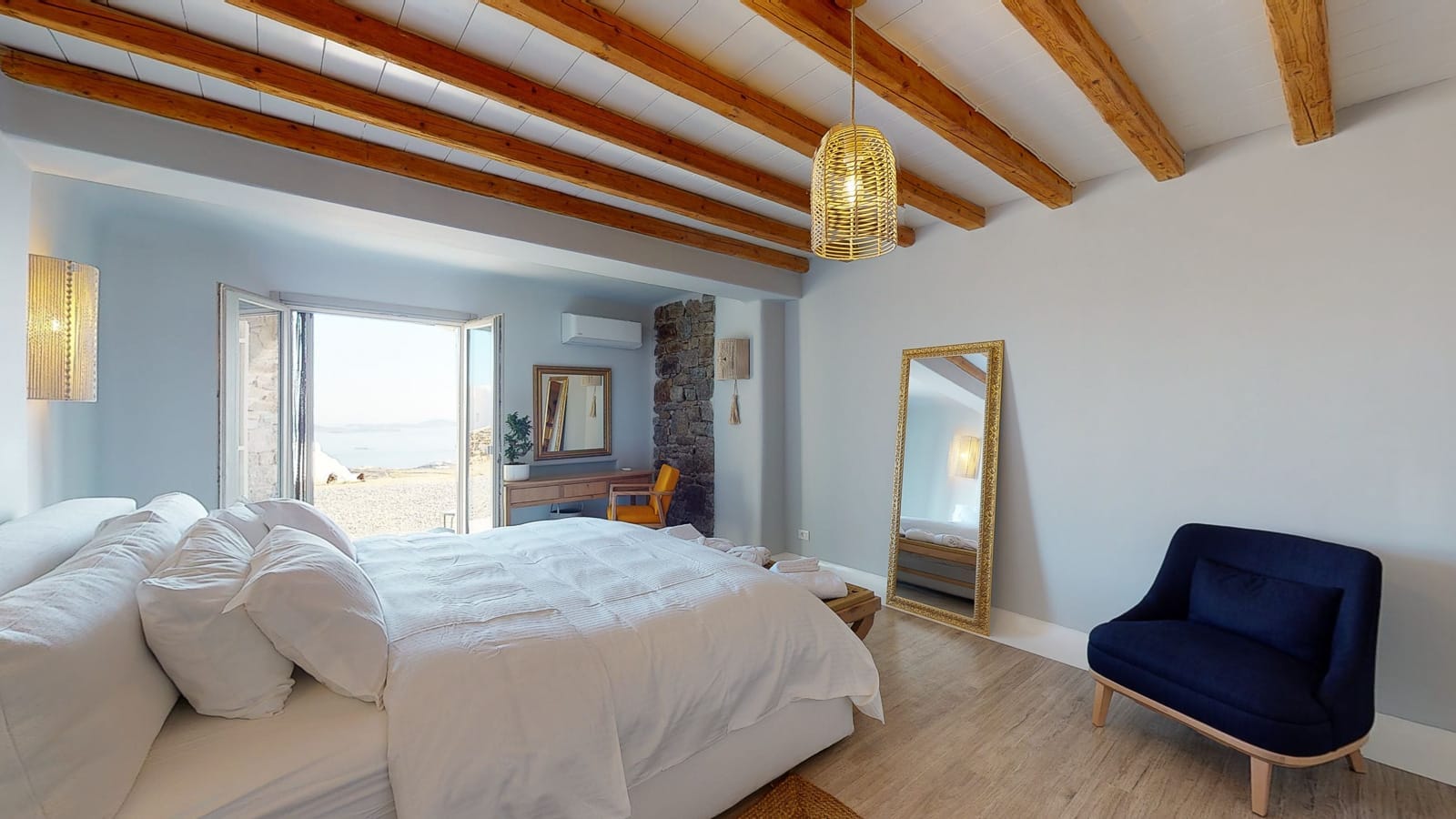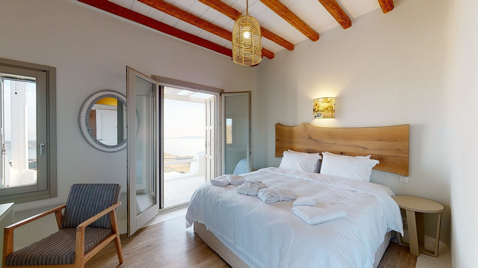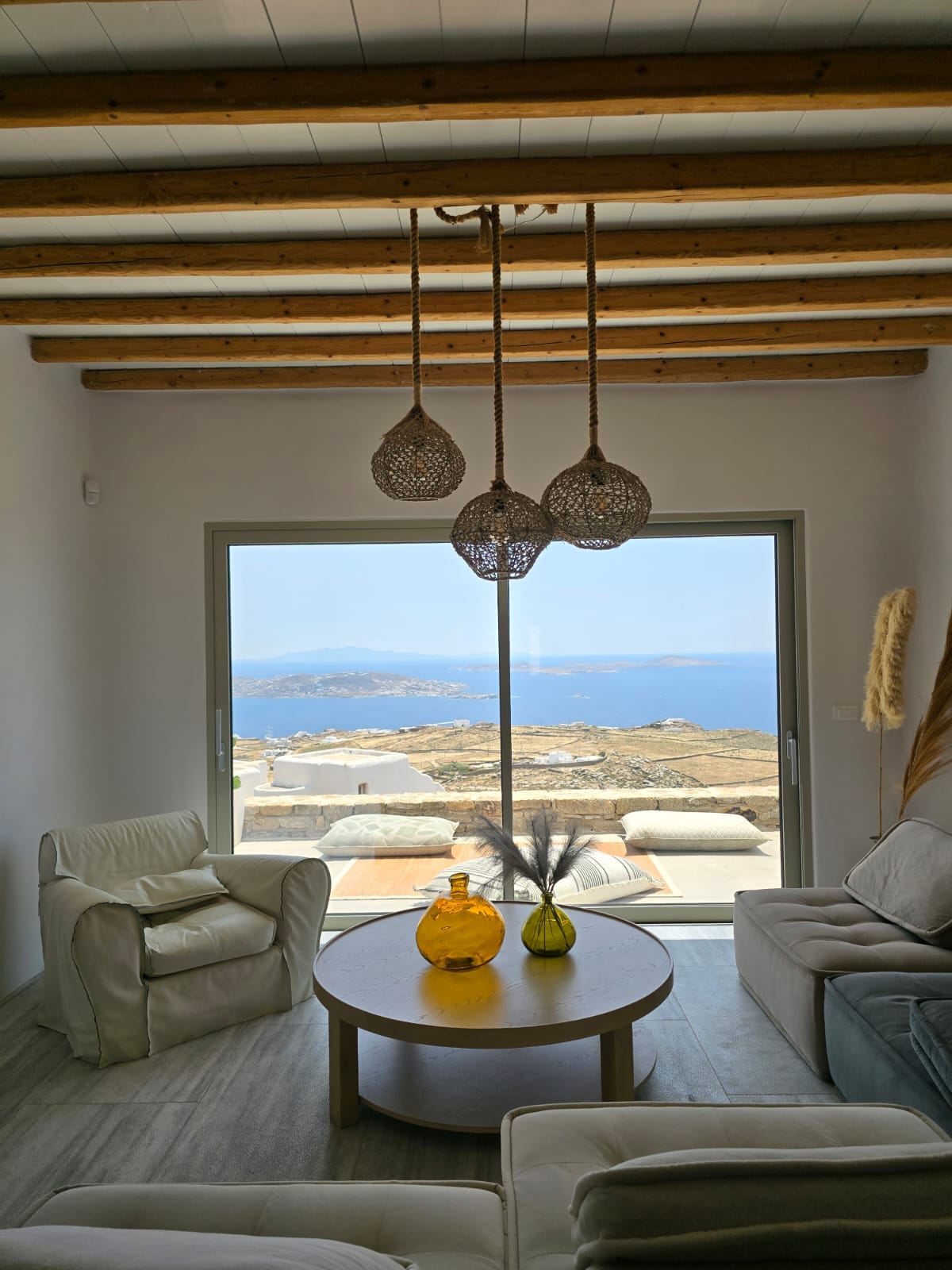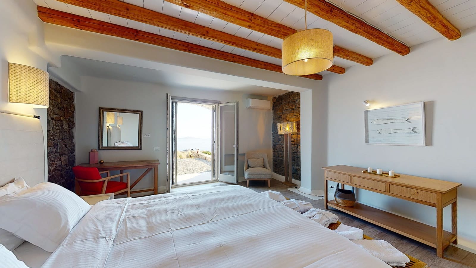 The property combines minimal Cycladic architecture with contemporary luxury, whitewashed lines, natural stone elements, and high-end furnishings, creating an elegant and serene atmosphere throughout.
