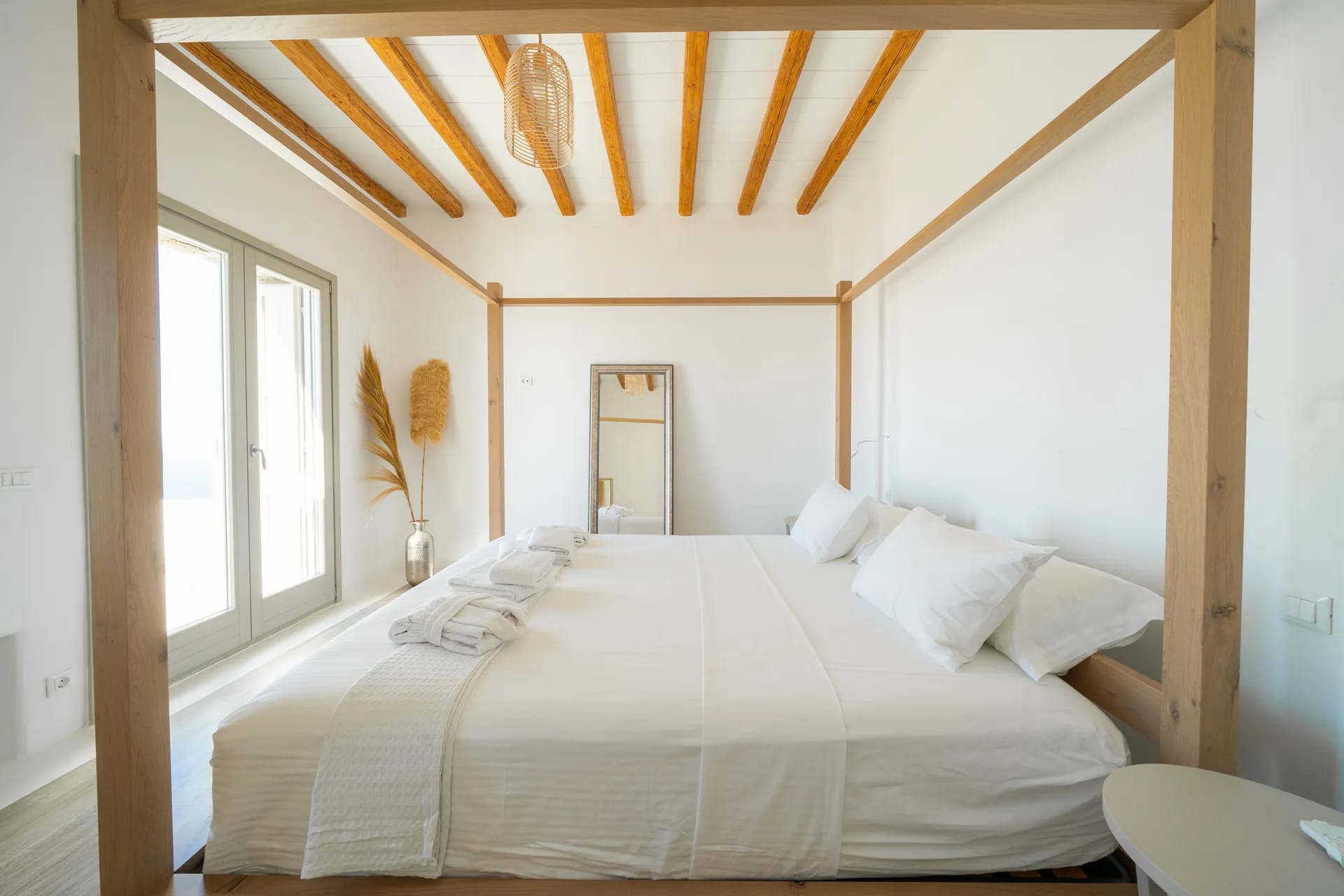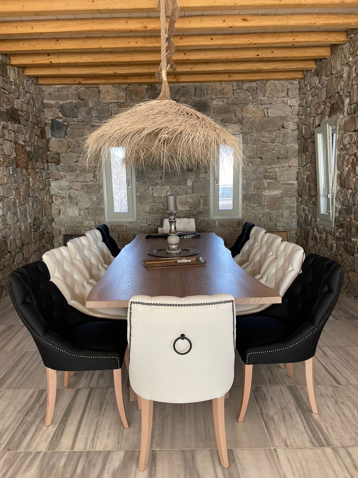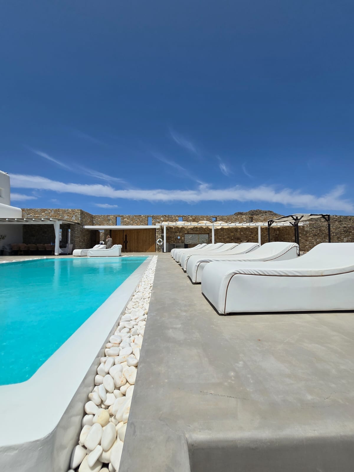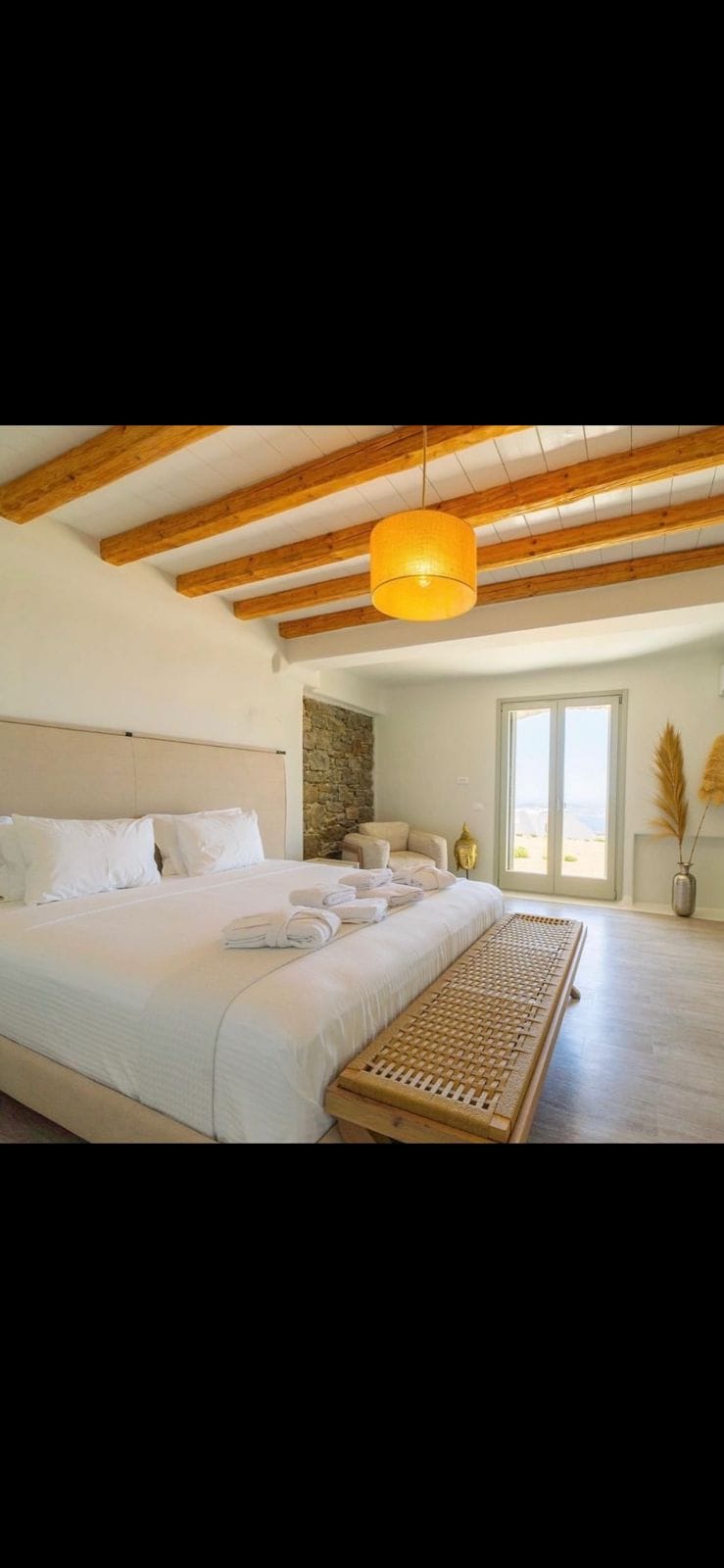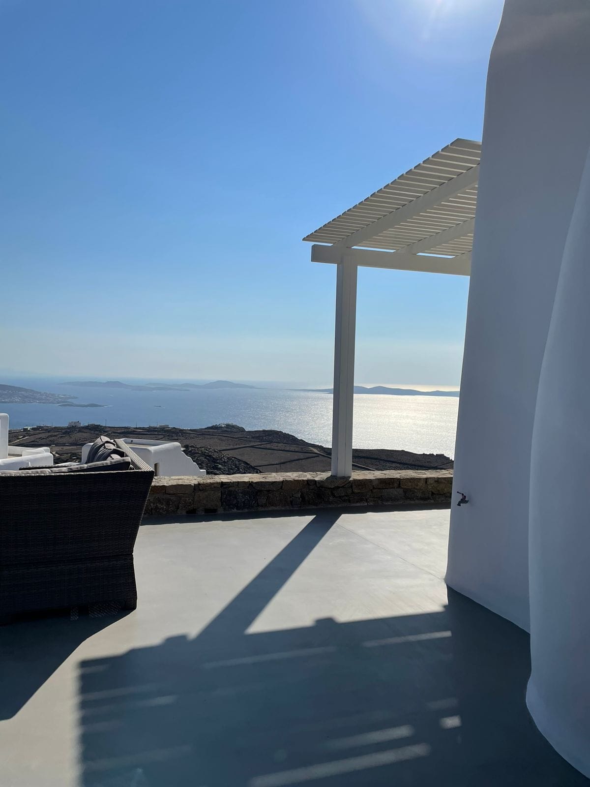 The property combines minimal Cycladic architecture with contemporary luxury, whitewashed lines, natural stone elements, and high-end furnishings, creating an elegant and serene atmosphere throughout.